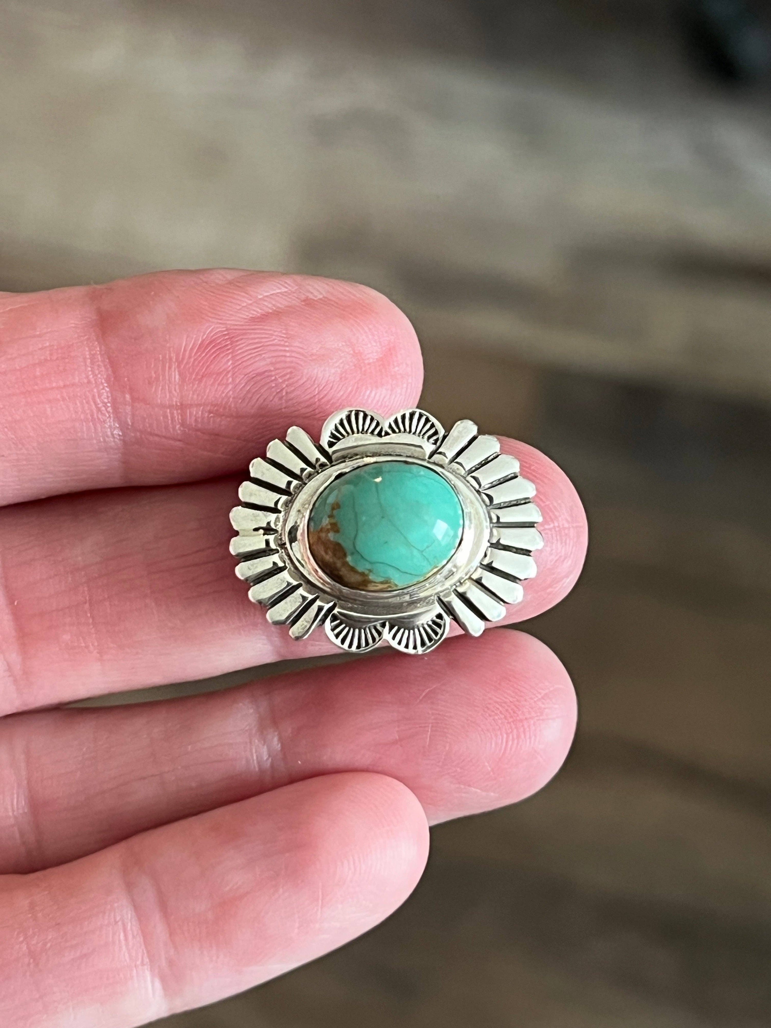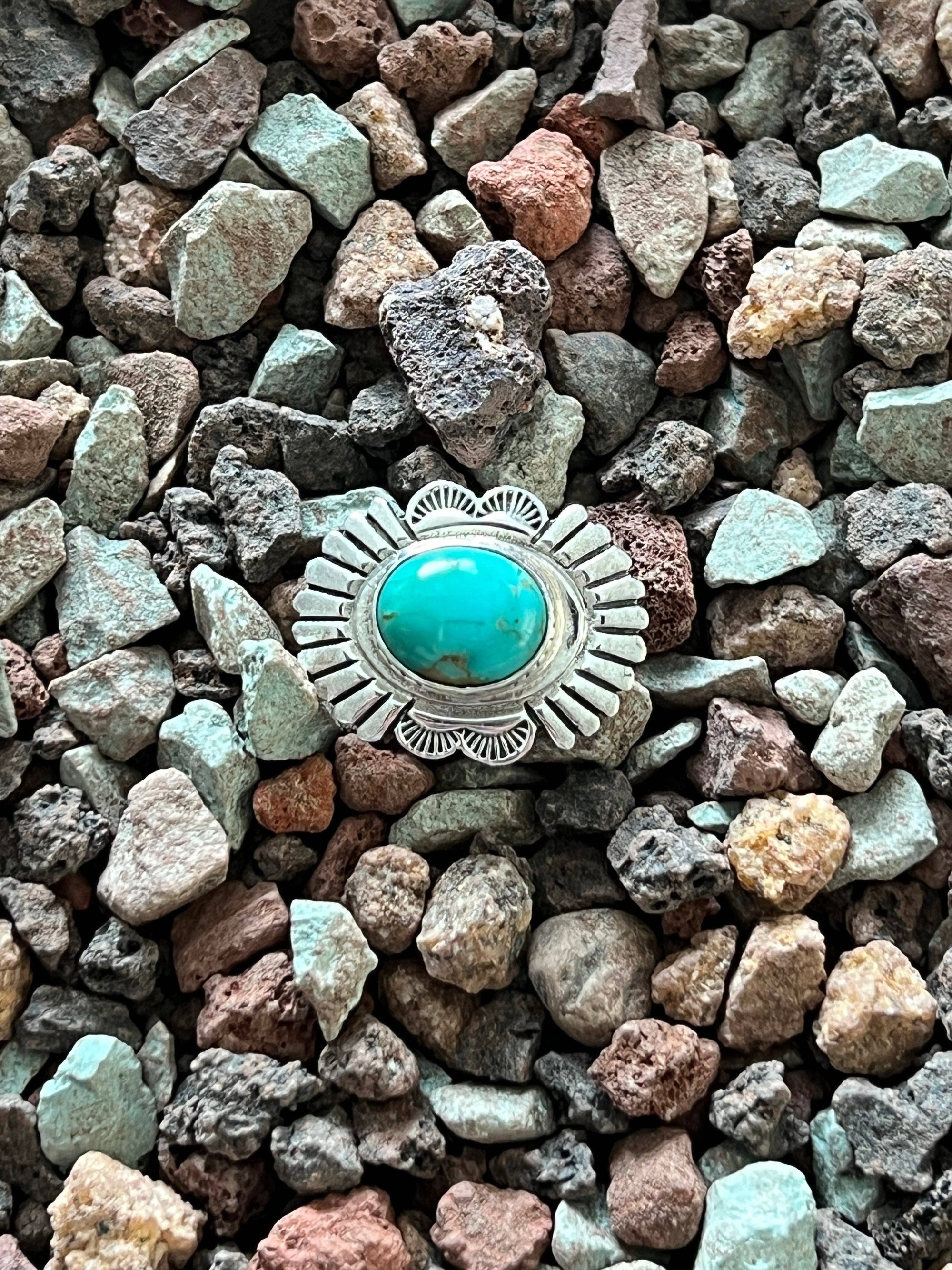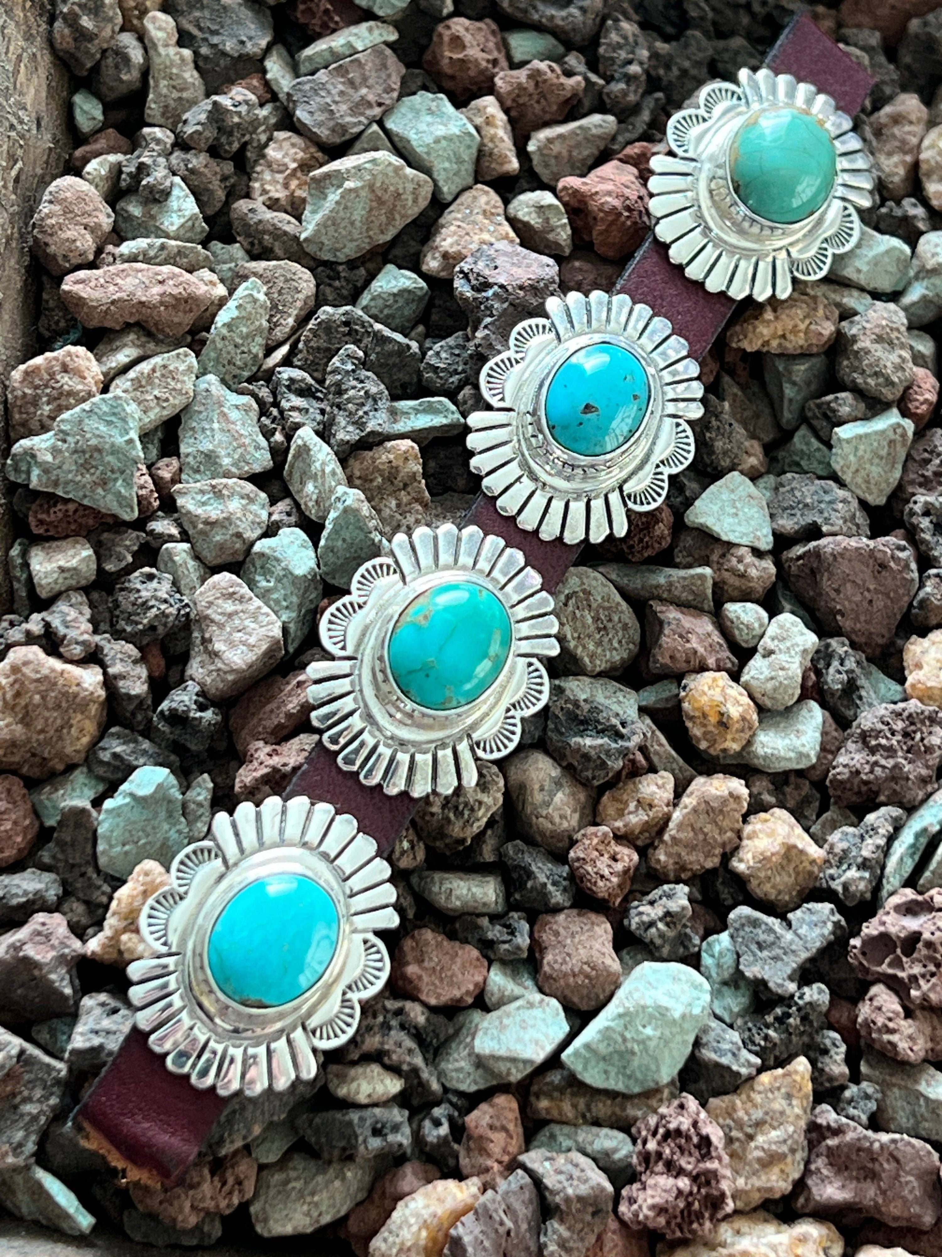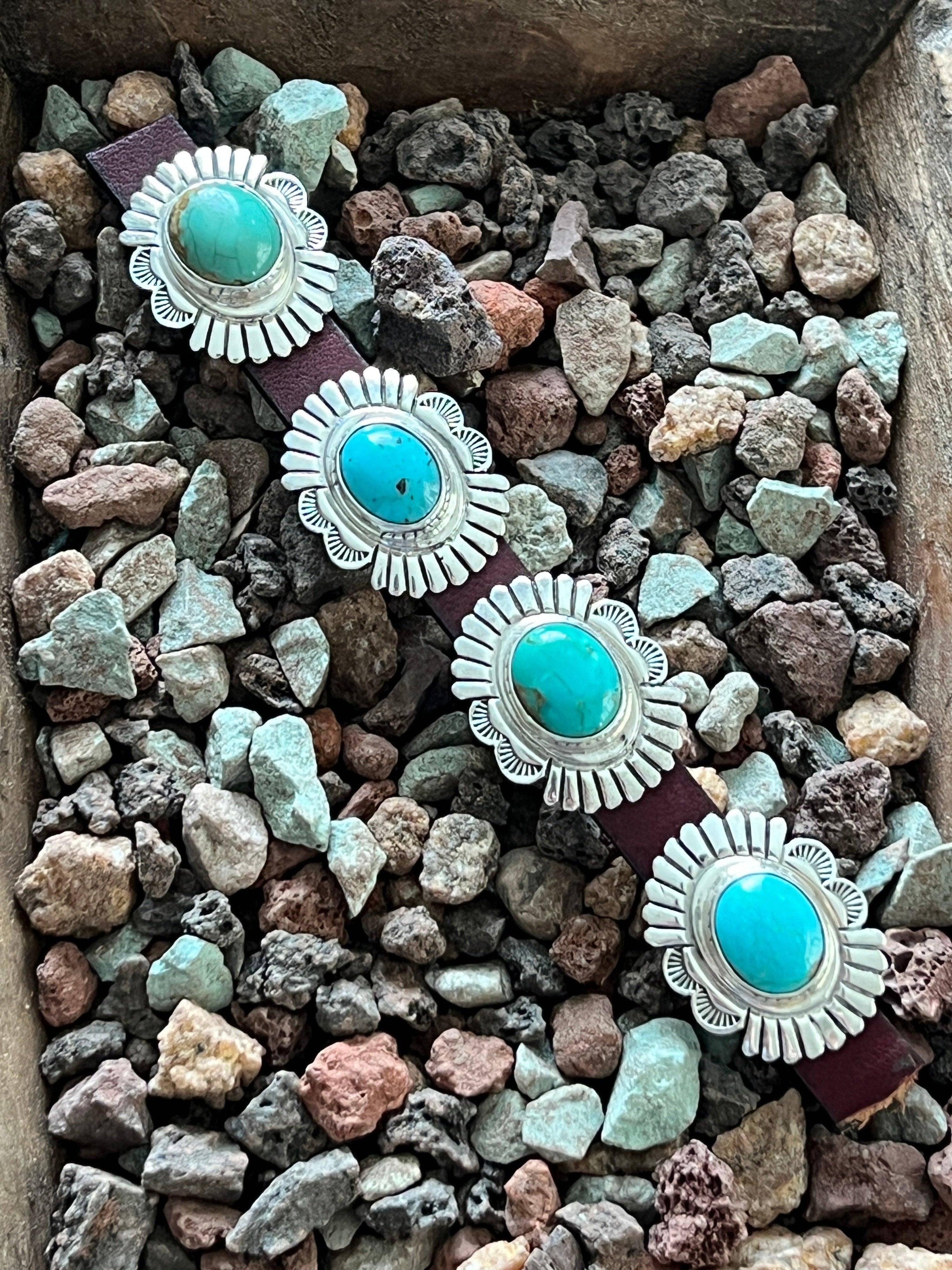 Bring bold Western luxury to your wrist with these stunning Sterling Silver Concho Slides, each set with a massive, high-grade Kingman turquoise stone. Every slide features hand-stamped concho detailing that frames the vibrant blue Kingman stones beautifully — a true statement piece for turquoise lovers.