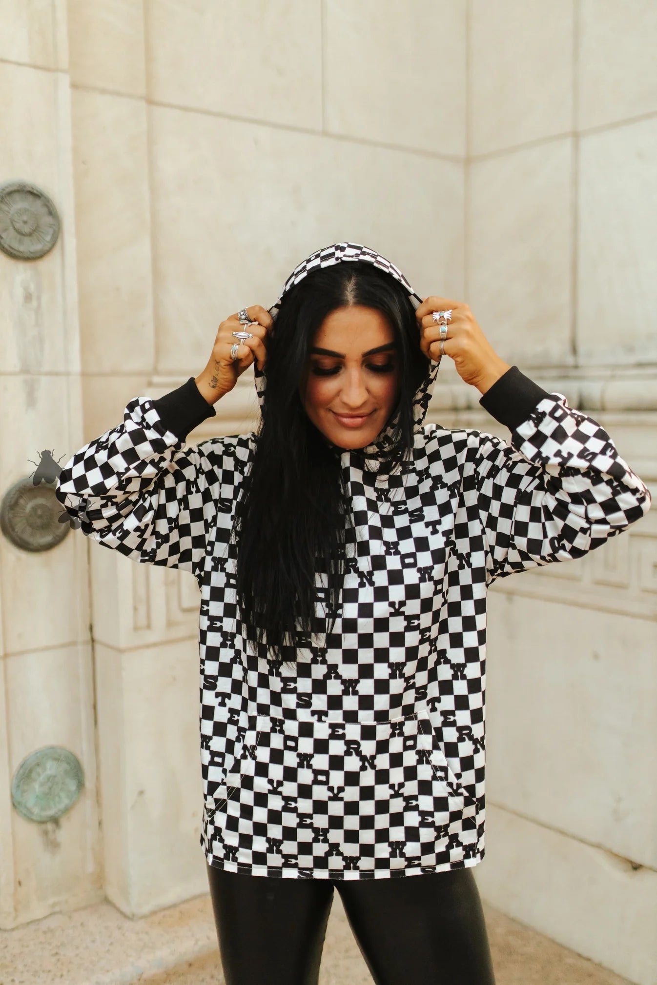 PEEP THE DEETS - this check pattern isn't just boxes... we hid words in there ;) lighter weight hoodie style perfect to transition into the colder months ahead... IN STYLE of course.