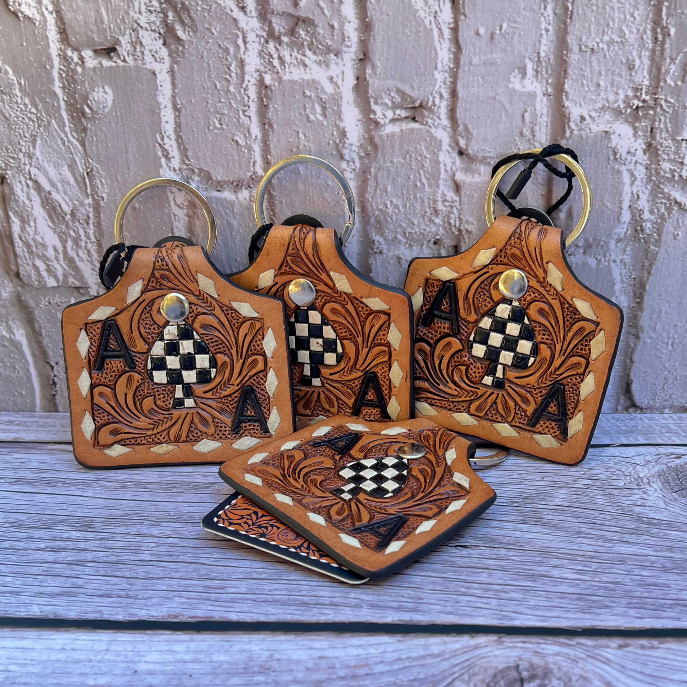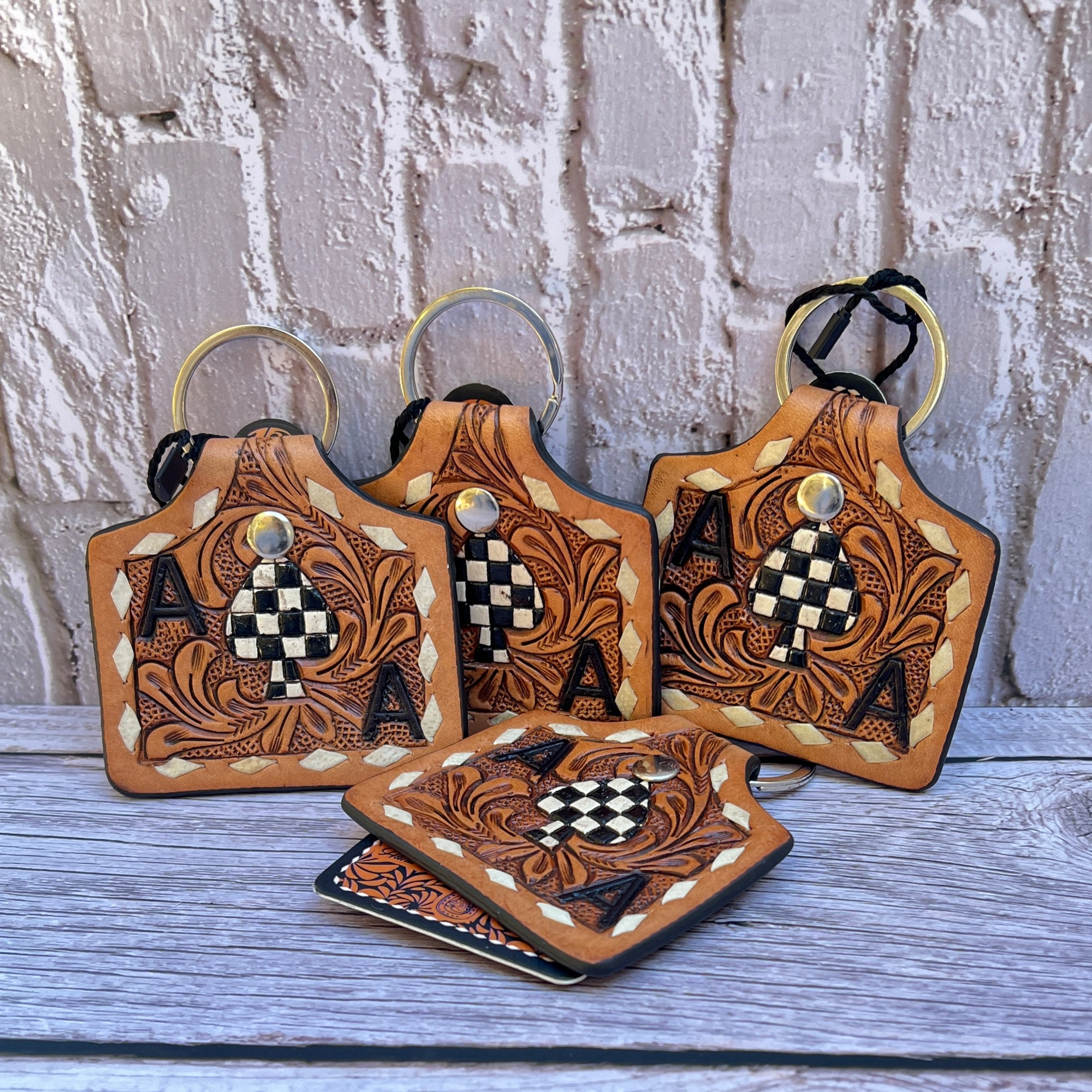 Crafted from premium leather, these keychains feature a bold Ace of Spades centerpiece in a punchy black-and-white checkerboard pattern, framed by detailed floral tooling and diamond-cut edges. The natural leather tones contrast perfectly with the deep black accents, giving every piece that high-end Western edge your keys deserve.