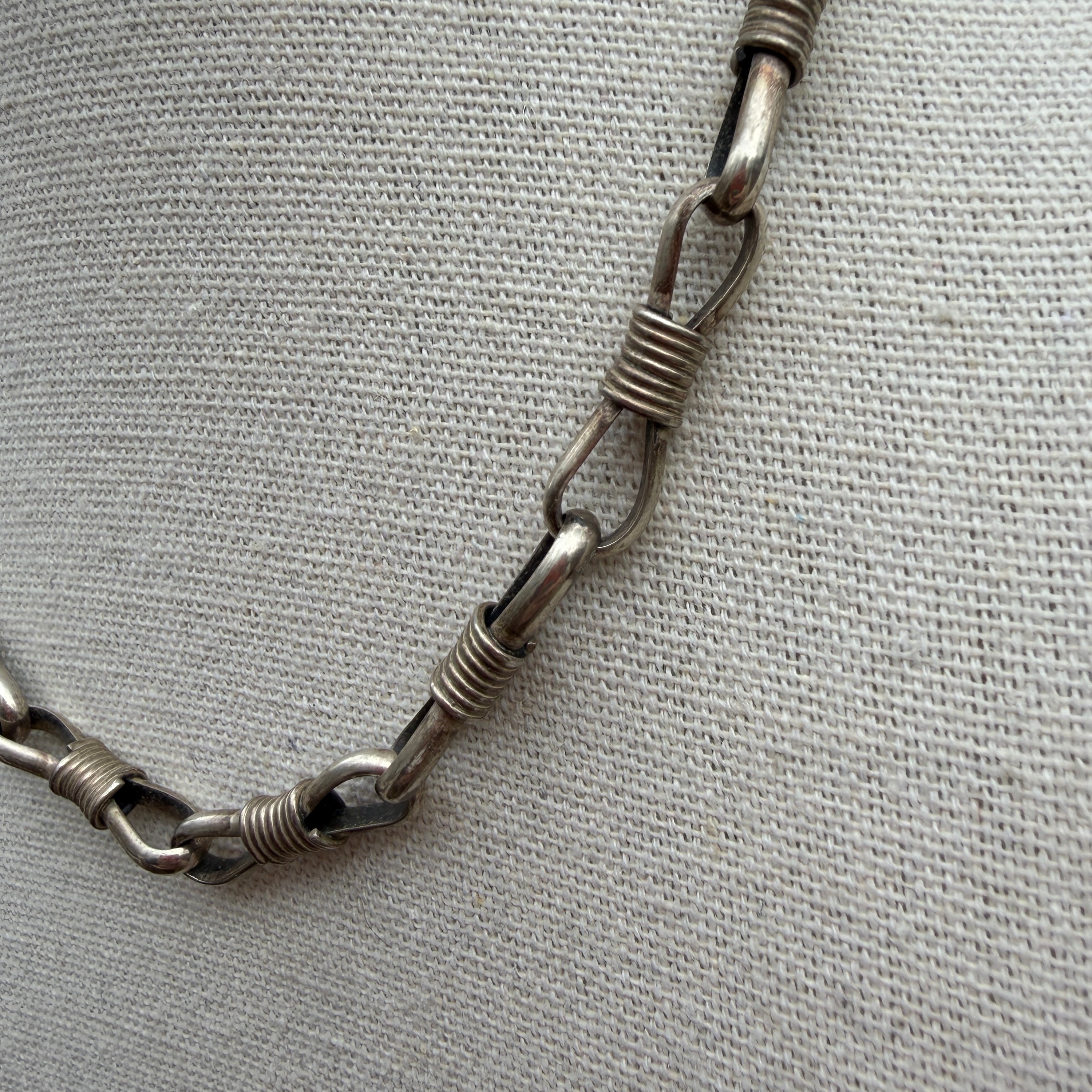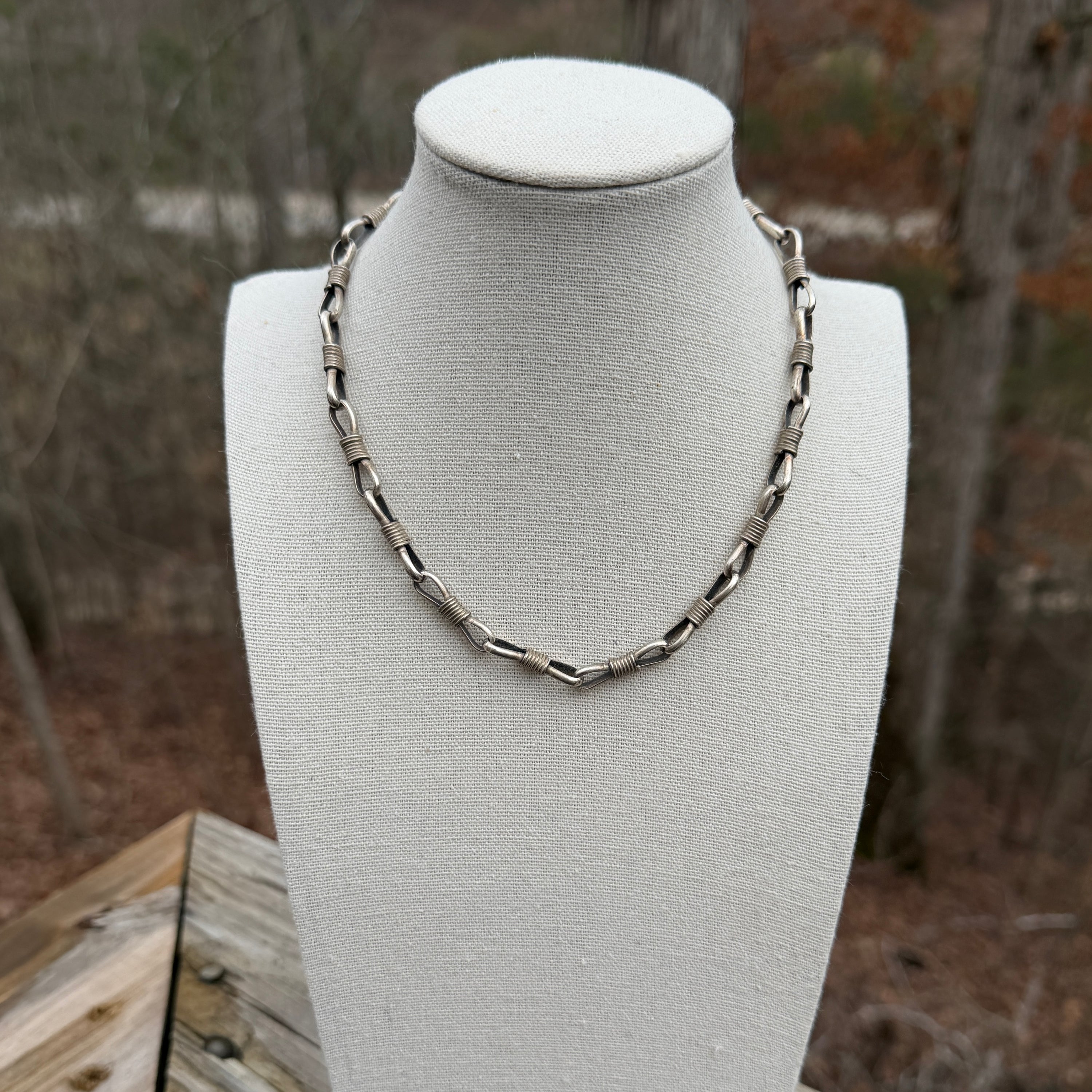 This handmade sterling silver chain features individually crafted wrapped links that bring just the right amount of edge while keeping it classic enough for everyday wear. Each link measures approximately 7/8” long, tapering from 7mm at its widest point down to 4.5mm at the wrapped detail, creating depth, texture, and serious presence around the neck.