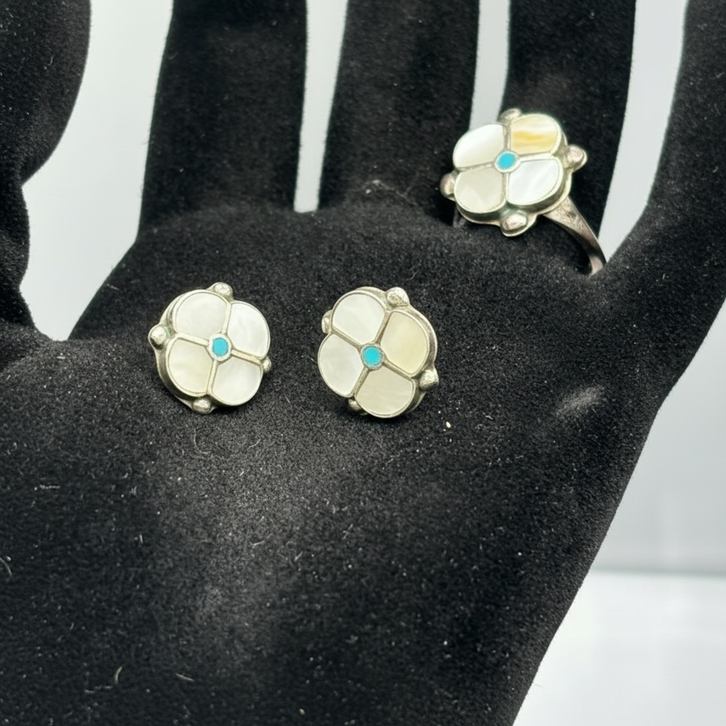 **COLLECTION PIECE**Vintage Zuni Inlay Flower Jewelry Set Sterling Silver · Mother of Pearl & Turquoise · c. 1970s