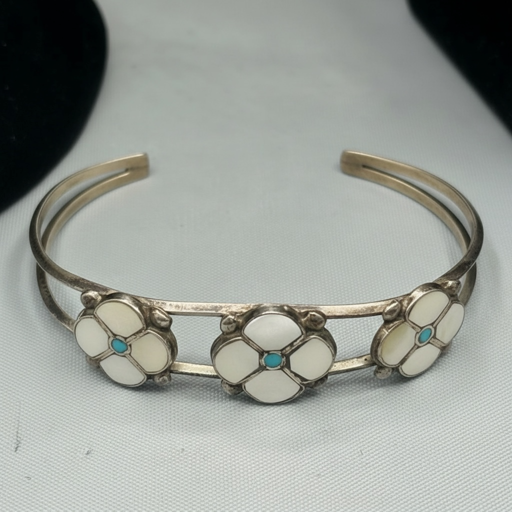 The necklace features five hand-inlaid silver flowers, each meticulously set with luminous mother of pearl and vibrant turquoise. The floral theme continues seamlessly throughout the set. The earrings echo the same inlay work in petite form, the ring centers a single floral motif, and the bracelet showcases three inlaid flowers, finished with delicate silver raindrop accents that add texture and movement without overpowering the design.