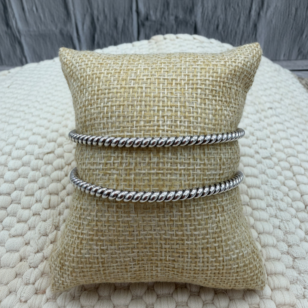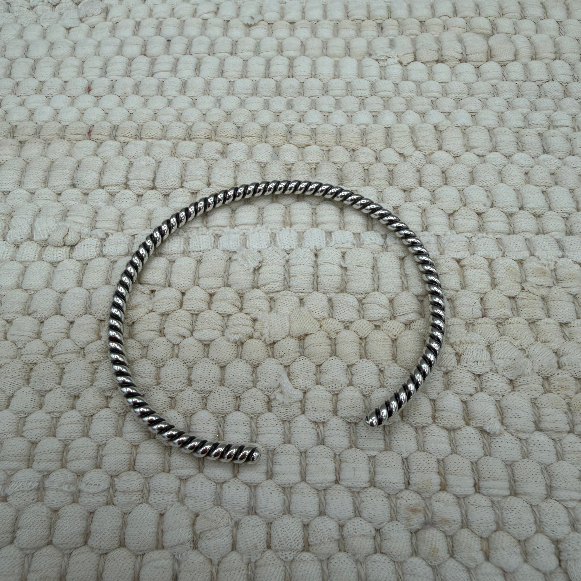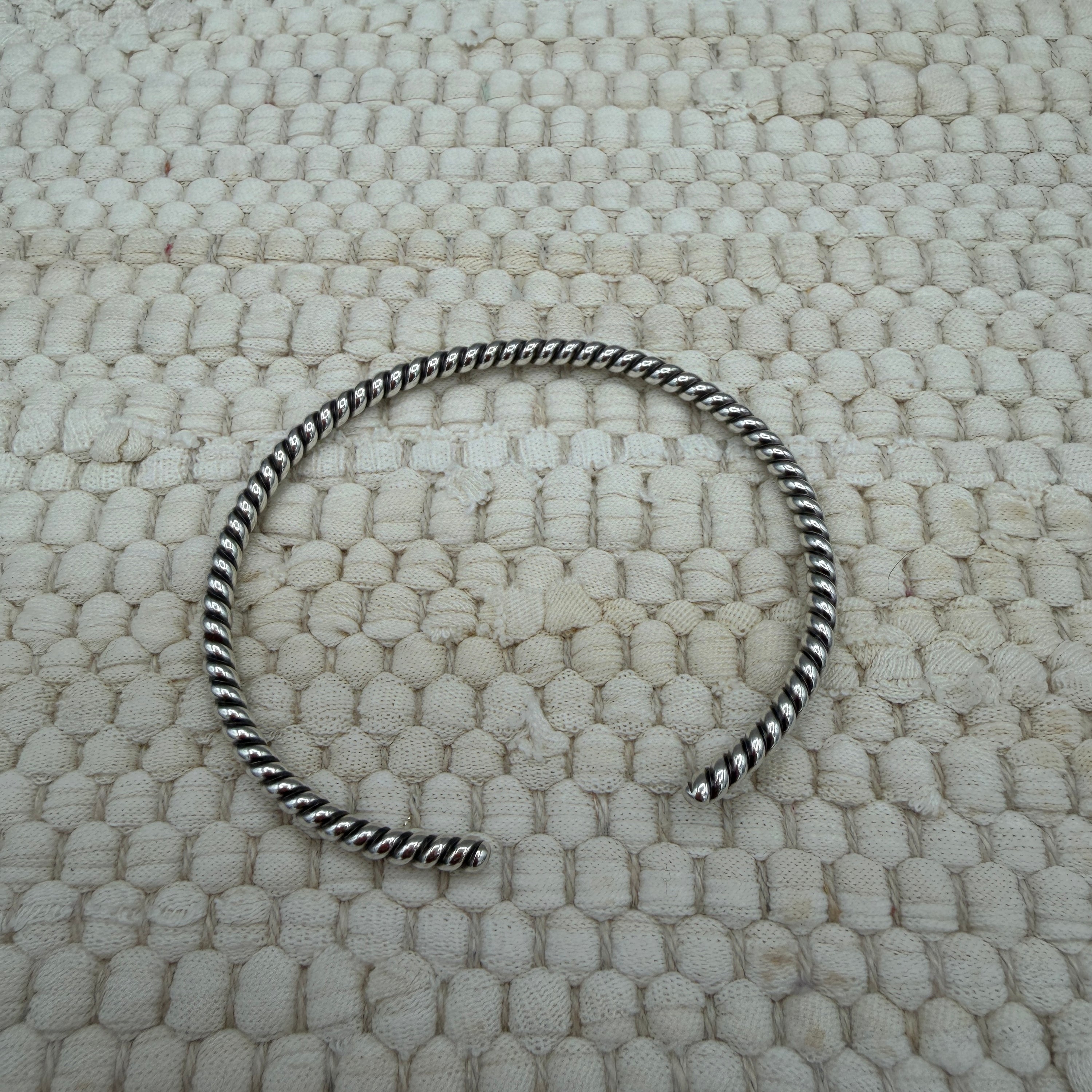 This sterling silver twist wire cuff features a clean rope-style design with a beautiful polished finish that catches the light just right. Lightweight but sturdy, it has a mid-level flex that allows for a comfortable fit while still holding its shape.