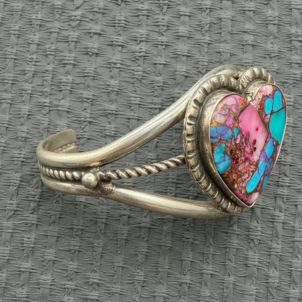 At the center sits a heart-shaped Purple Mohave Turquoise stone, flashing pinks, purples, blues, and that signature bronze matrix that makes Mohave so addictive. It’s framed in hand-worked sterling with a structured split-shank cuff that gives the piece strength, balance, and that unmistakable “this was made by someone who knows exactly what they’re doing” energy.