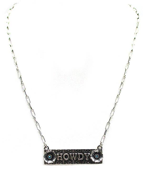 Keep it cute and cowboy-chic with the Western Howdy Flower Bar Necklace — a little Southern charm with a whole lot of sass. This silver-tone bar pendant is engraved with HOWDY and framed by two turquoise-accented flowers, giving it that classic Western flair with a feminine edge.