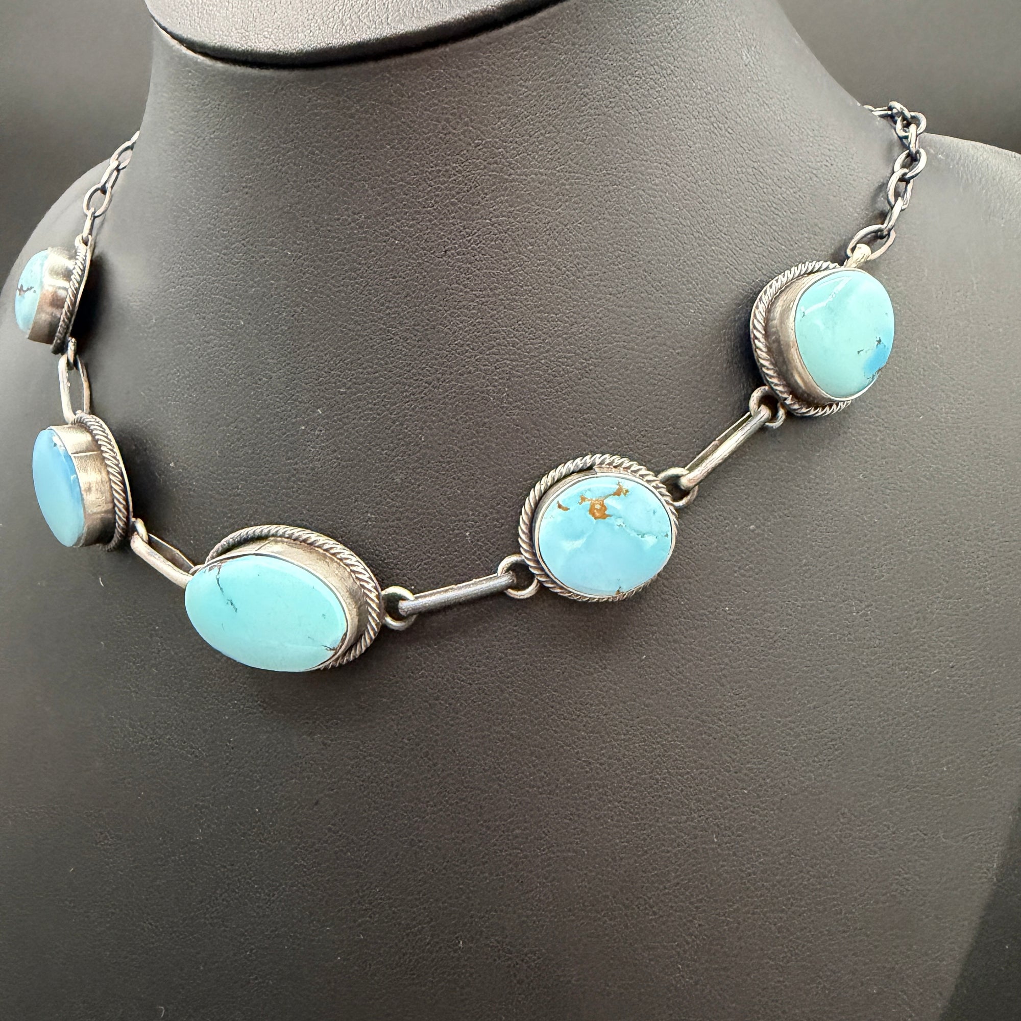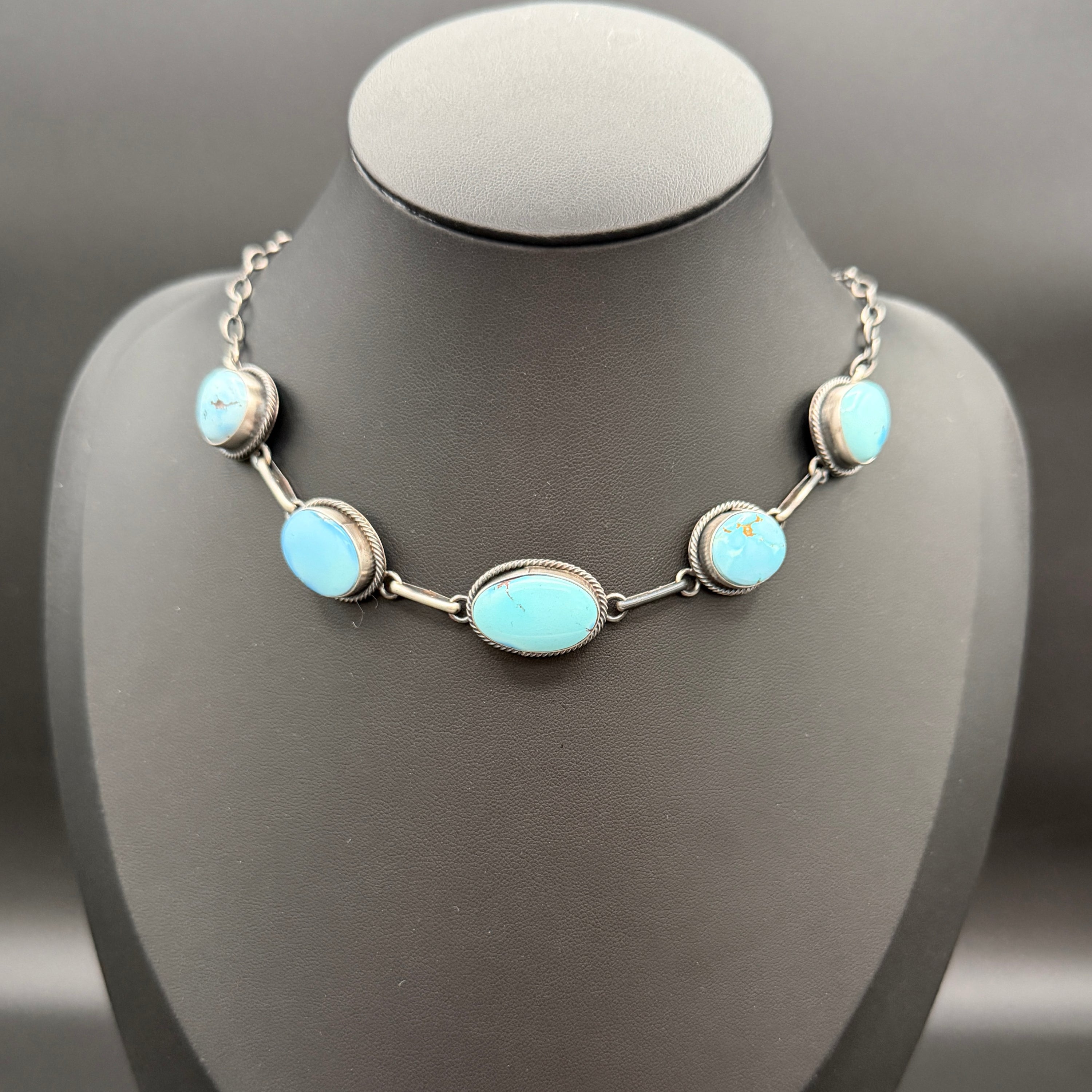 Bold, clean, and straight-up classic. This chunky Golden Hills turquoise choker by Scott Skeets features beautifully matched soft-blue stones set in hand-crafted sterling silver bezels, linked together for a strong, balanced silhouette that sits perfectly at the collarbone.