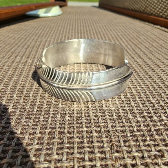 This piece has a strong, substantial feel on the wrist and showcases the timeless feather motif often associated with Navajo silversmithing. The silver has developed a soft natural patina that highlights the hand-worked texture. Signed on the interior.