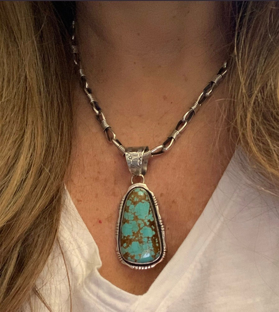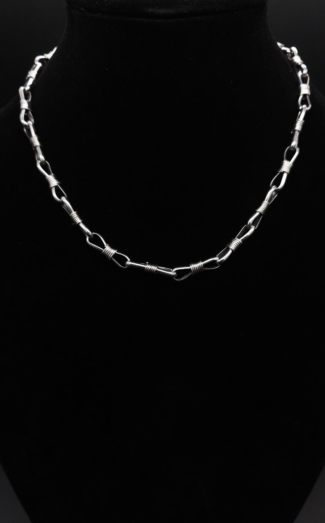 This handmade sterling silver chain features individually crafted wrapped links that bring just the right amount of edge while keeping it classic enough for everyday wear. Each link measures approximately 7/8” long, tapering from 7mm at its widest point down to 4.5mm at the wrapped detail, creating depth, texture, and serious presence around the neck.