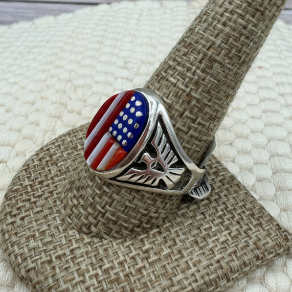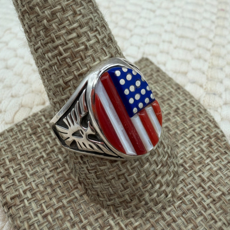 Beautiful sterling silver ring is done in the corn row inlay style. The ring is inlaid with lapis, coral and white shell to create the US Flag.