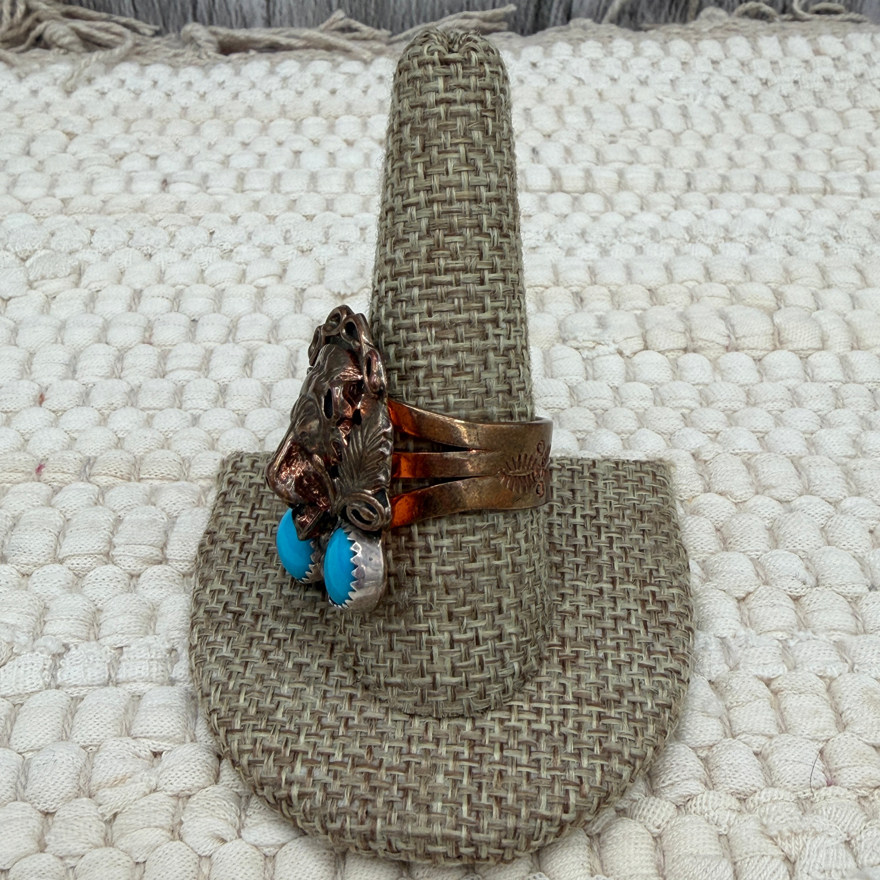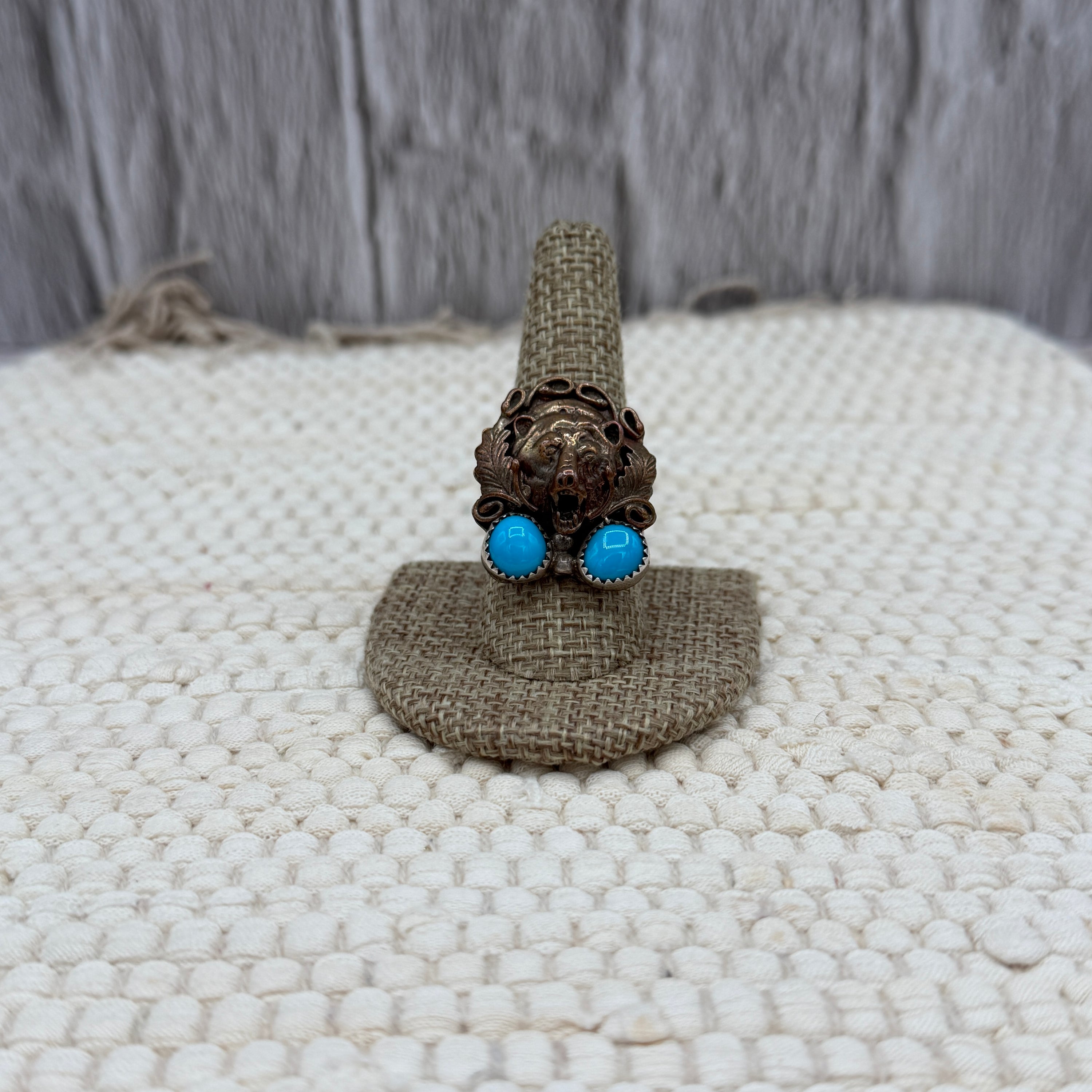 Set beneath the bear are two vibrant turquoise cabochons, each framed in serrated bezels for that classic Native aesthetic. The bright blue stones pop hard against the rich copper tones, making this ring an instant focal point whether you’re stacking it up or letting it run solo.