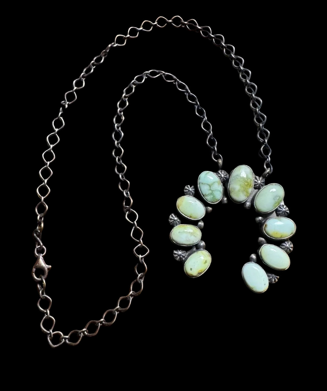 The pendant measures 2 ¾”, built in a strong crescent cluster design with individually set oval stones framed in sterling. Between each stone, you’ll see classic concho-style accents that give it that timeless Navajo presence. Oxidized silver brings depth and contrast so the stones glow instead of just sitting there.
