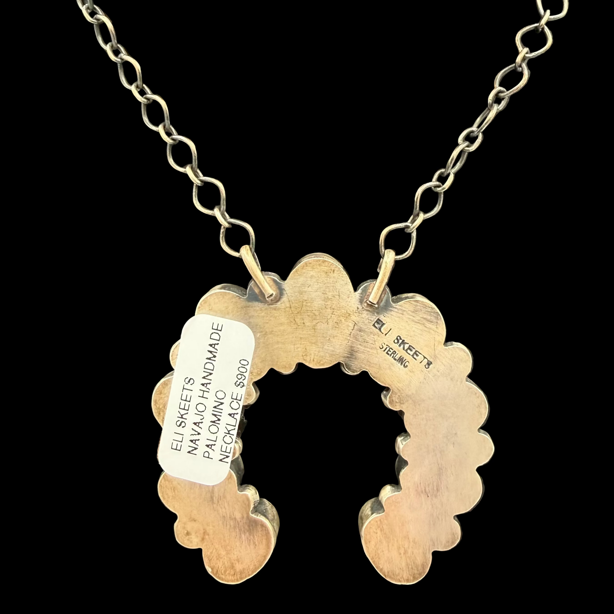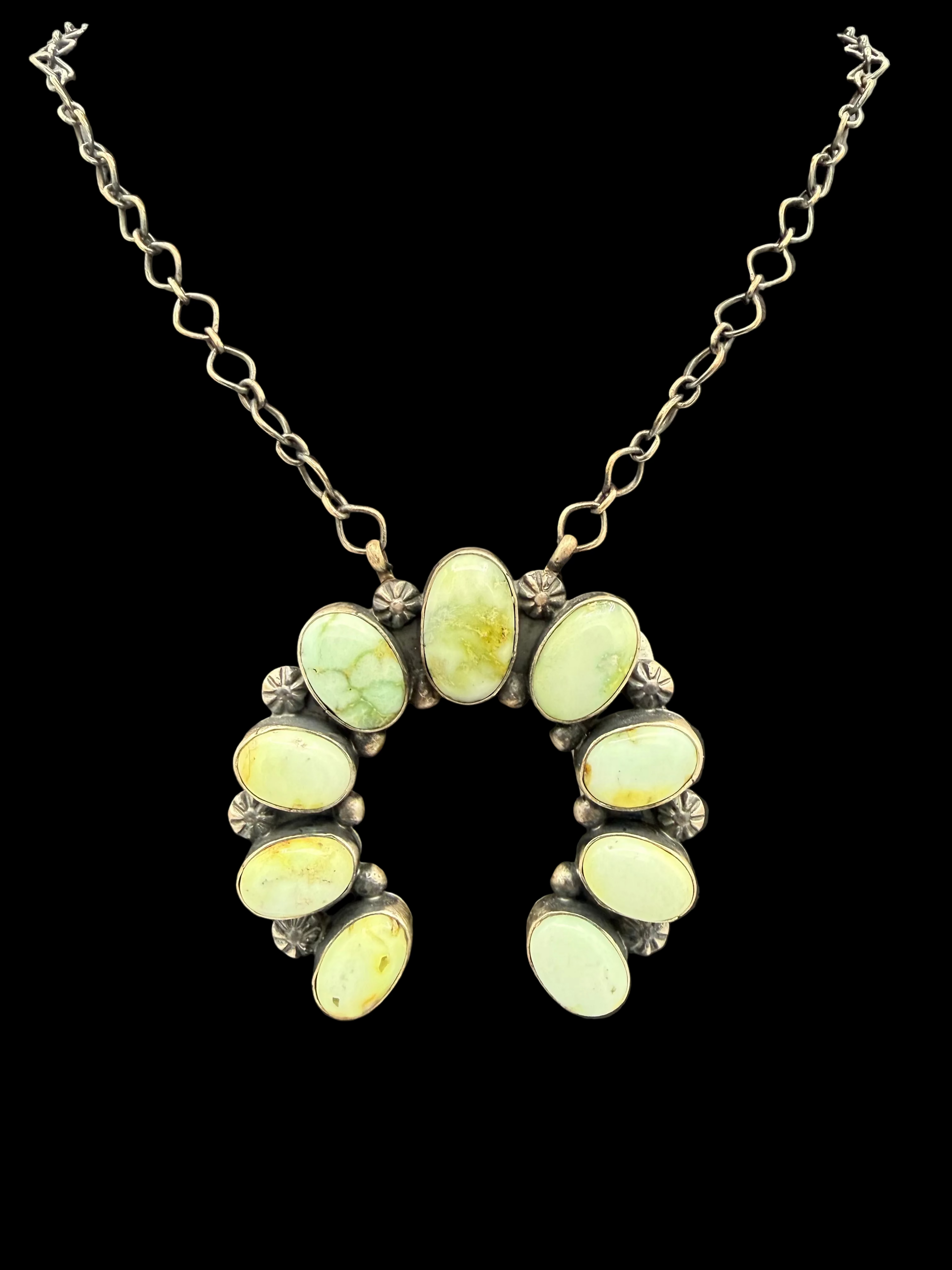 Handcrafted by Eli Skeets, this Palomino necklace features that unmistakable soft, high-desert green turquoise that collectors chase. That dreamy pale celadon tone with hints of buttery warmth and natural veining that feels organic and alive. No two stones ever match exactly, and that’s the whole point.