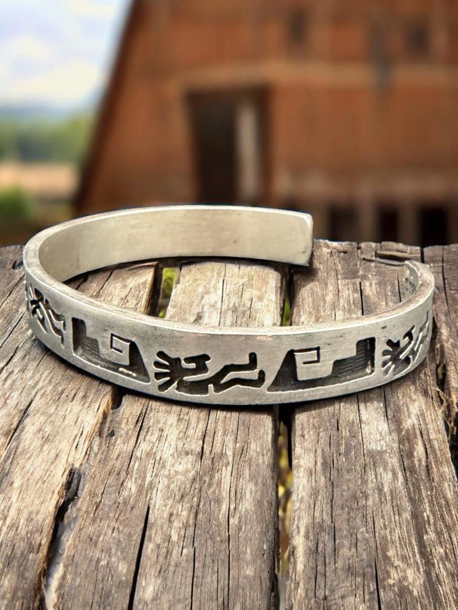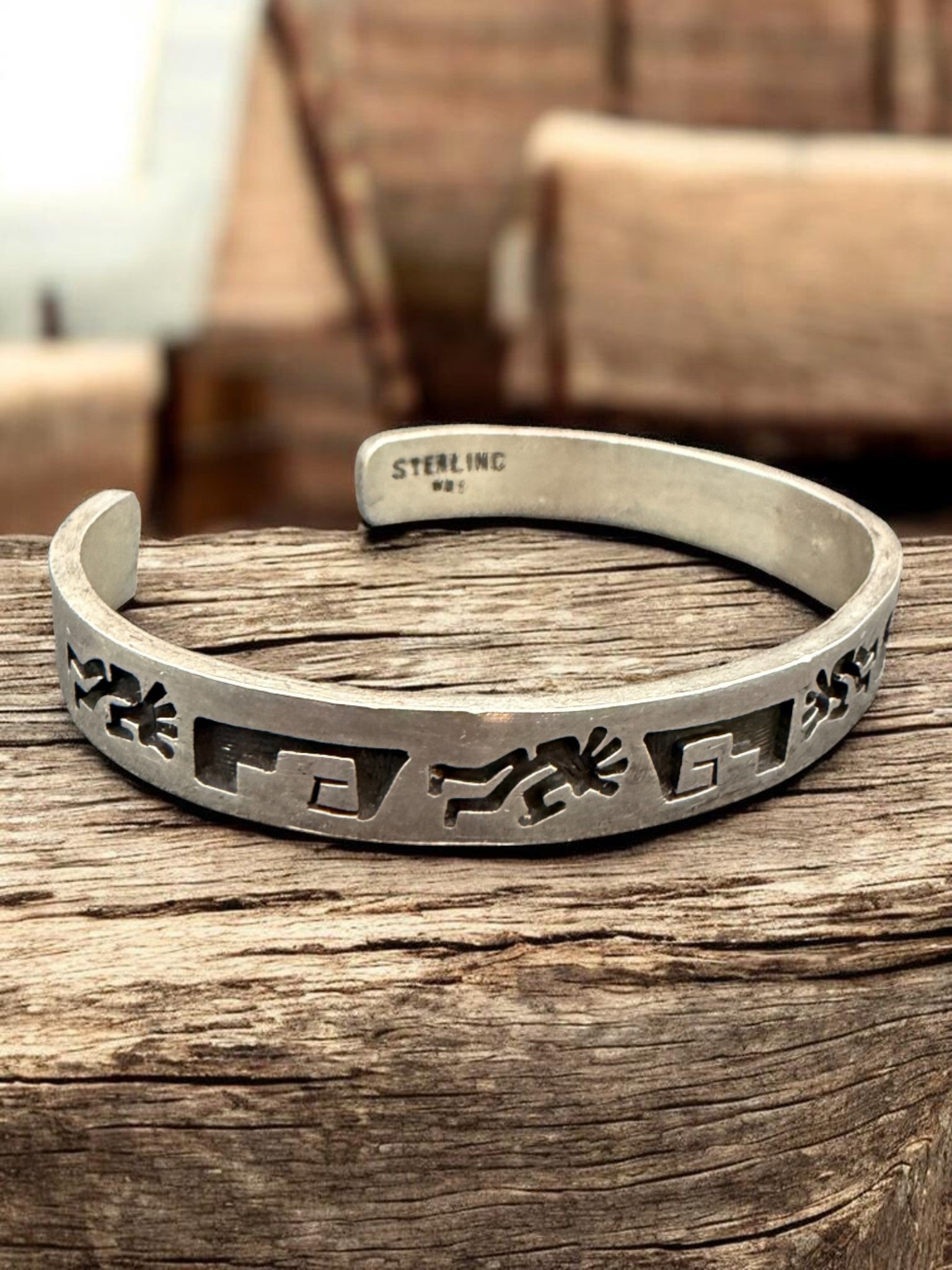 The Kokopelli figures dance across the band with clean, sharp lines, and the 5/16" width makes it substantial without feeling bulky. It layers beautifully with Navajo pearls, leather cuffs, or stands confidently all on its own.