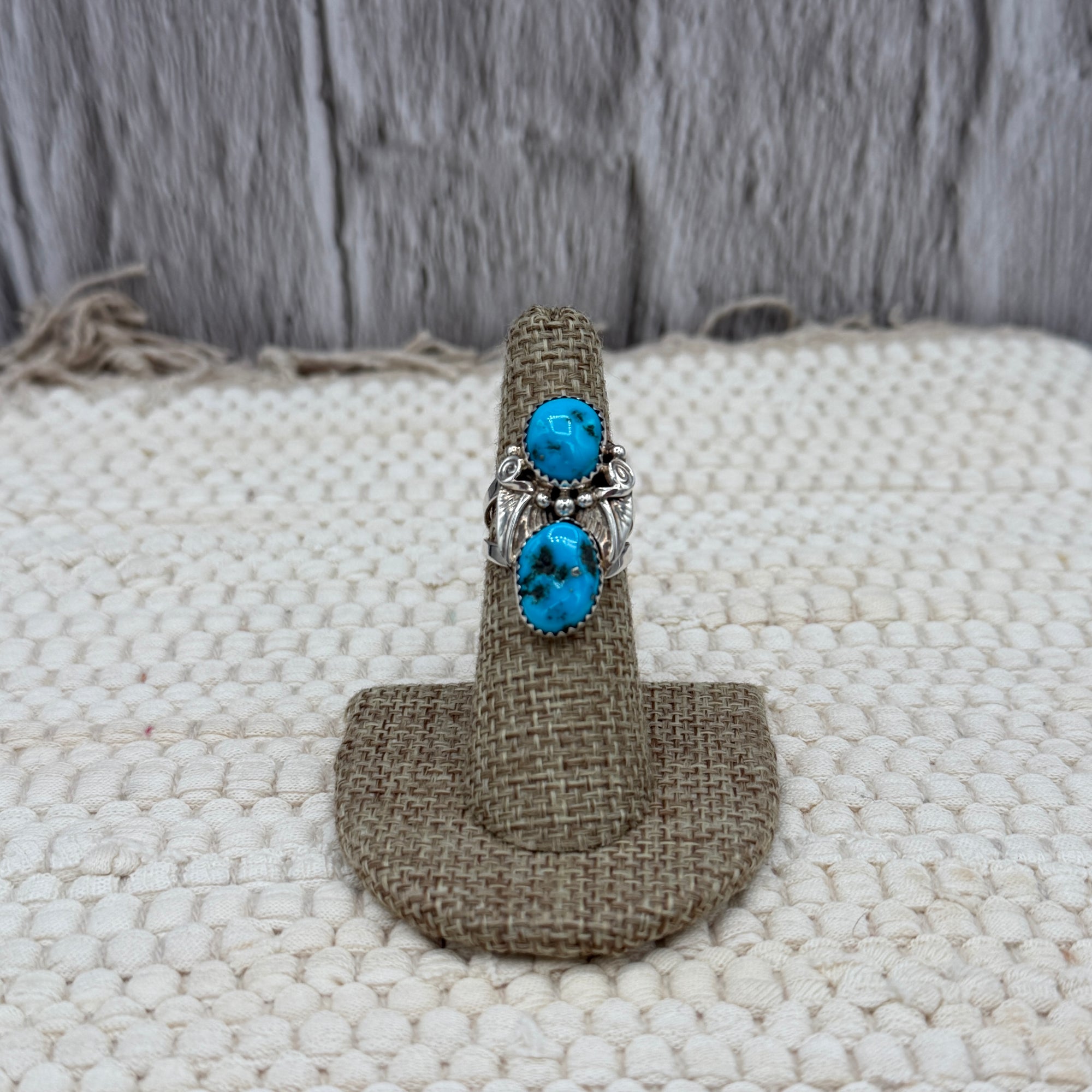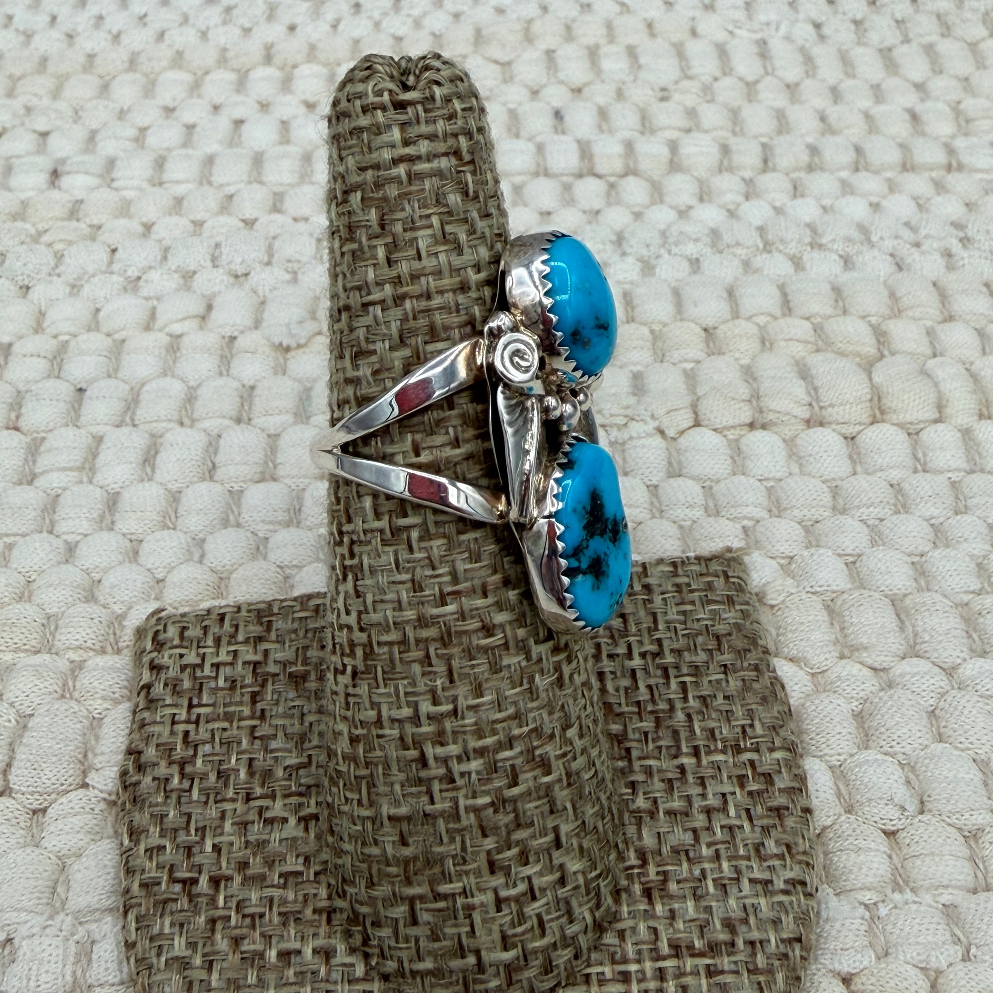 This vintage two-stone turquoise ring by Running Bear is a perfect blend of classic Navajo styling and bold everyday wearability in a super stackable size.
