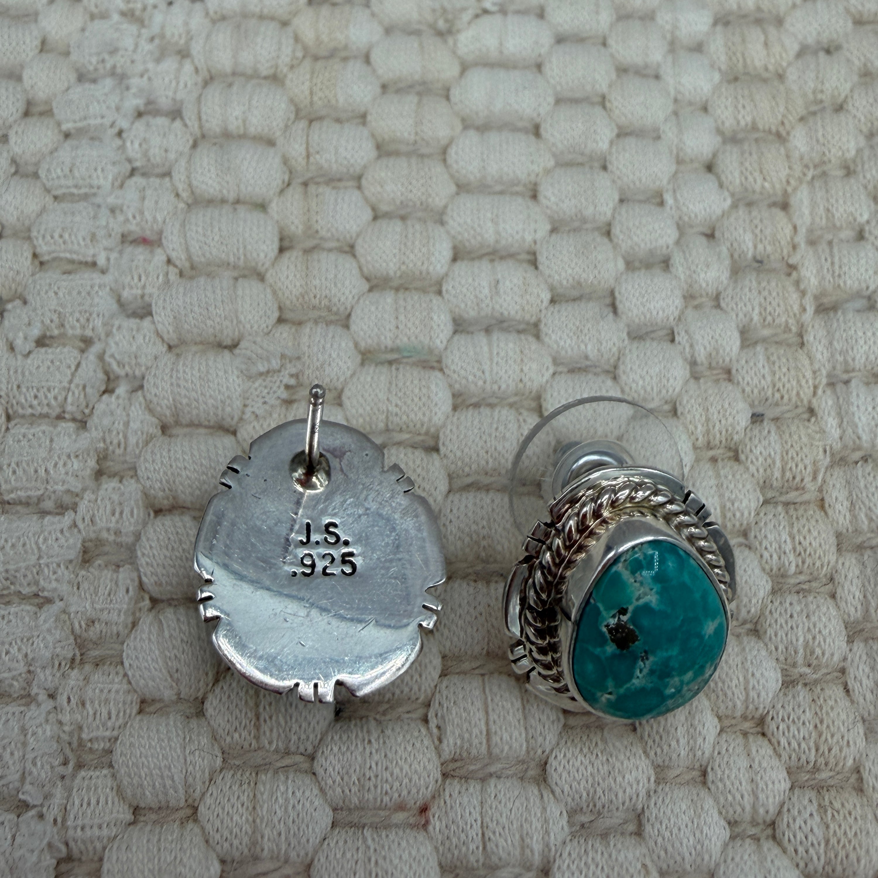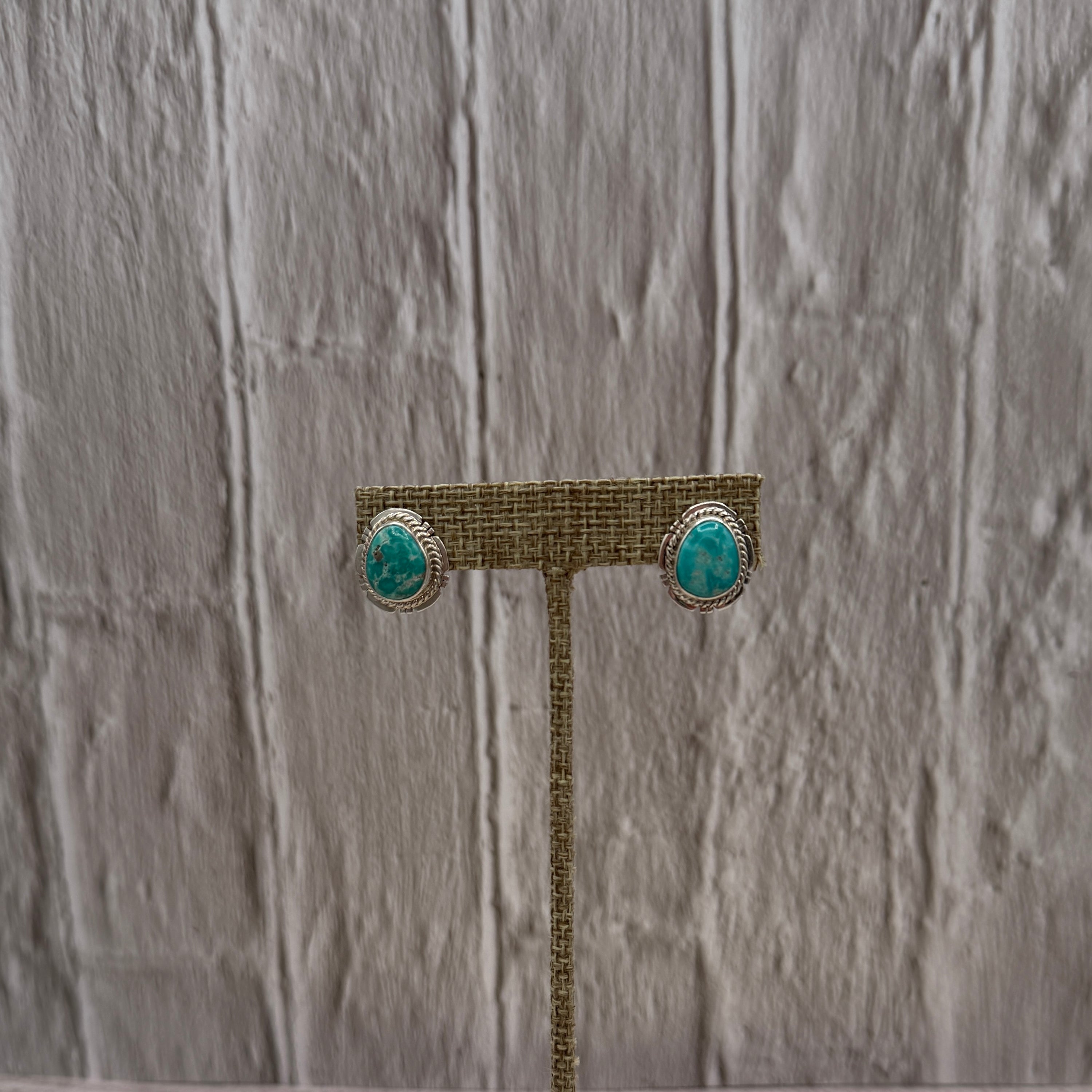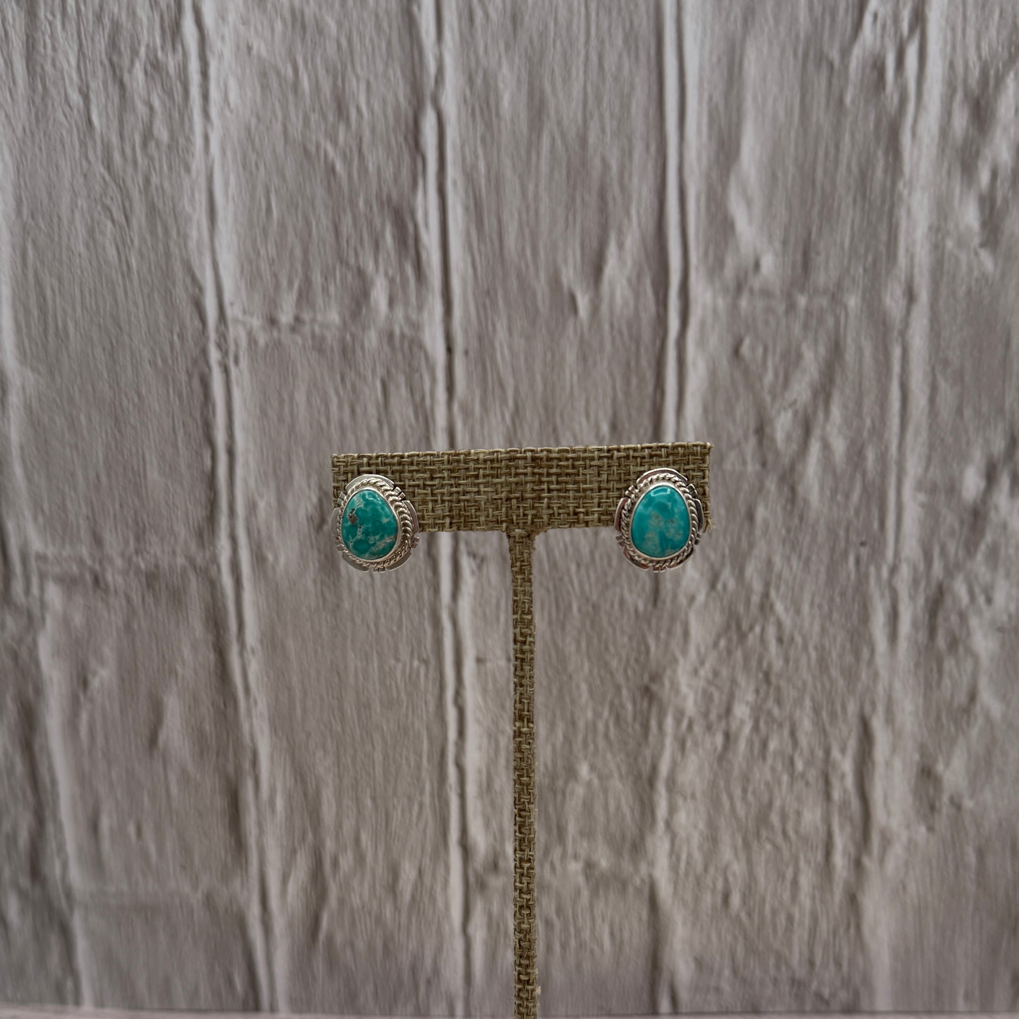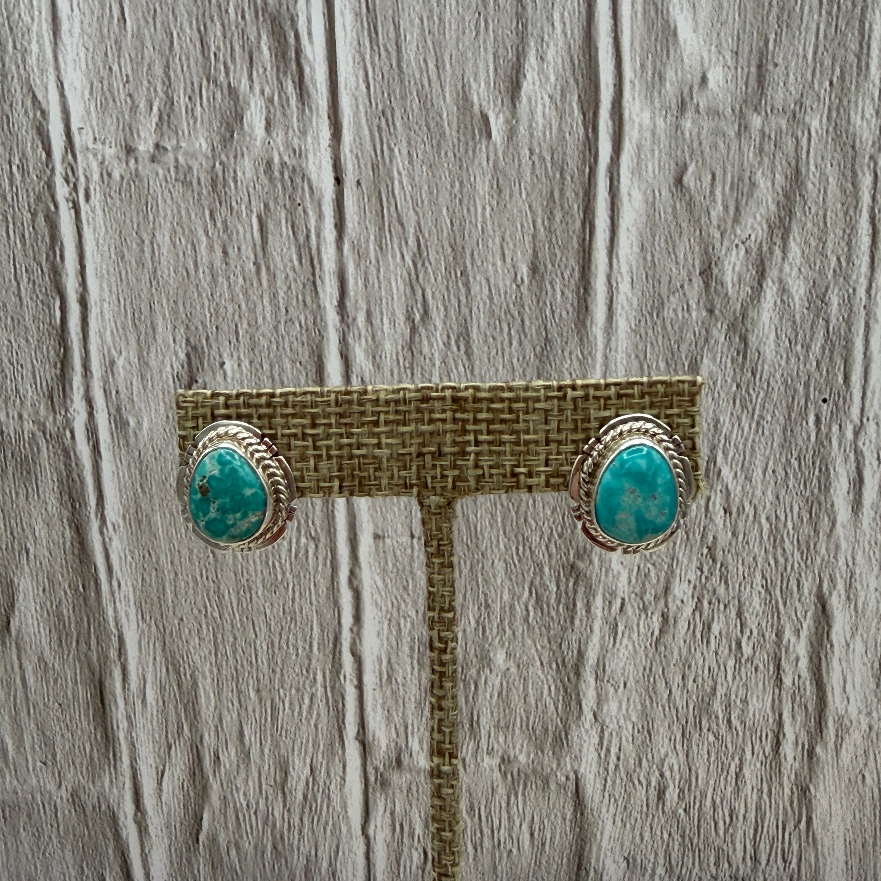Each earring features a genuine oval Whitewater turquoise stone, known for its soft aqua tone with natural earthy matrix that gives it that dreamy desert-water look. The stones are set in classic sterling silver serrated bezels and framed with a twisted rope border, adding just enough texture to keep things interesting without stealing the spotlight from your stack.
