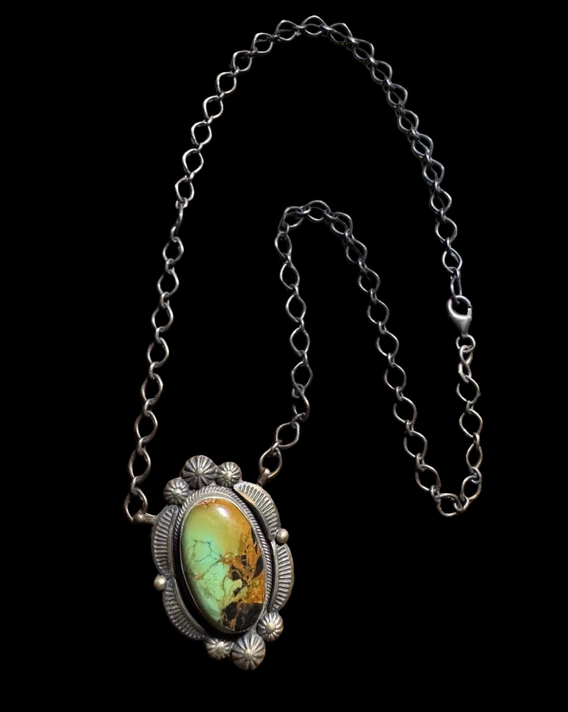 A bold 3” x 2 ½” pendant showcases a stunning Blackjack stone with that unreal blend of lime-green glow melting into warm golden amber, finished with deep matrix veining that looks like lightning frozen in time. Every angle hits different. It’s giving desert sunset. It’s giving outlaw heirloom.