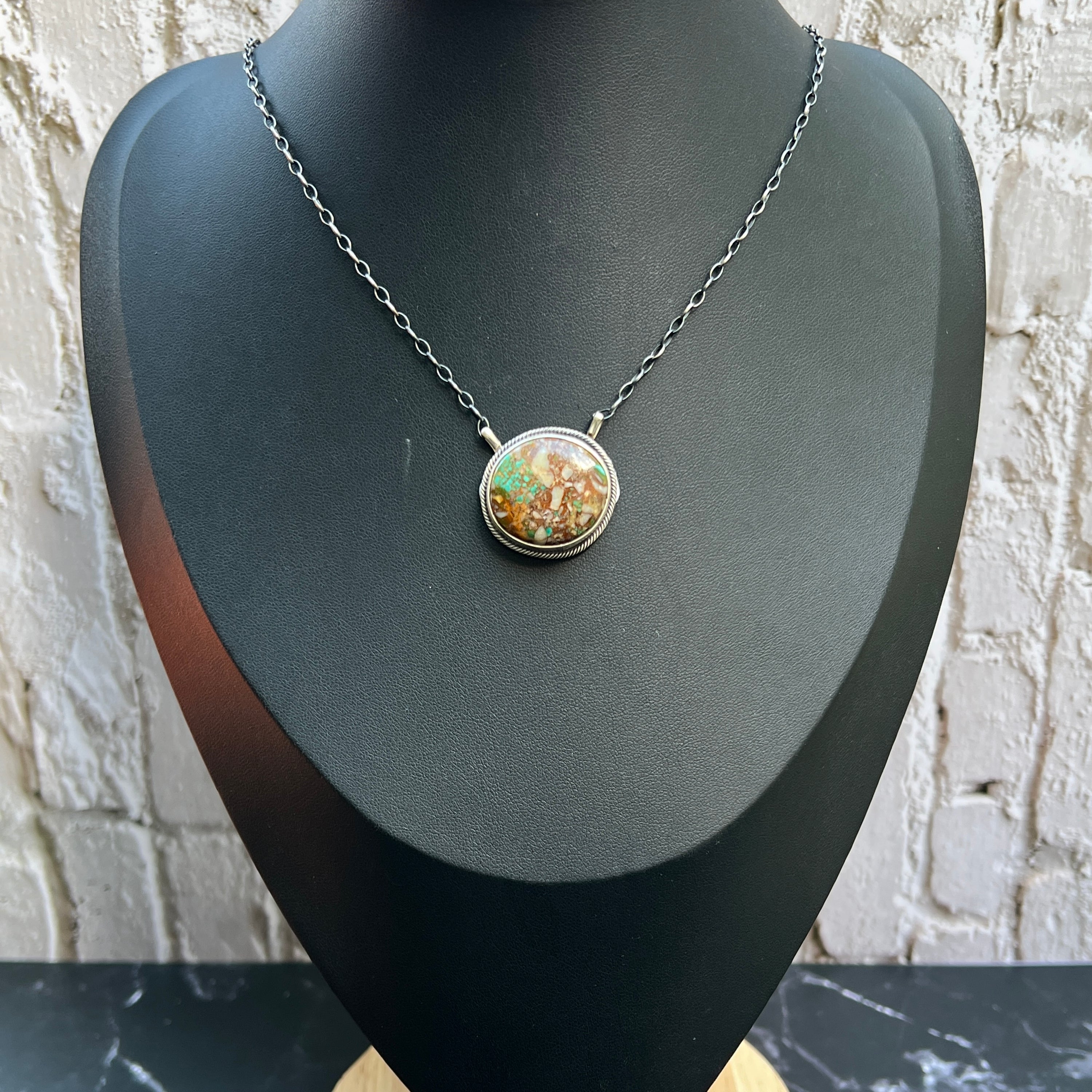 The stone β a natural Boulder Turquoise cabochon β showcases golden-brown matrix laced with vibrant turquoise veins, each marking a one-of-a-kind story straight from the stone itself. Framed in a hand-twisted sterling border, this pendant radiates the warmth and authenticity of true Navajo craftsmanship.