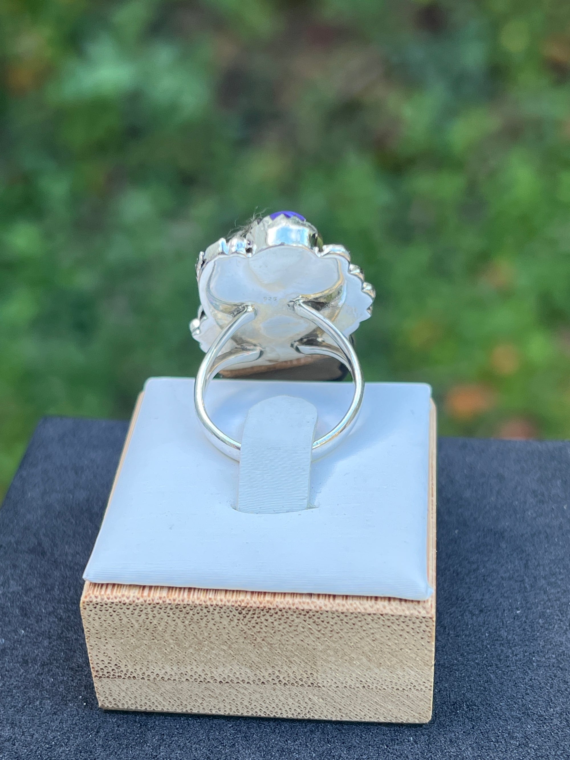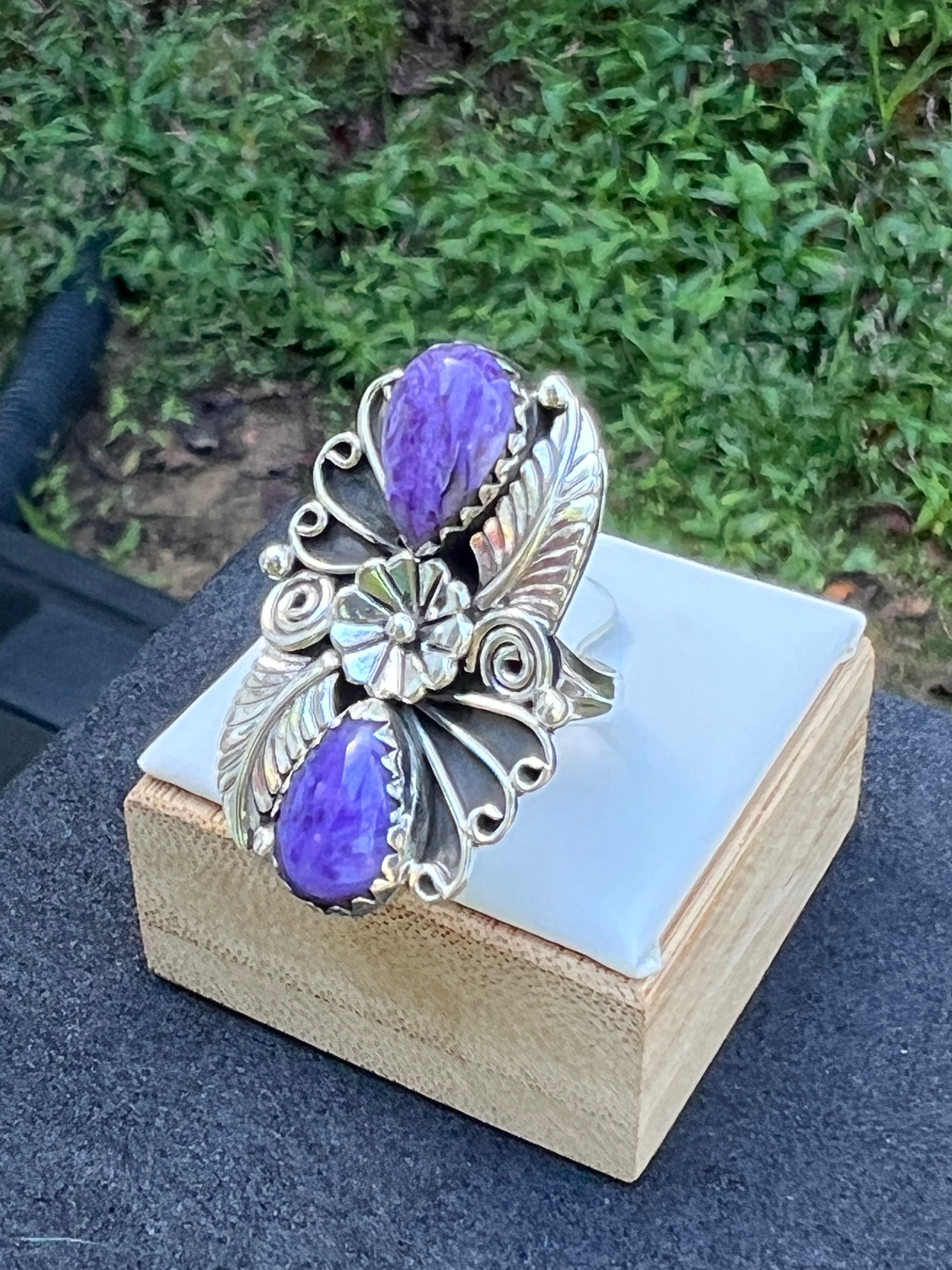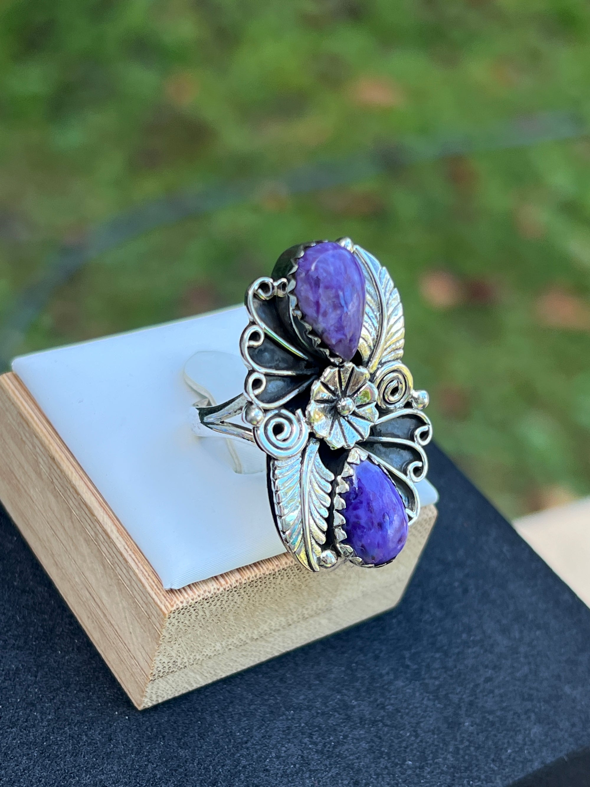 Desert night meets wildflower. Two rich natural charoite cabochons—swirled violet with silky chatoyance—nestle into serrated bezels, framed by hand-forged leaves, scrolls, and a blossom in heavy .925 sterling. Big statement, smooth wear.