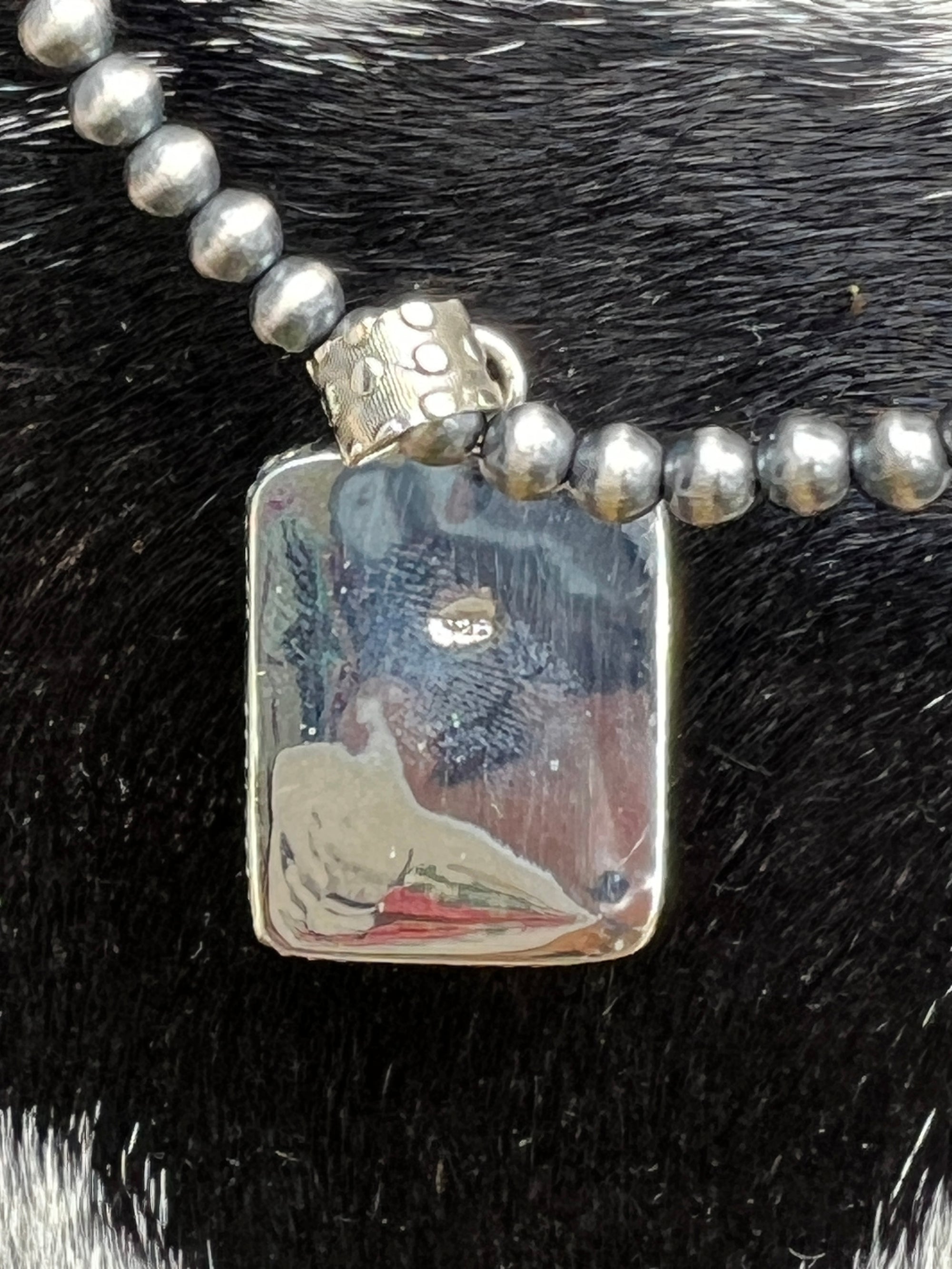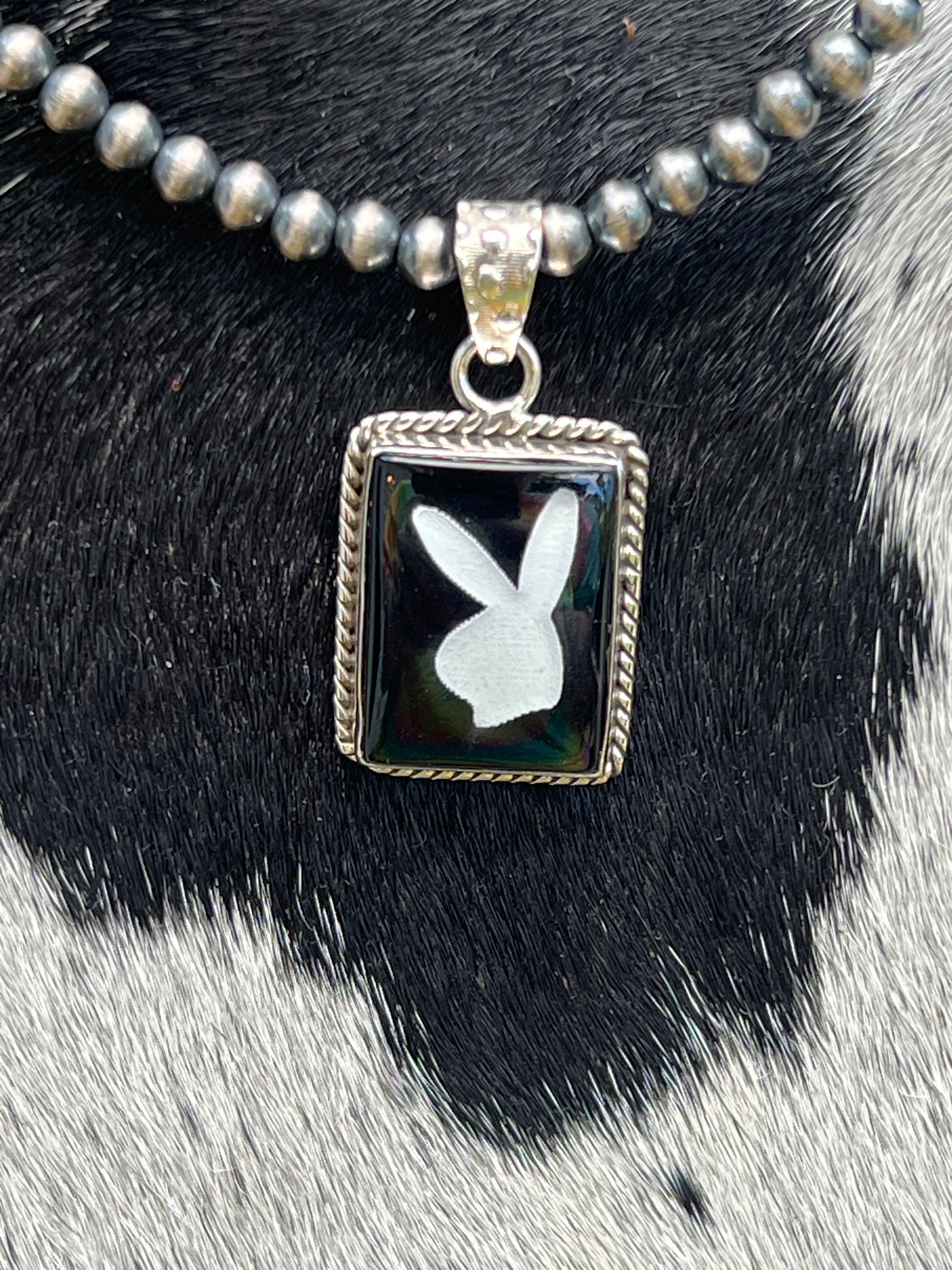 A little cheeky, a little outlaw. A glossy black synthetic stone inlays a crisp bunny silhouette, framed in twisted .925 sterling with an etched bail—clean lines and punchy contrast that pop on pearls or a chunky chain.
