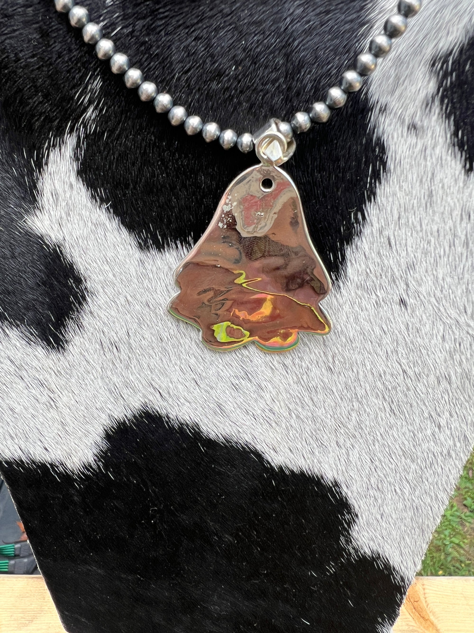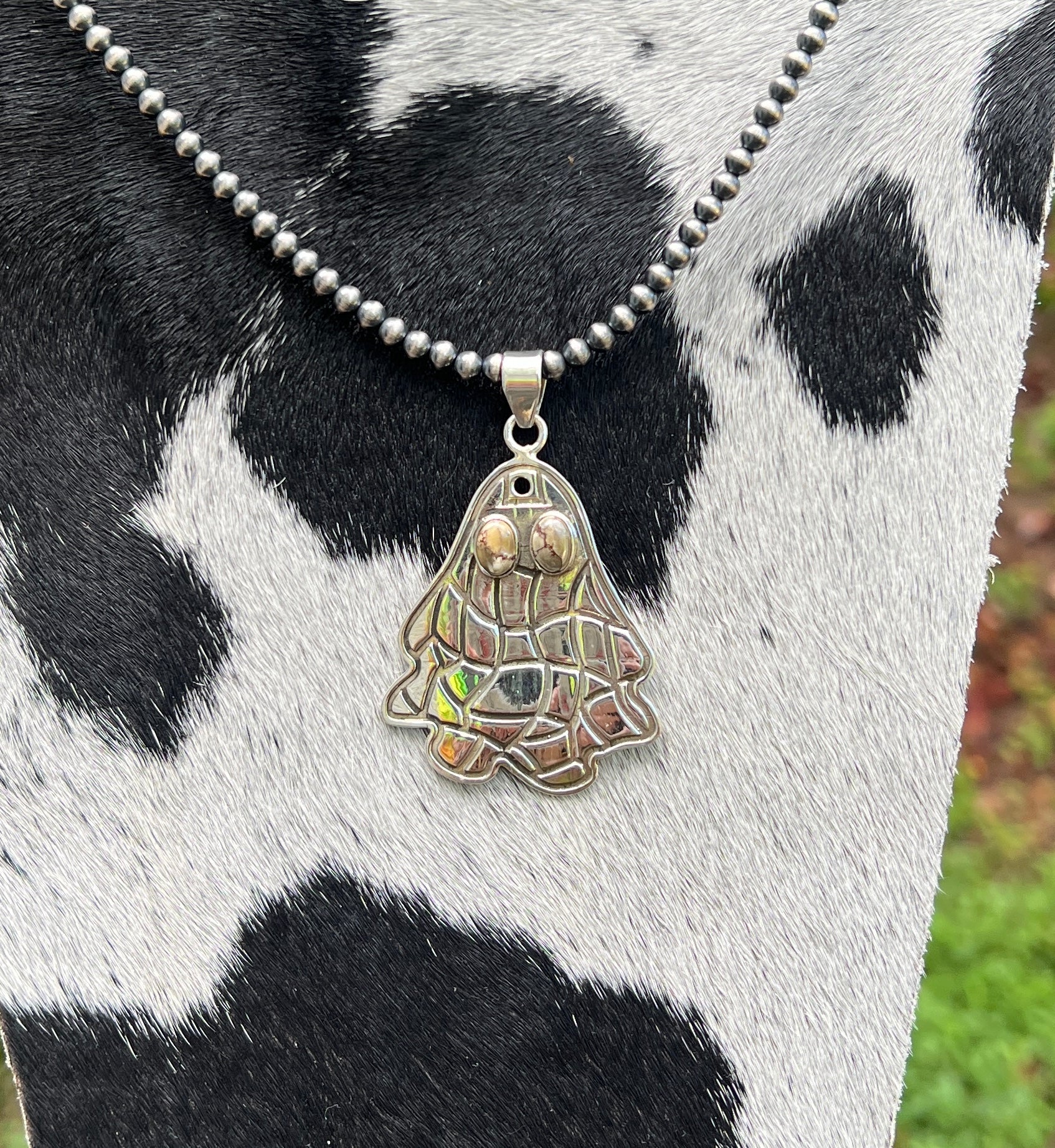 Boo-tiful and badass. This playful ghost pendant is hand-wrought in .925 sterling silver with quilted “sheet” lines and two natural stone “eyes” that glow with character. Slip it on pearls or a chunky chain for October vibes all year long.