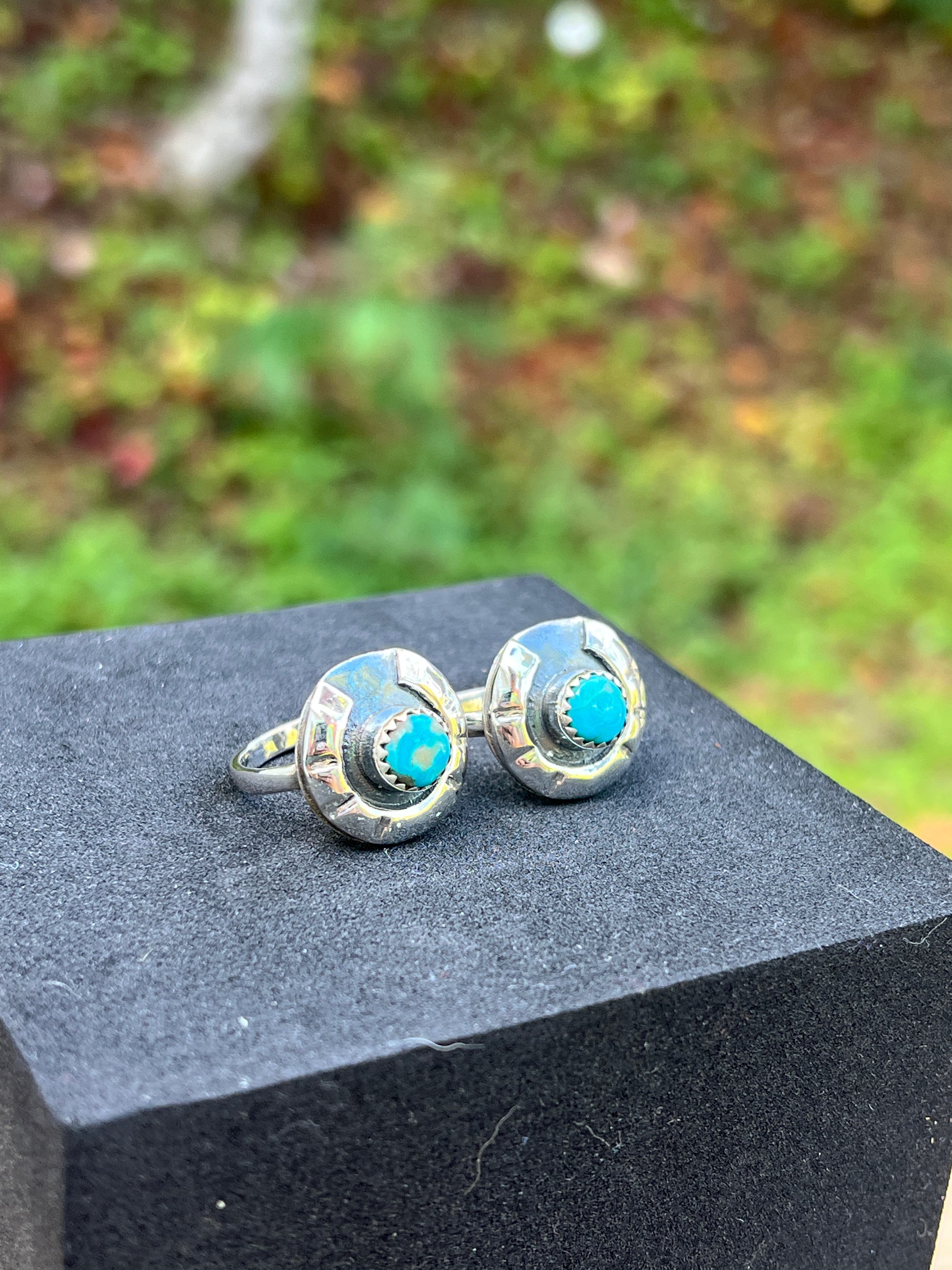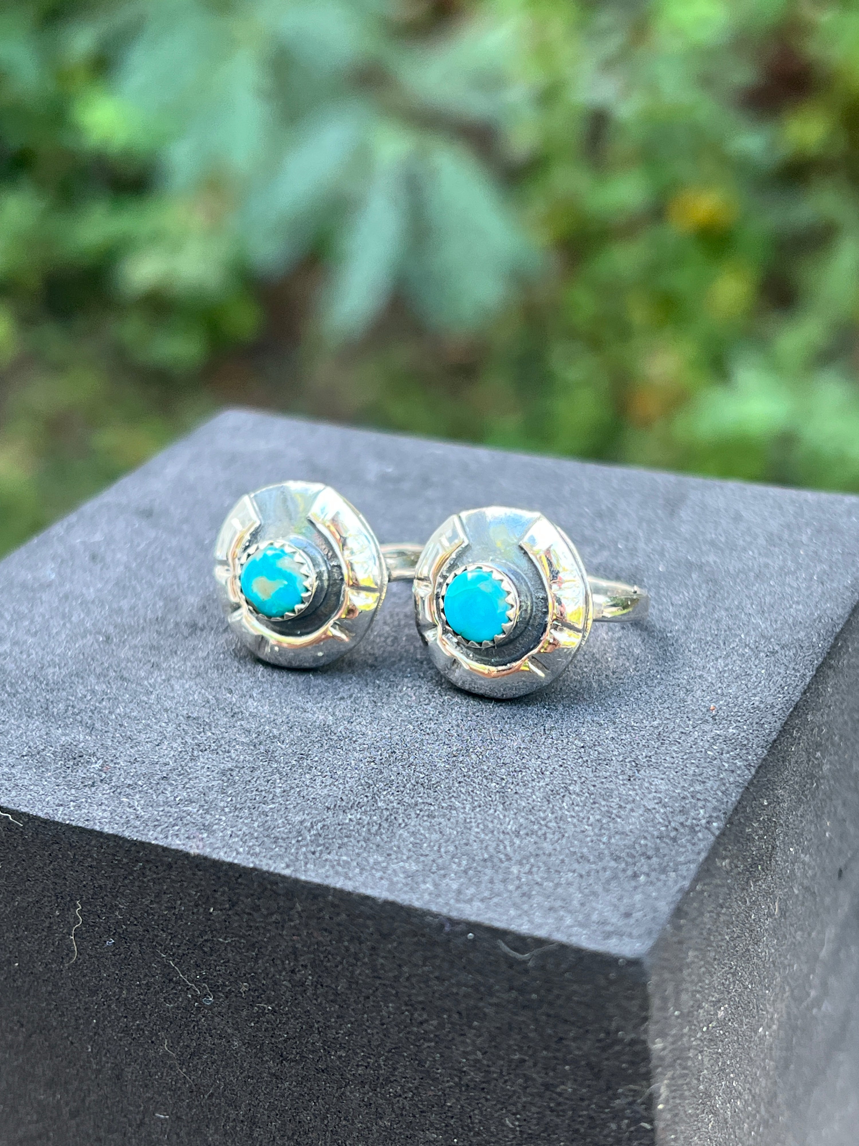 Lucky, loud, and Western to the bone. A kingman turquoise cab glows from the center of a sculpted horseshoe face, all in polished .925 sterling silver. Bold enough for rodeo nights, sweet enough for everyday.