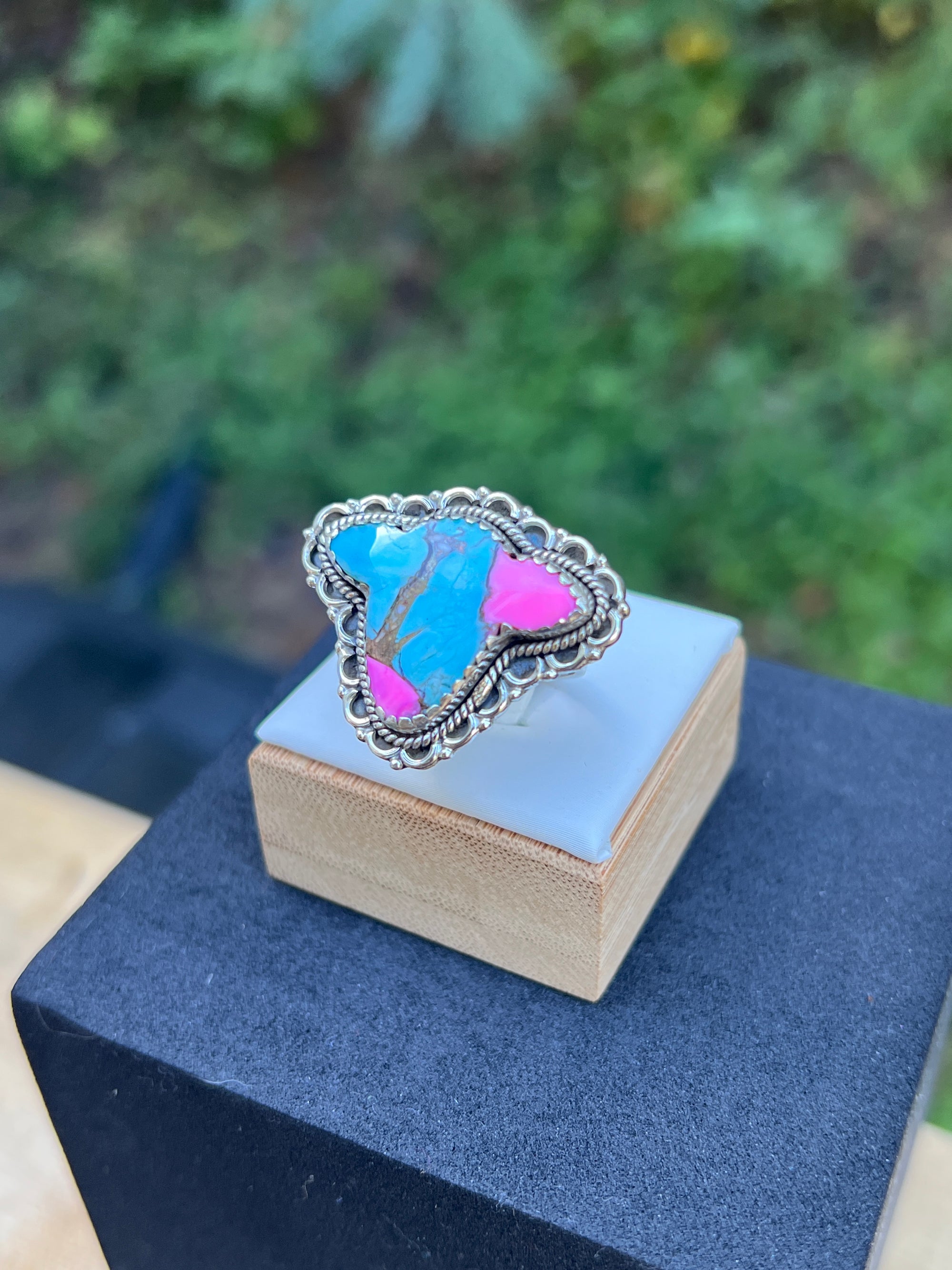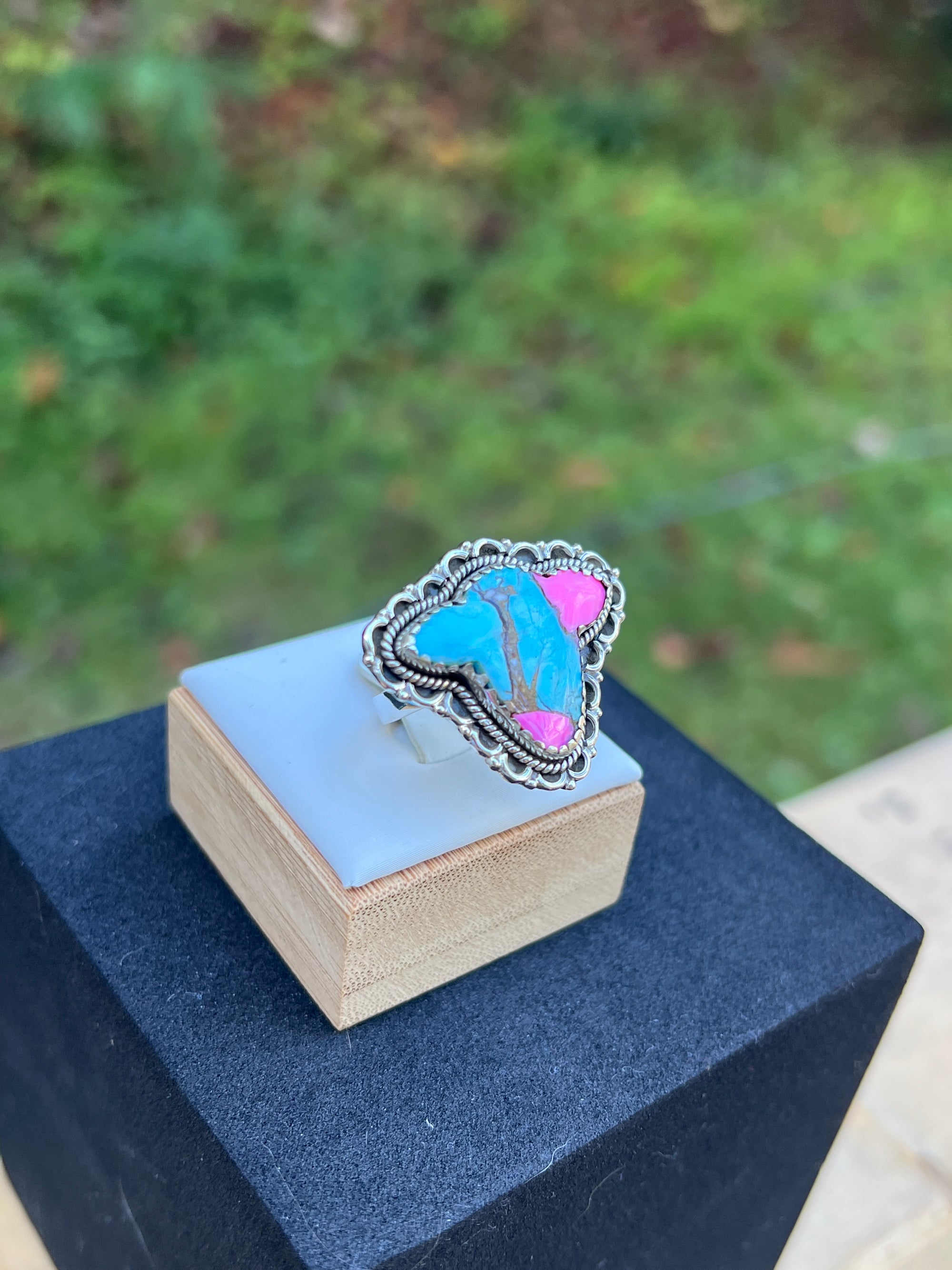 Punchy, pink-and-blue perfection. A hand-carved cow head of natural Cotton Candy Turquoise—swirls of sky blue, blush pink, and warm matrix—sits in a serrated bezel framed by rope and scalloped sterling. Western drama with gallery polish.