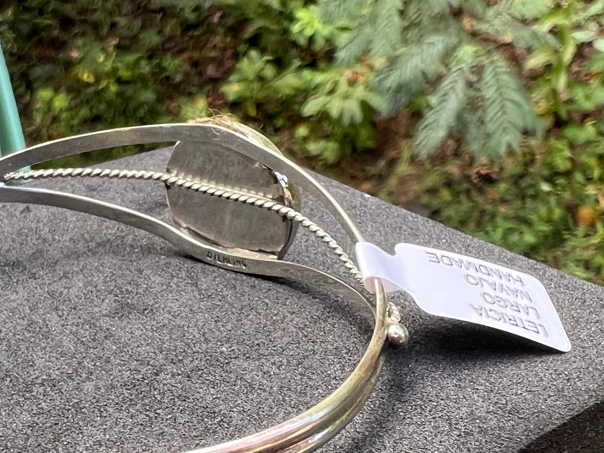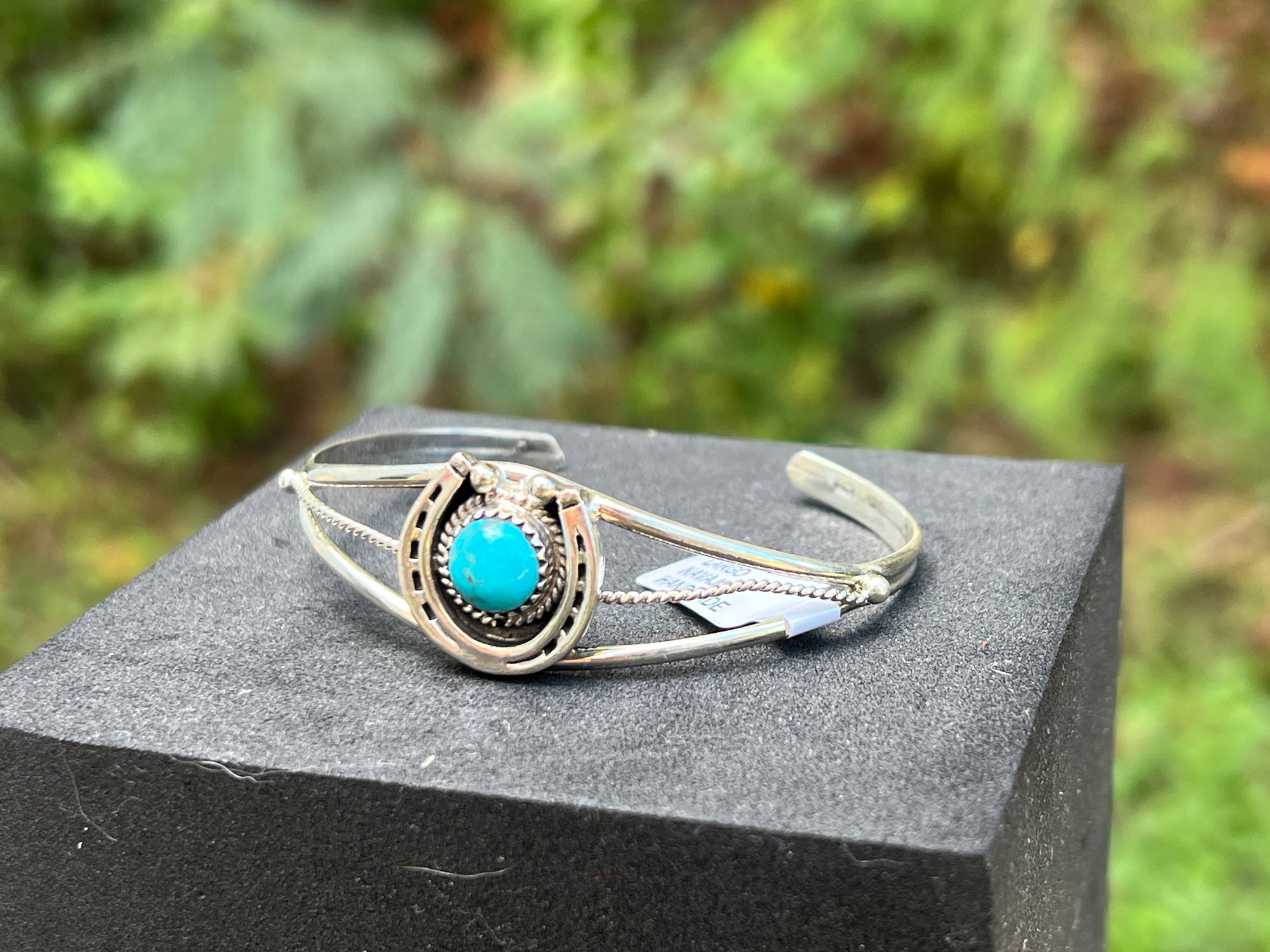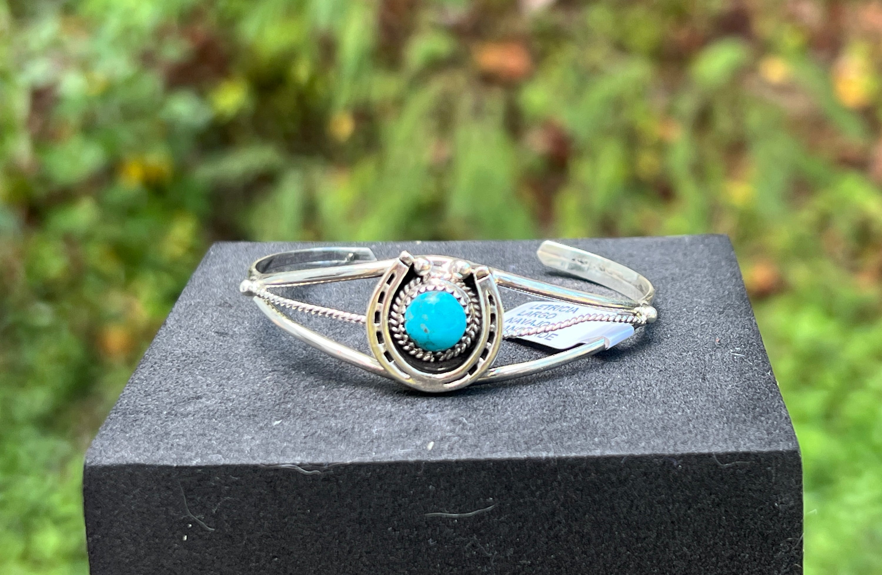 A lucky little heirloom. This handmade cuff by Navajo silversmith Letricia Largo frames a round turquoise cabochon inside a raised horseshoe motif, set on a split-shank bracelet with twisted-rope accents. The sterling has a gentle spring, so you can fine-tune the fit.