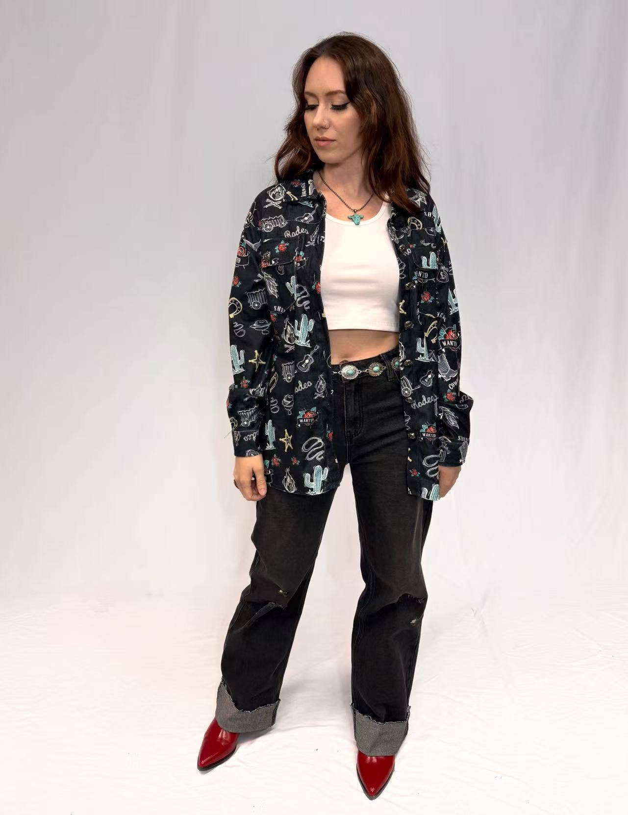 Packed with personality, this button-up shacket features an allover print of boots, hats, wagon wheels, campfires, and rodeo motifs. The black base makes the turquoise, red, and white graphics pop for a bold, eye-catching look. Designed with chest pockets, button cuffs, and a relaxed fit, it's an easy layering piece that adds instant character to any collection.