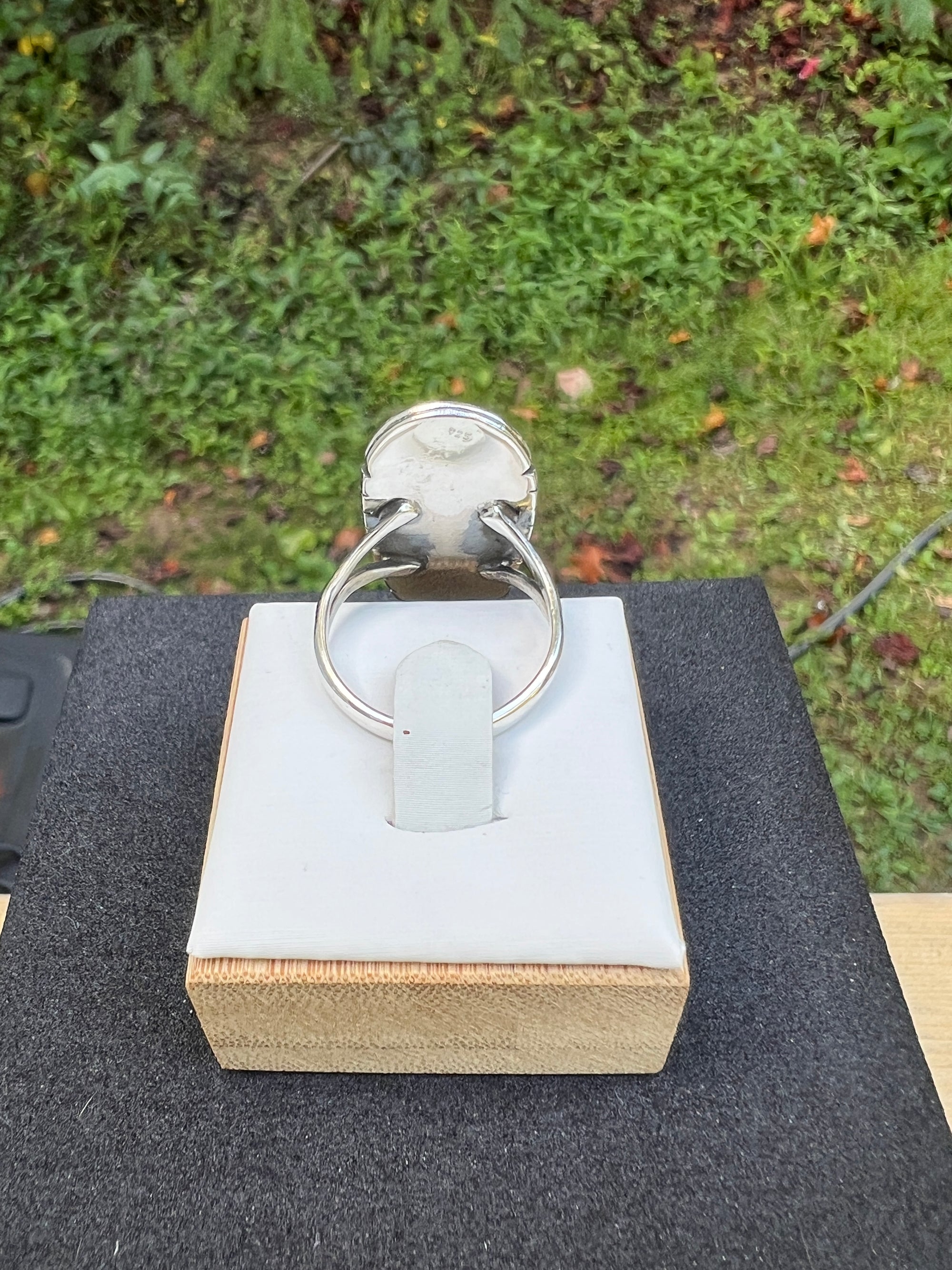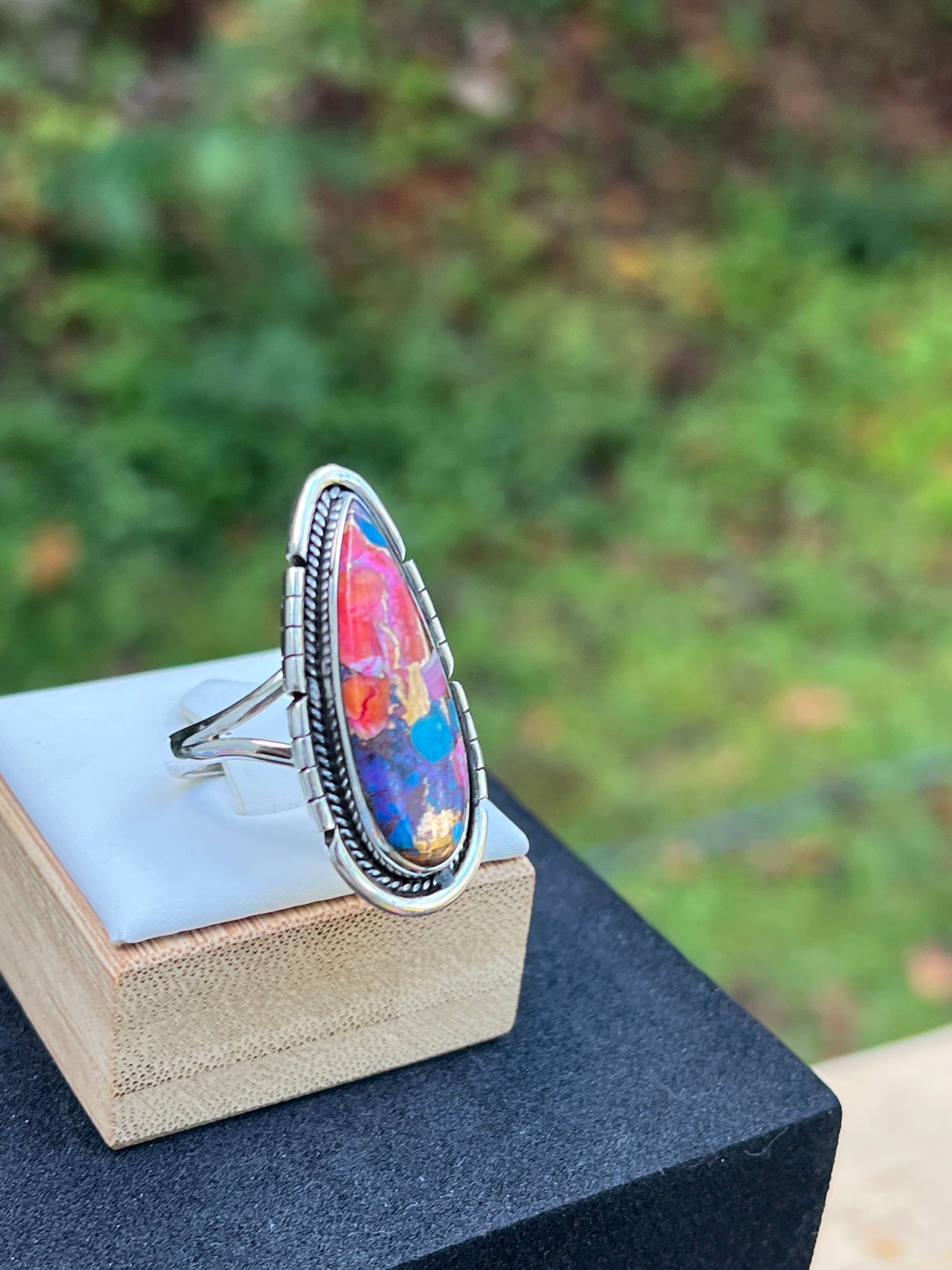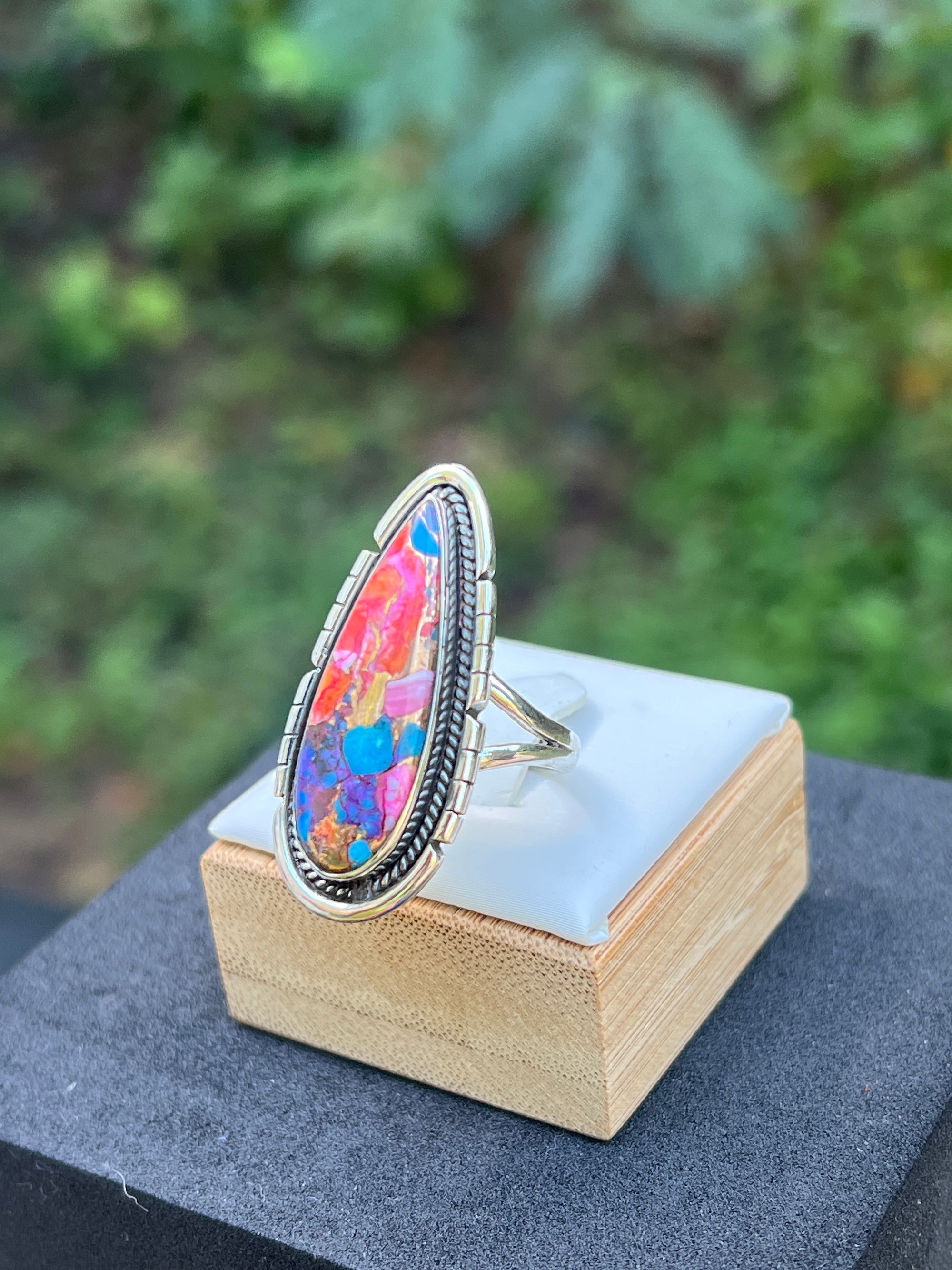 Sunset-on-the-desert vibes. An elongated teardrop of Pink Dahlia (swirls of magenta, sky blue, and warm bronze matrix) sits in a rope bezel with a chiseled border on heavy .925 sterling. Oxidized for depth, polished for shine—pure punchy Western drama.