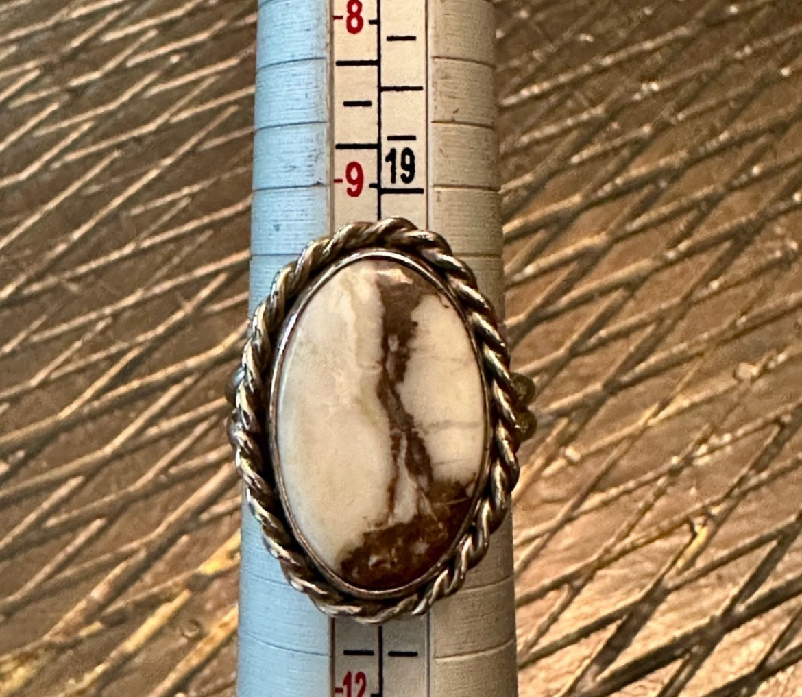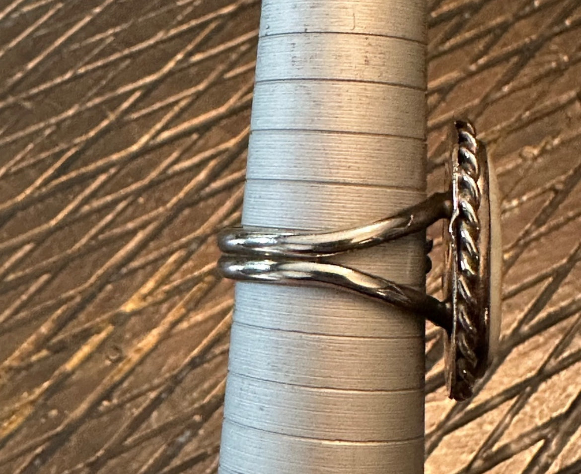 Vintage, Handcrafted by artists Raquel & Leonard Hurley, this classic ring features a polished White Buffalo cabochon framed in a twisted sterling silver rope bezel and set on a sturdy split shank.