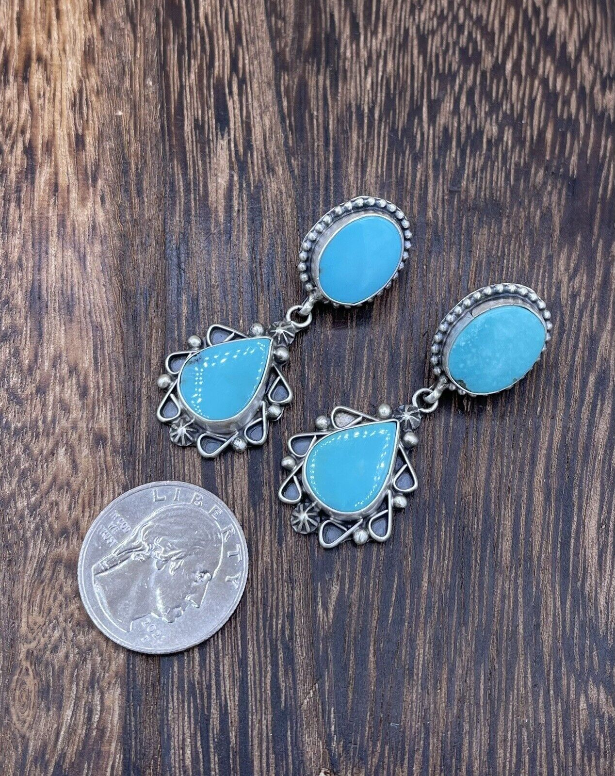 Add a touch of Native American heritage to your jewelry collection with these beautiful post dangle earrings. Handmade by Navajo artisan Betta Lee, these sterling silver earrings feature a stunning Kingman turquoise stone in a bezel setting. The old look of the earrings adds to their charm and appeal.