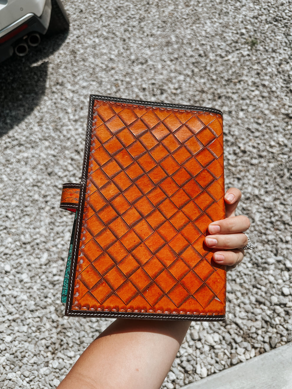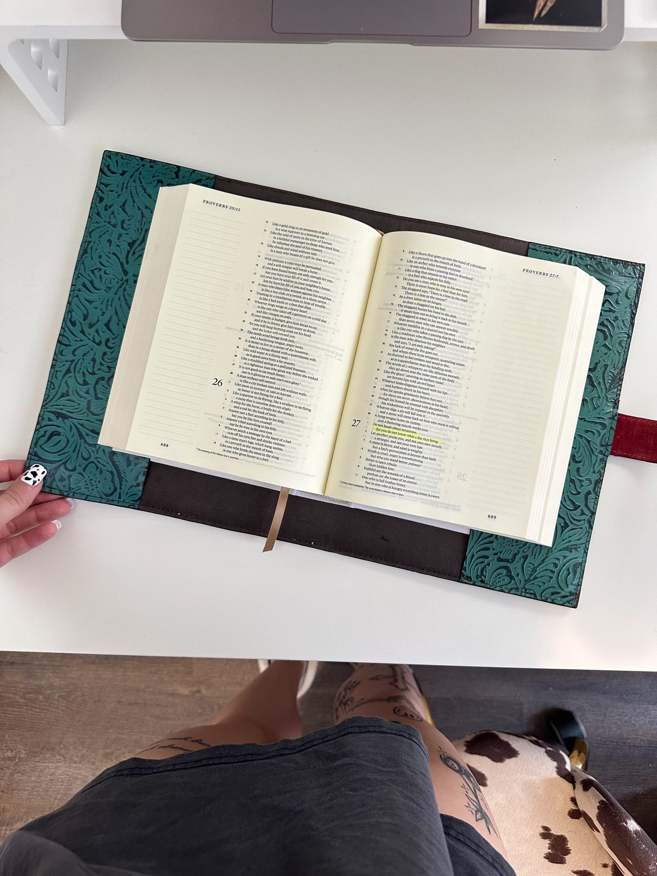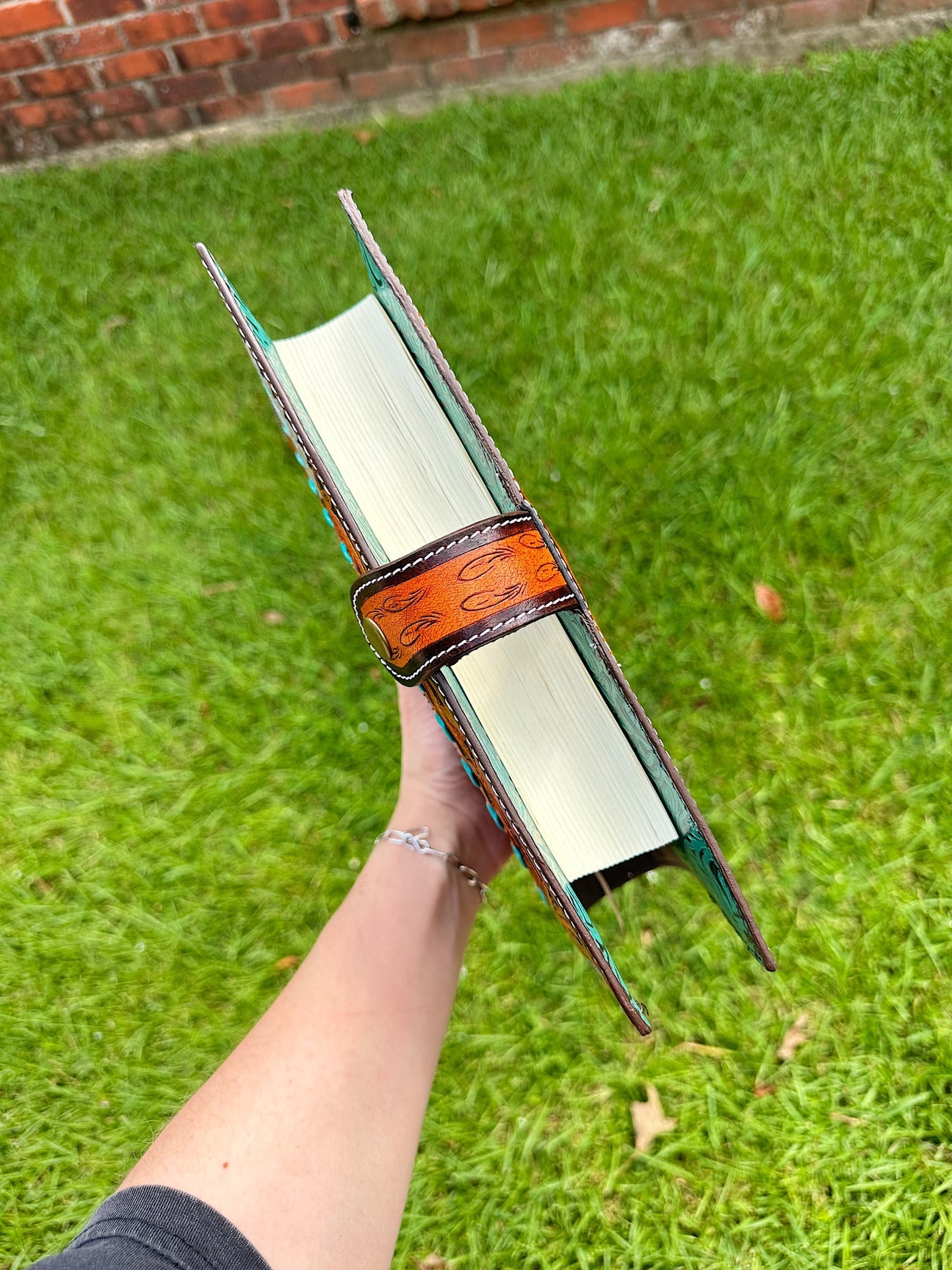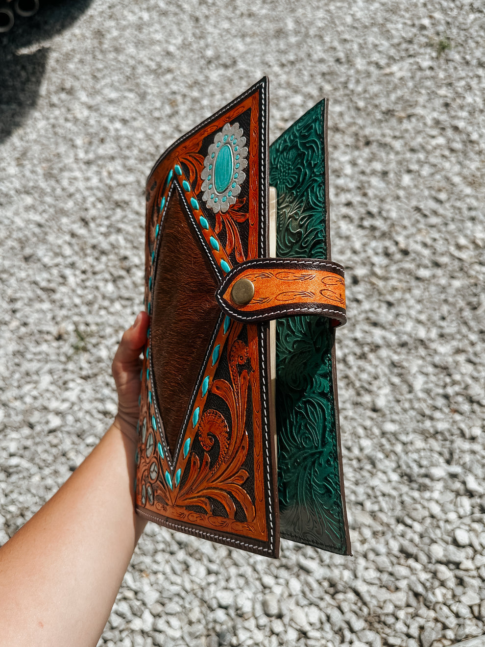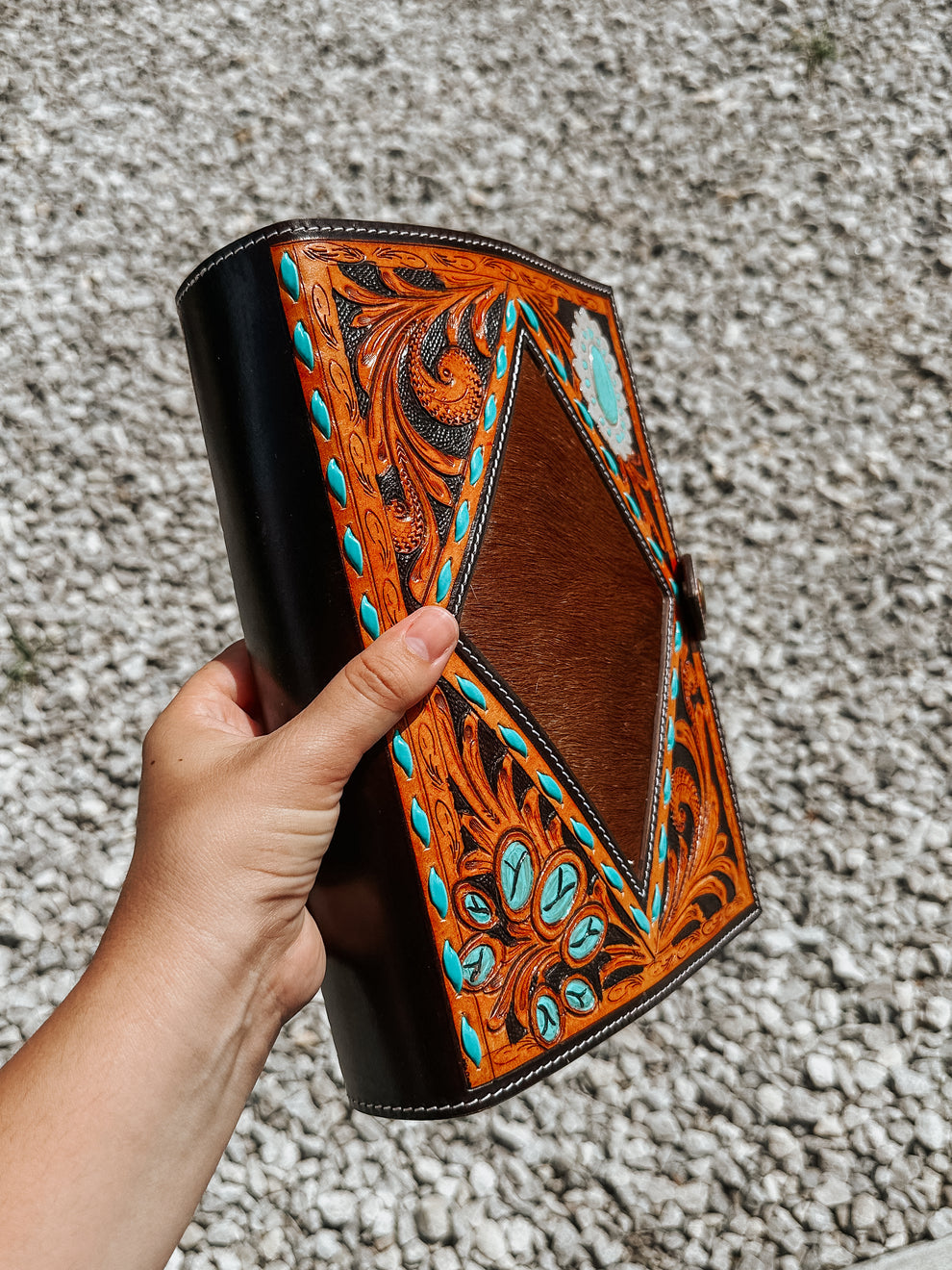 Carry your faith in style with this beautifully handcrafted Bible cover. Featuring a genuine cowhide inlay framed by rich hand-tooled leather, this piece blends Western artistry with everyday function. Accented with turquoise detailing and a secure snap closure, it offers both elegance and durability. Each hide pattern is naturally unique, making every cover a one-of-a-kind treasure. Perfect for protecting your Bible while making a bold statement of personal style and faith.