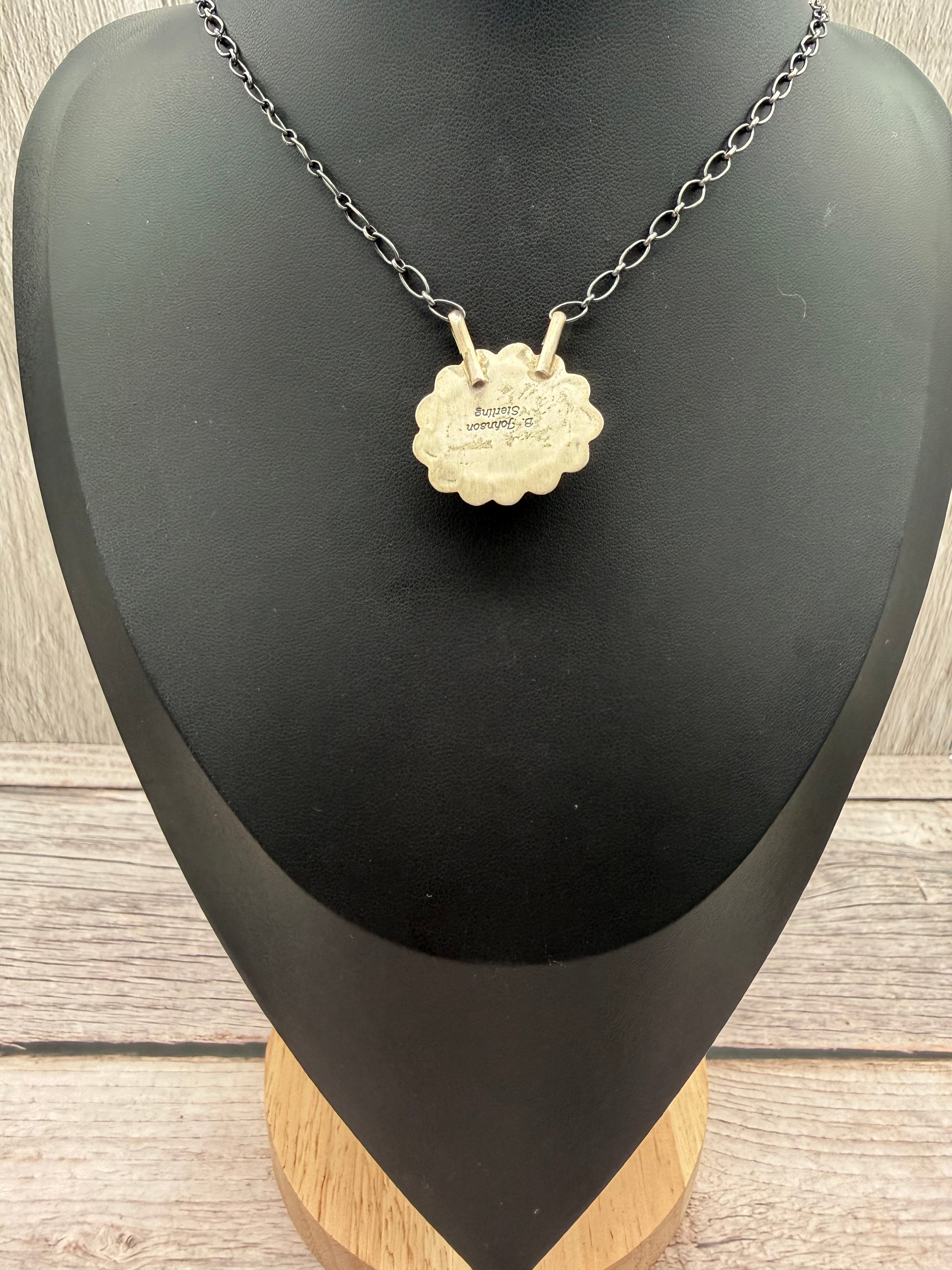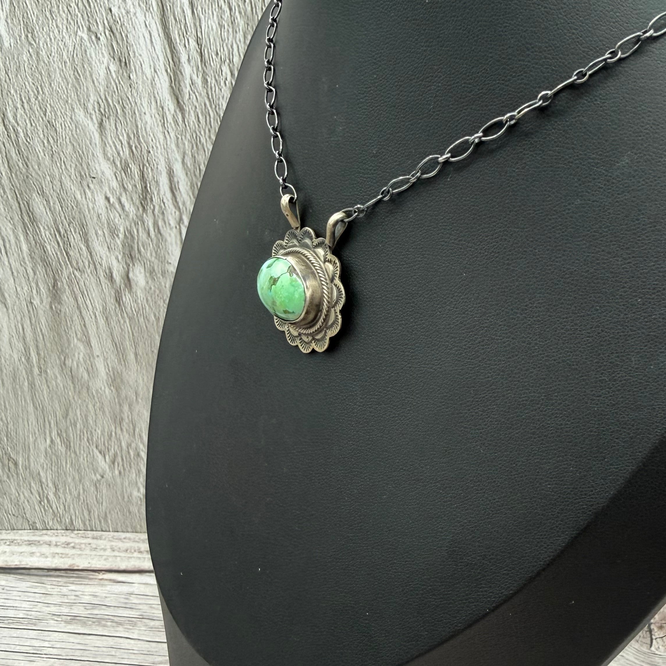 Set in a scalloped, oxidized Sterling pendant with twisted rope detailing, this piece is the perfect blend of traditional Navajo craftsmanship and modern wearable art. Hung on a dark patinaed chain, it’s ready to wear solo or layered into your favorite turquoise stack.