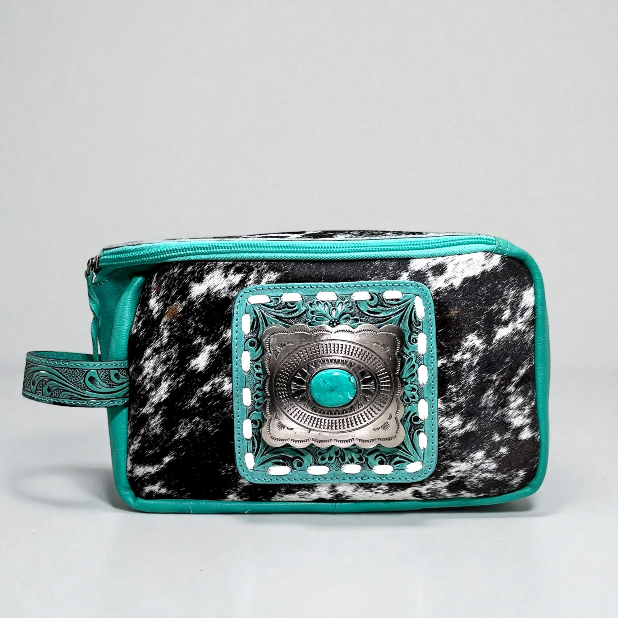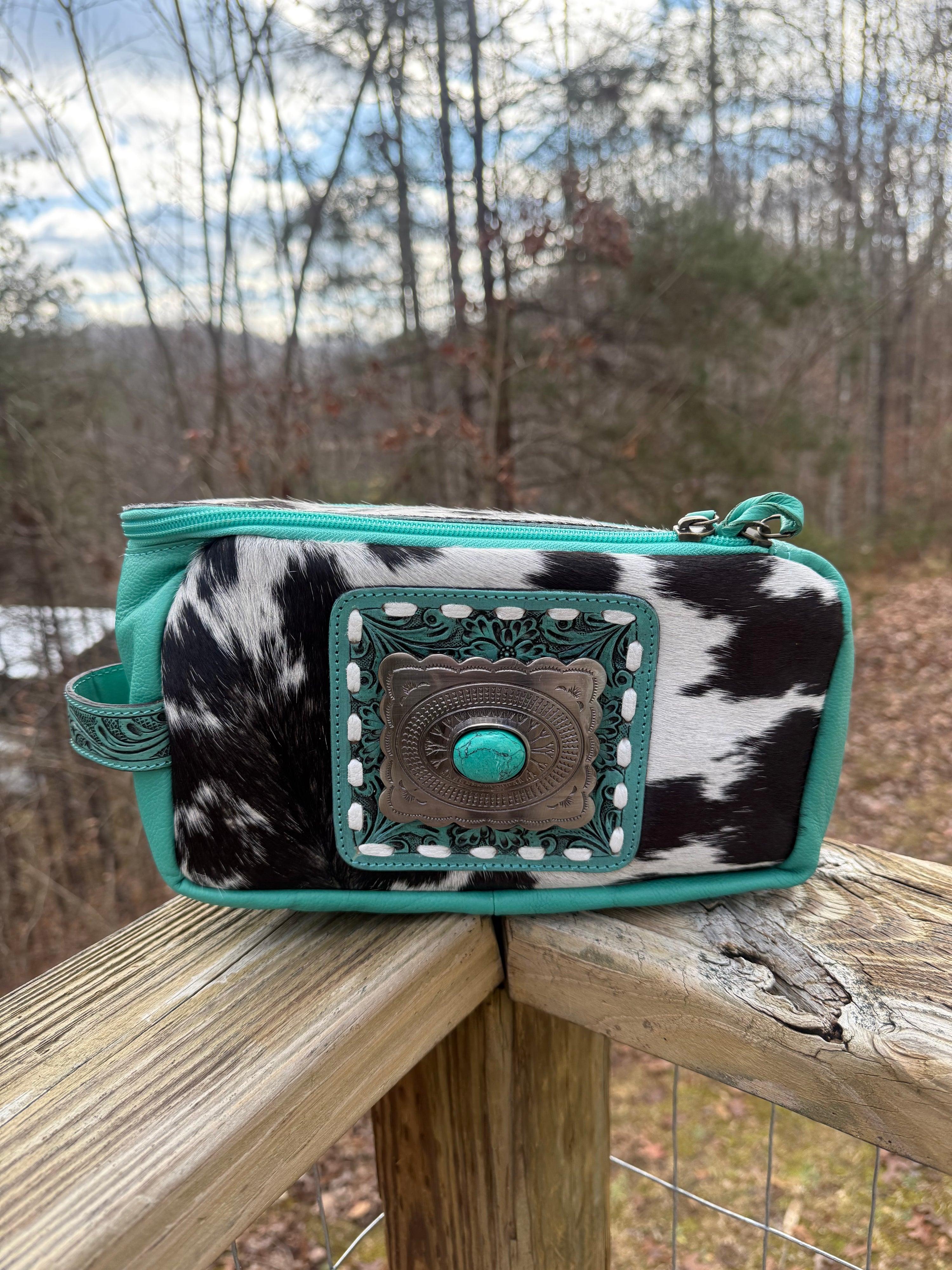 Crafted with a durable, water-resistant exterior and wrapped in that bold punchy-western style you love, this bag is built for everything from airport terminals to rodeo weekends. The show-stopping concho centerpiece, turquoise leather accents, and black & white hair-on-hide body give it the perfect mix of rugged and refined.