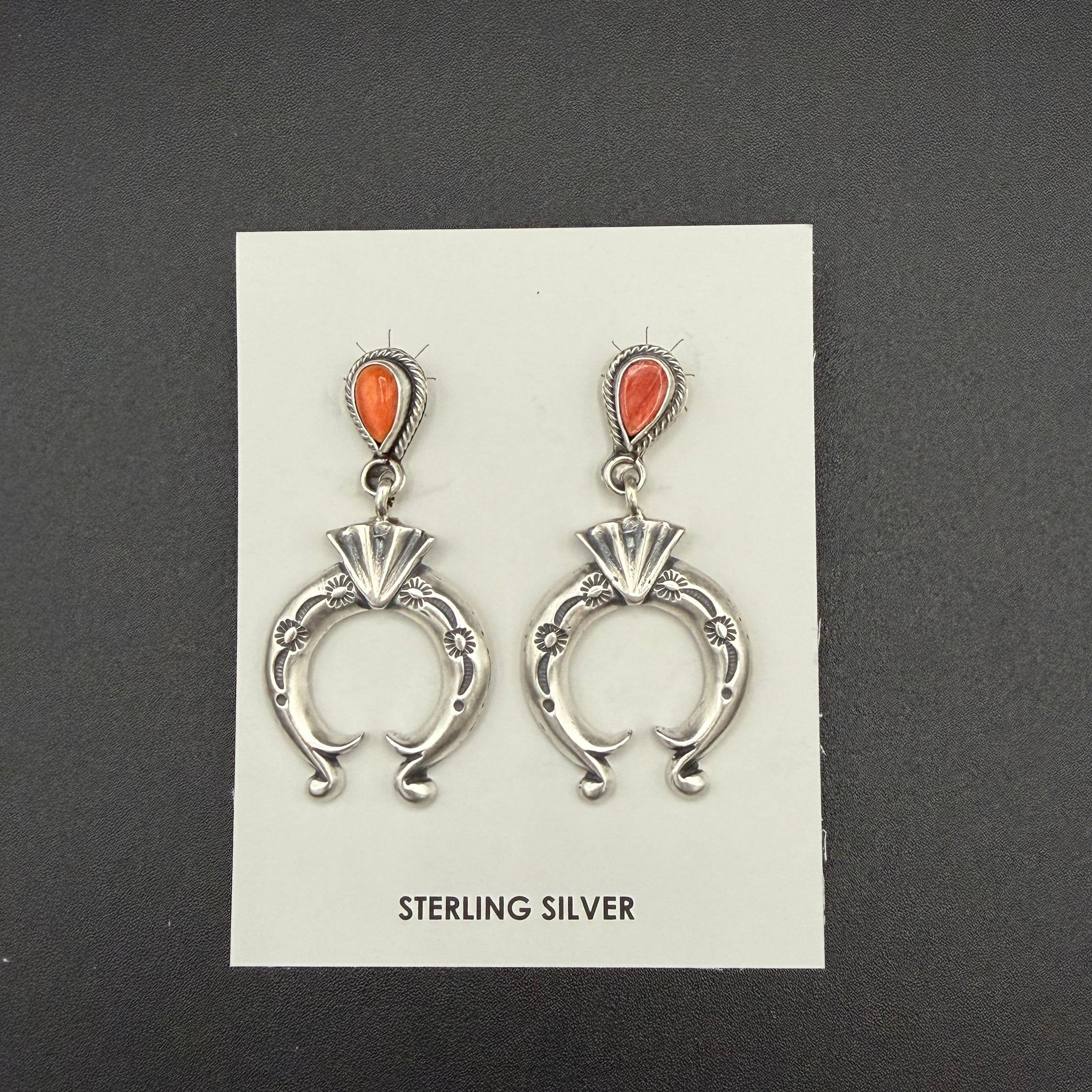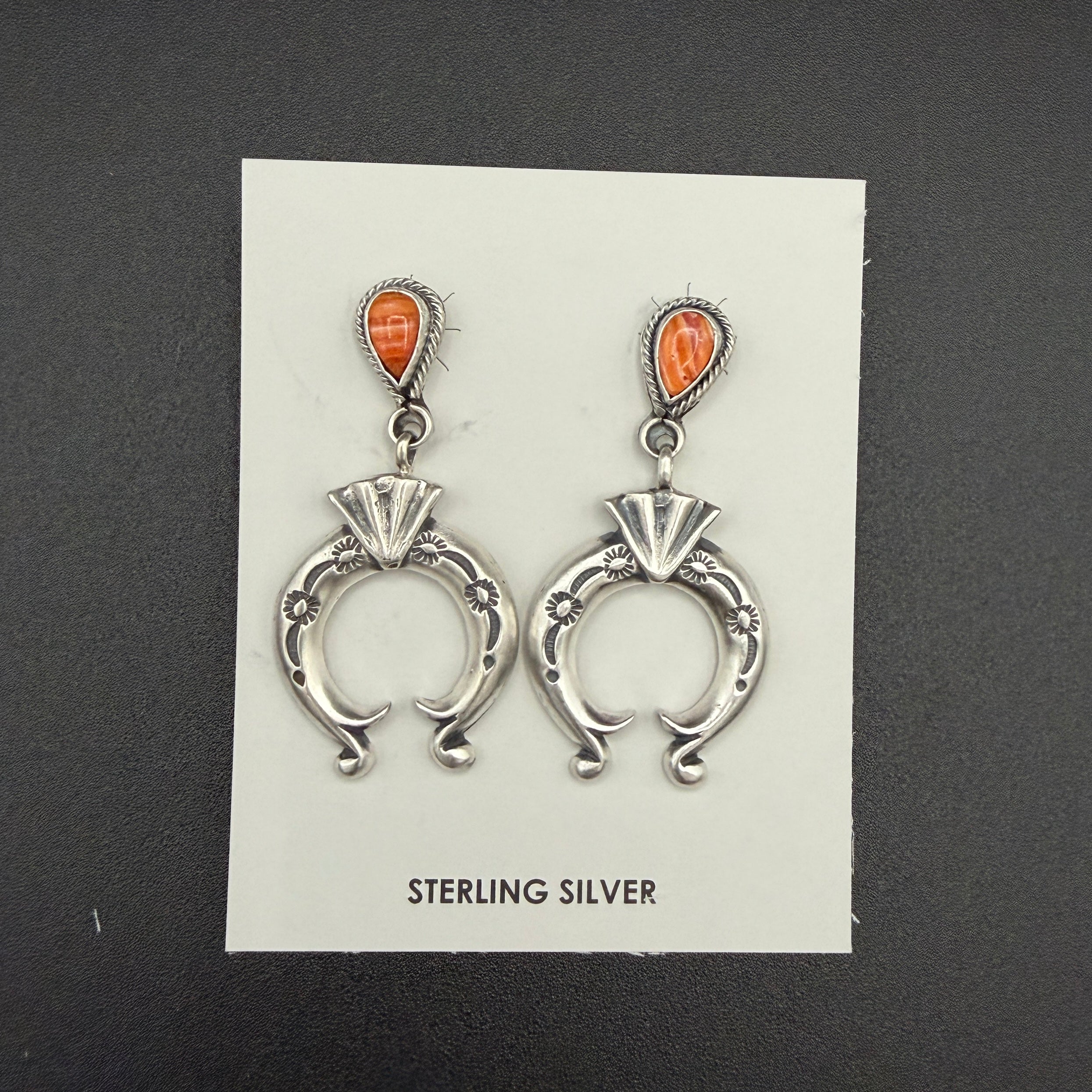 Classic Navajo design with a bold pop of color. These orange spiny oyster drop earrings by Verley Betone feature rich, naturally colored spiny oyster cabochons set in solid sterling silver, paired with traditional squash-inspired crescent drops.