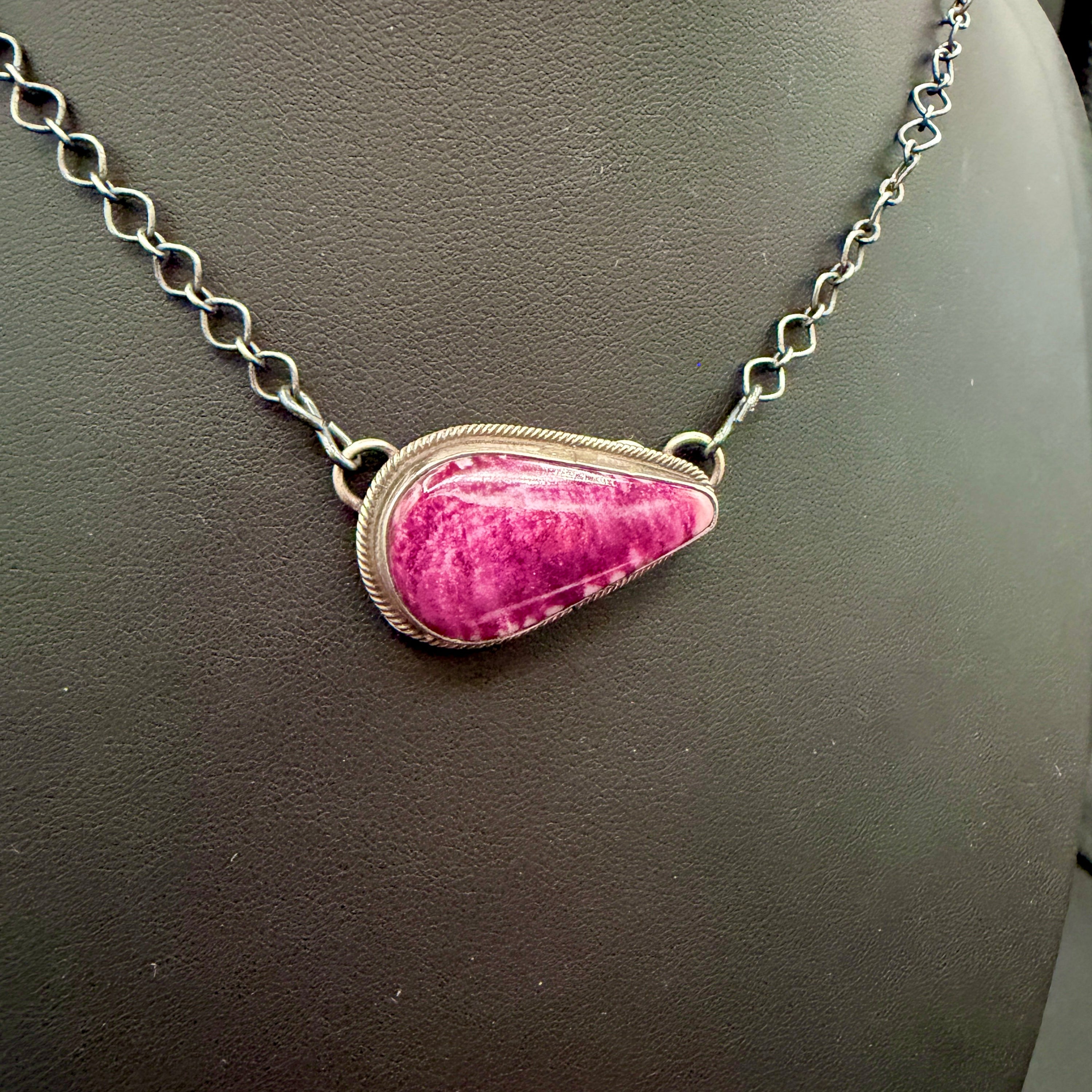 This striking purple spiny oyster necklace is all about rich color and clean, timeless design. The vibrant spiny oyster stone shows beautiful natural variation, hand-set in smooth sterling silver and paired with a classic sterling chain that lets the stone do all the talking.