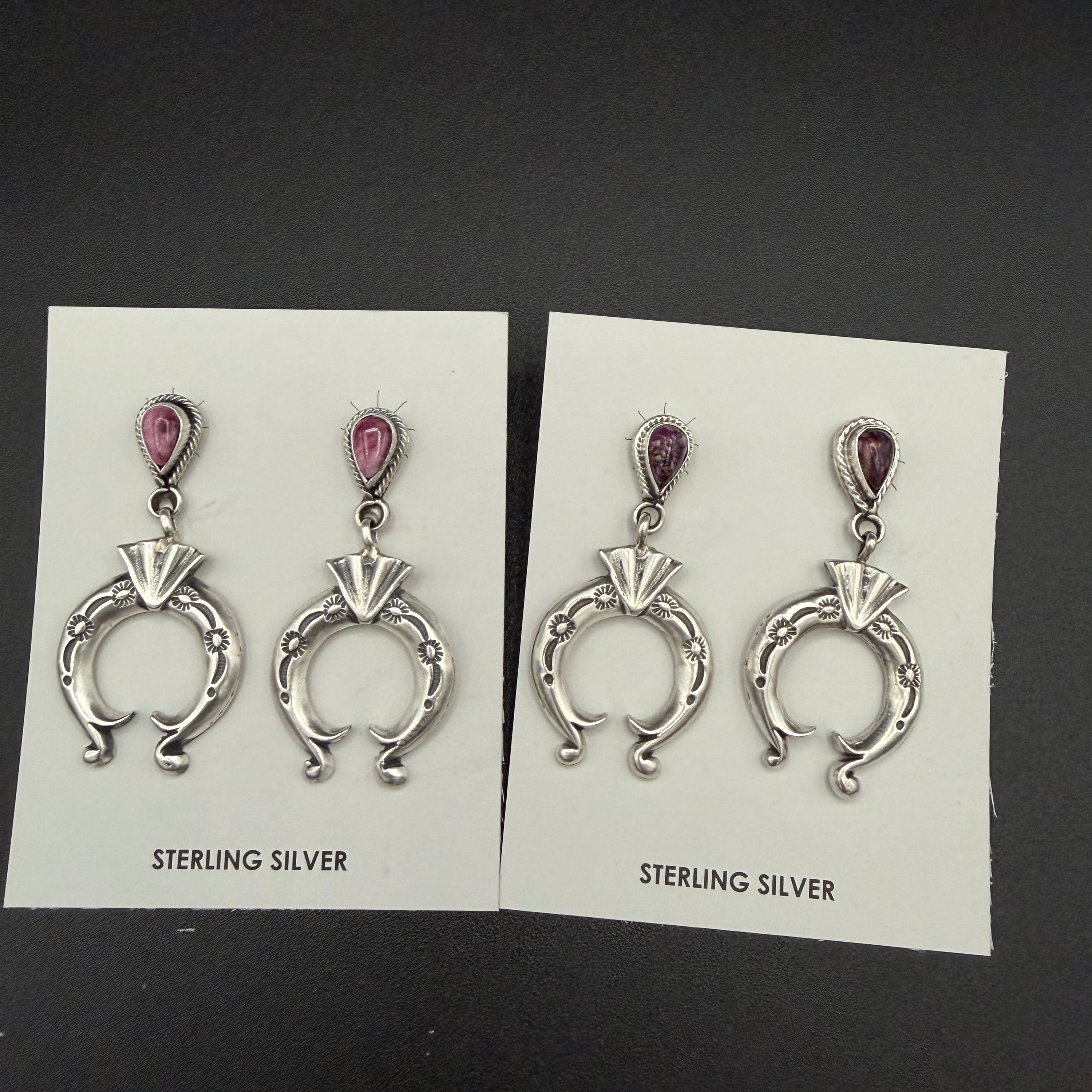 Classic Navajo design with a bold pop of color. These purple spiny oyster drop earrings by Verley Betone feature rich, naturally colored spiny oyster cabochons set in solid sterling silver, paired with traditional squash-inspired crescent drops.