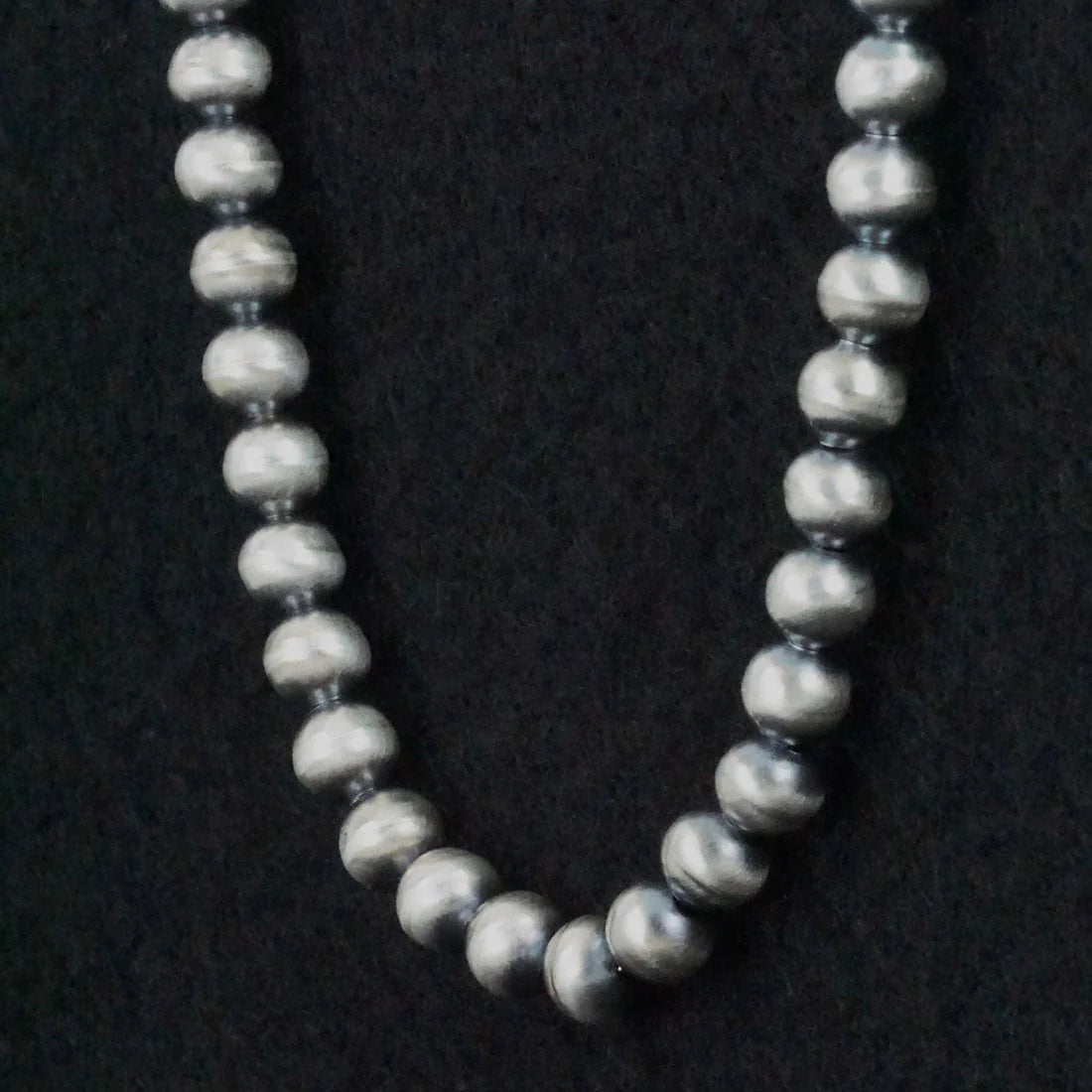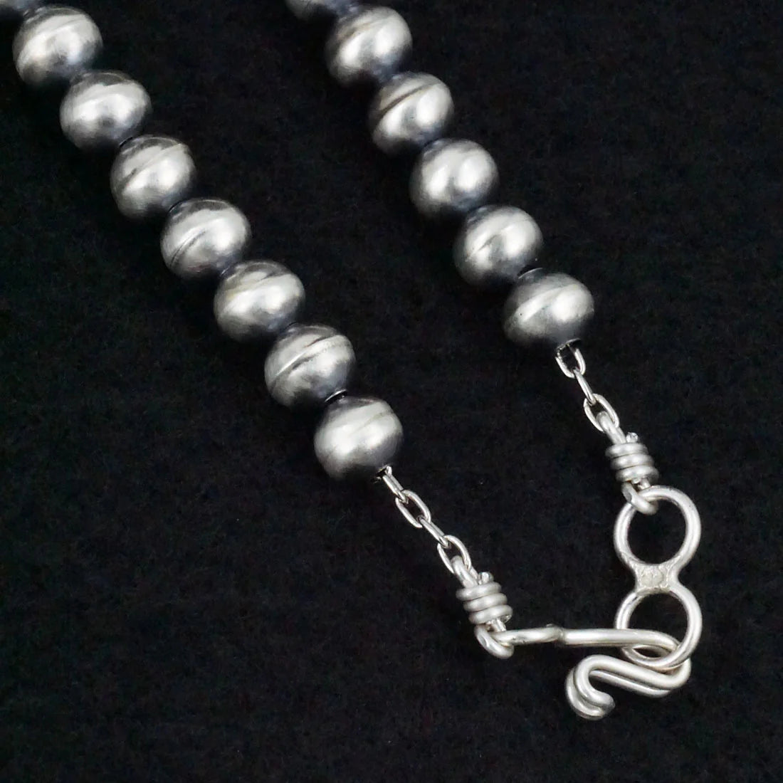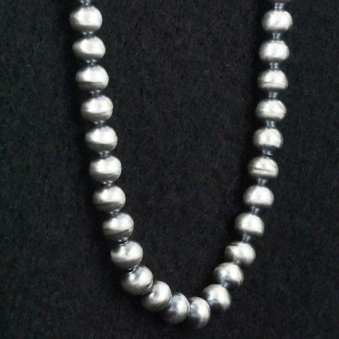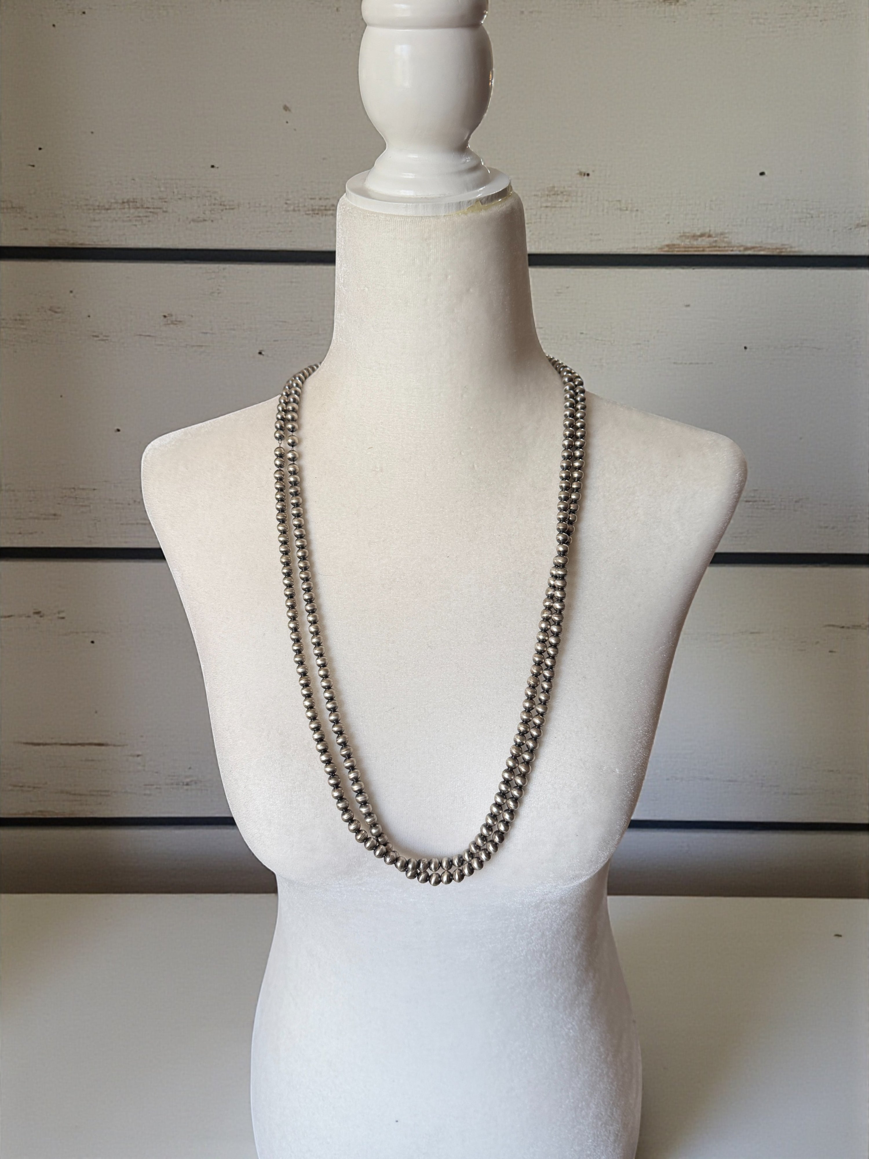 Handcrafted by Navajo silversmith Dorinda Mariano, this 60” sterling silver pearl necklace features classic 6mm (1/4”) beads and offers unmatched versatility.