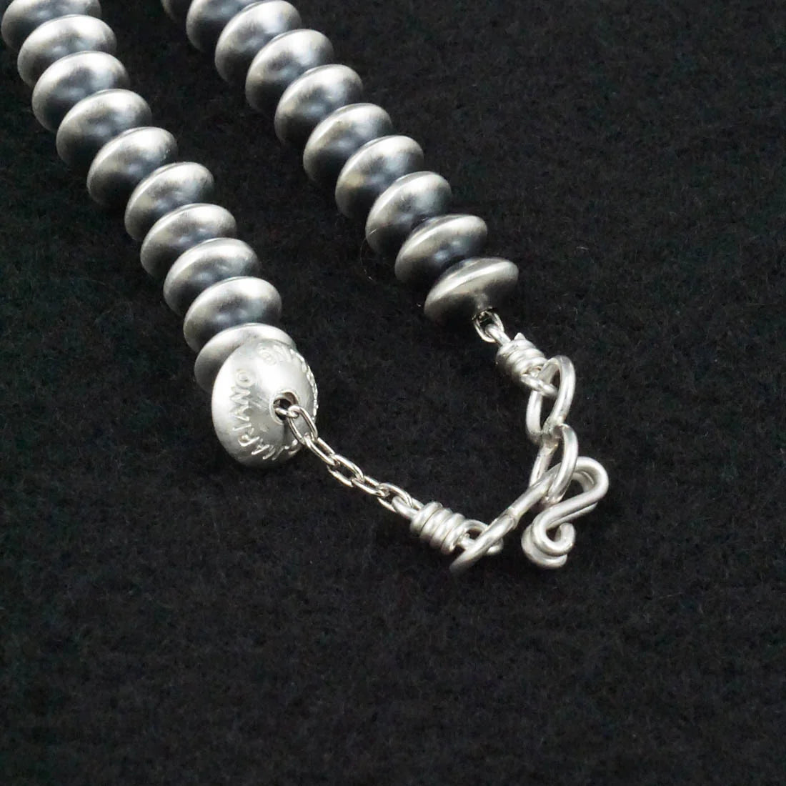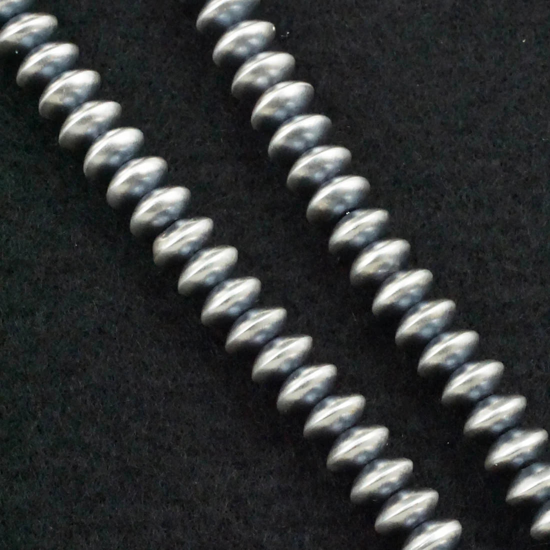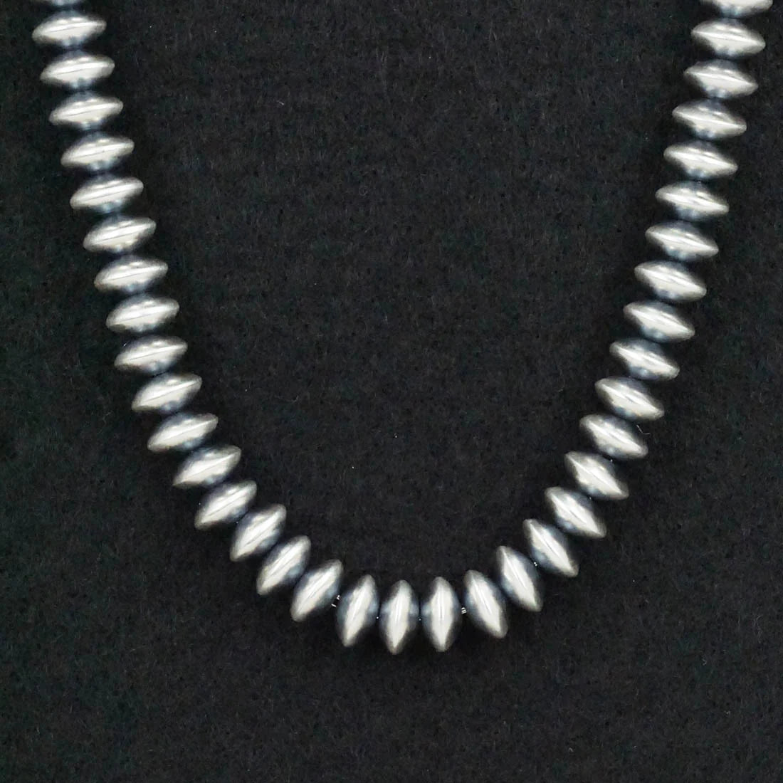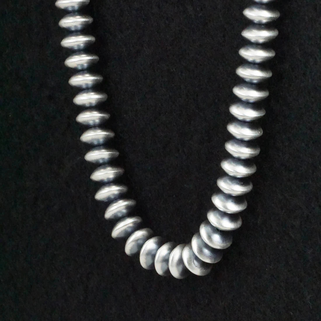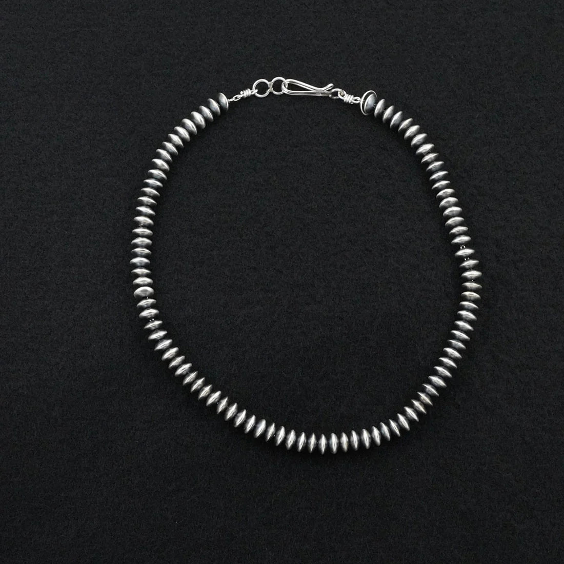 Handcrafted by Navajo silversmith Bryannen Halwood, this 14” sterling silver necklace features beautifully shaped pearls measuring approximately 1/8” x 1/4” (3.2mm x 6.4mm). The slightly elongated bead profile gives this strand subtle movement and texture while still keeping that clean, classic Navajo pearl aesthetic.