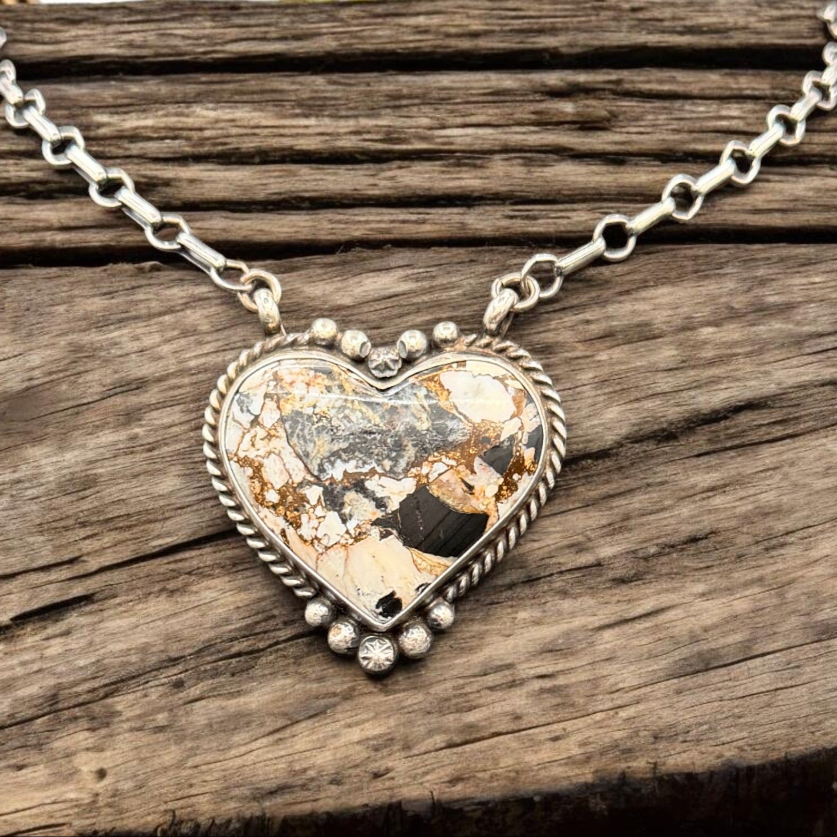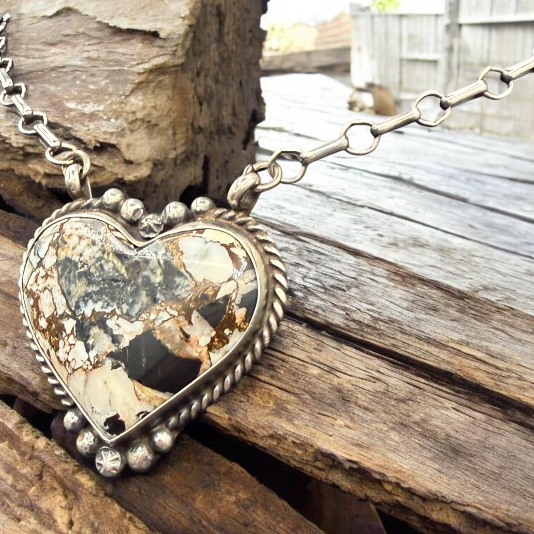 This striking heart necklace features genuine White Buffalo stone set in solid sterling silver, handcrafted with bold presence and unmistakable character. The heart centerpiece has a raw, organic silhouette that lets the natural matrix of the stone do the talking—no two are ever alike, and that’s the whole point.