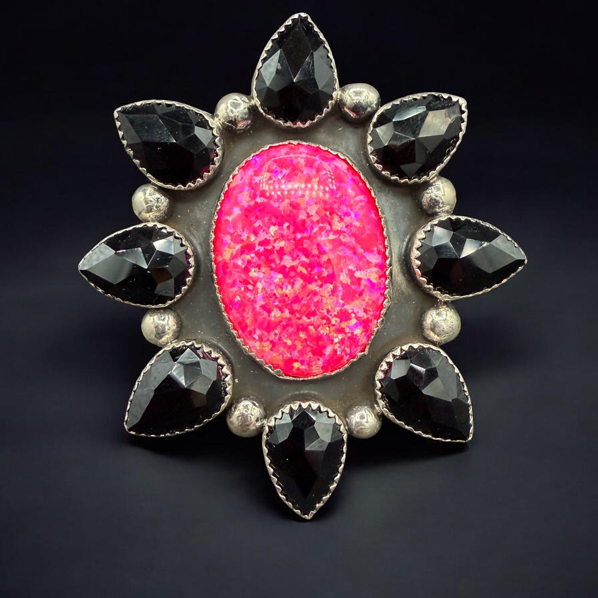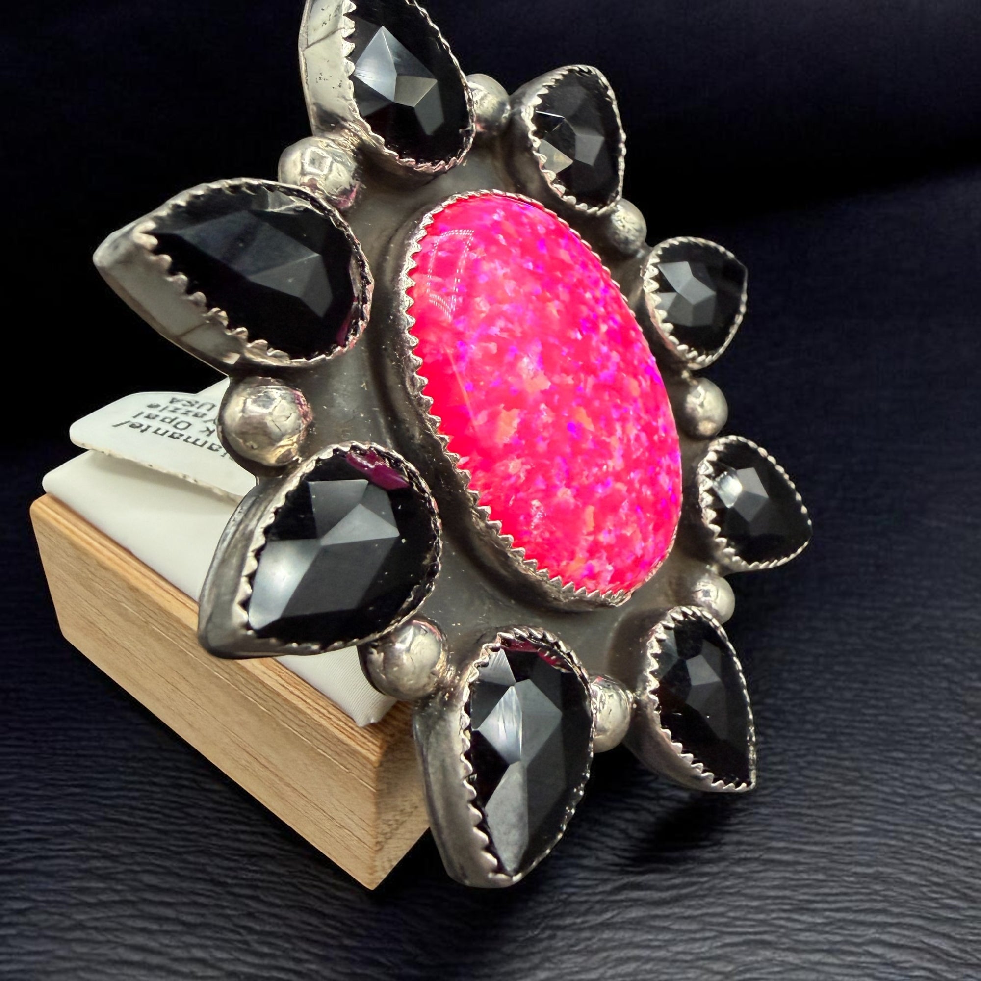 Handcrafted by Navajo silversmith Alberta Yazzie, this oversized statement ring features a large oval hot pink opal at the center, glowing with electric, candy-bright intensity. The opal is manmade and intentionally so, delivering that bold, high-saturation pink that refuses to be quiet. Surrounding it is a dramatic halo of faceted black diamante crystals, adding contrast, edge, and just the right amount of dark drama.