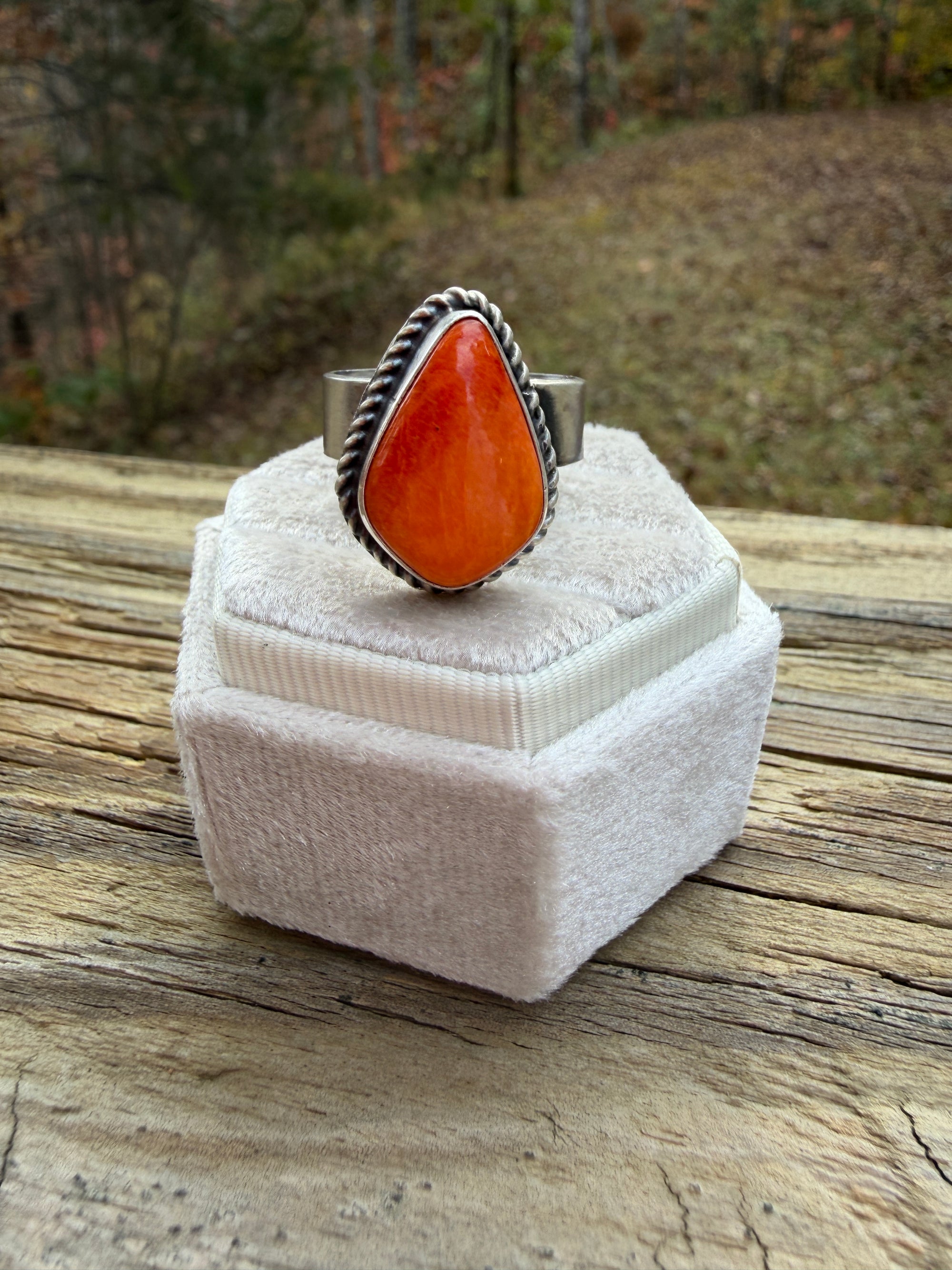 This radiant Orange Spiny Oyster Ring by Navajo silversmith Annette Martinez glows with warm desert tones and classic craftsmanship. The fiery, natural shell is cut into a bold teardrop shape and framed with a hand-twisted sterling silver rope border — a signature touch of Navajo artistry.