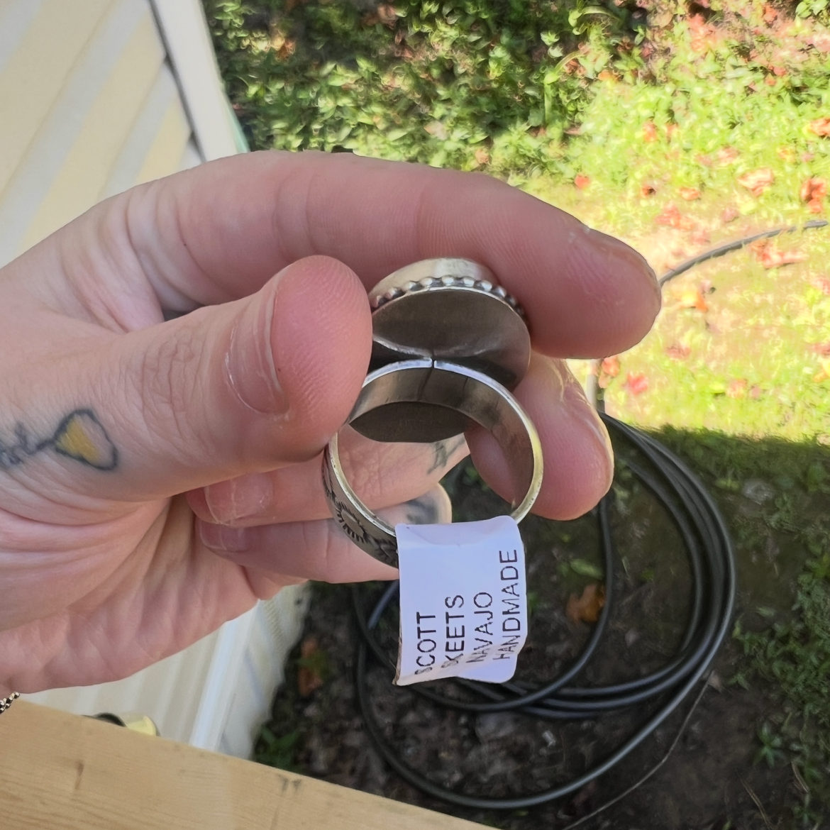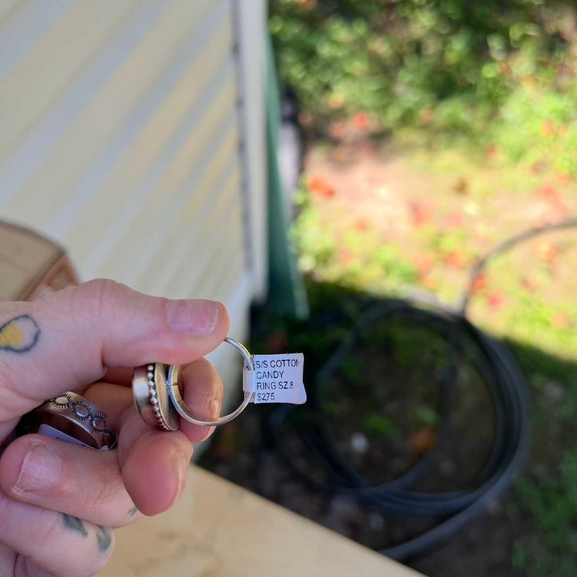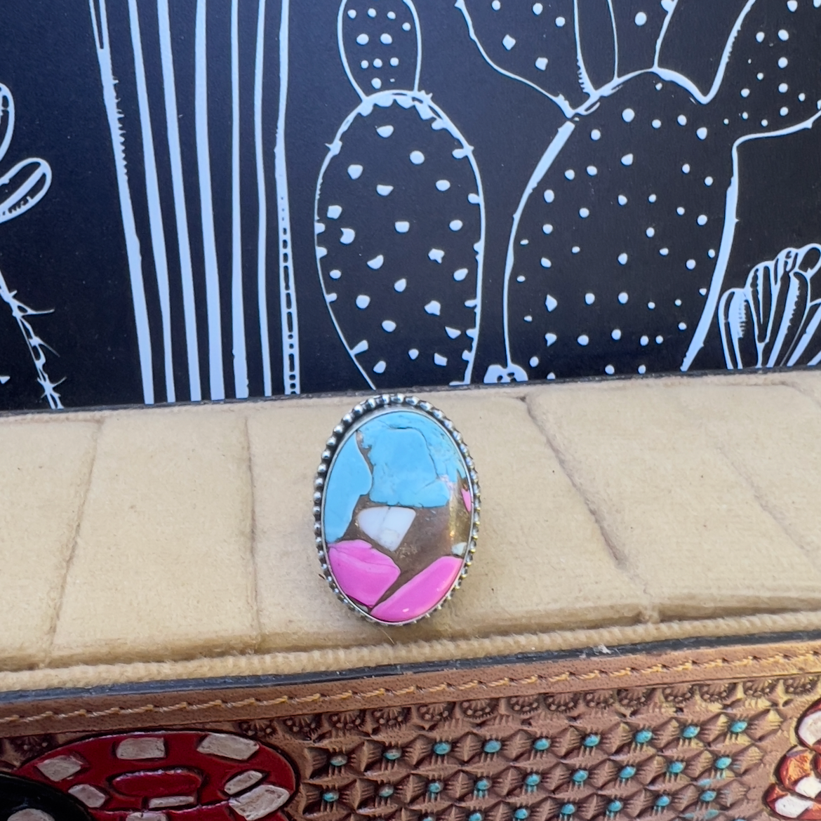 Sweet, punchy, and impossible to miss. Handcrafted by Scott Skeets (Navajo), these statement rings showcase an oval mosaic inlay of bright turquoise, bubble-gum pink, and creamy white, laced with warm metallic veining—aka that dreamy “cotton candy” palette. The stones are set into solid .925 sterling silver, framed with a classic raindrop bead border and finished with a comfortable split-shank band. A whopping 1.25" Stone will catch everyones eye!