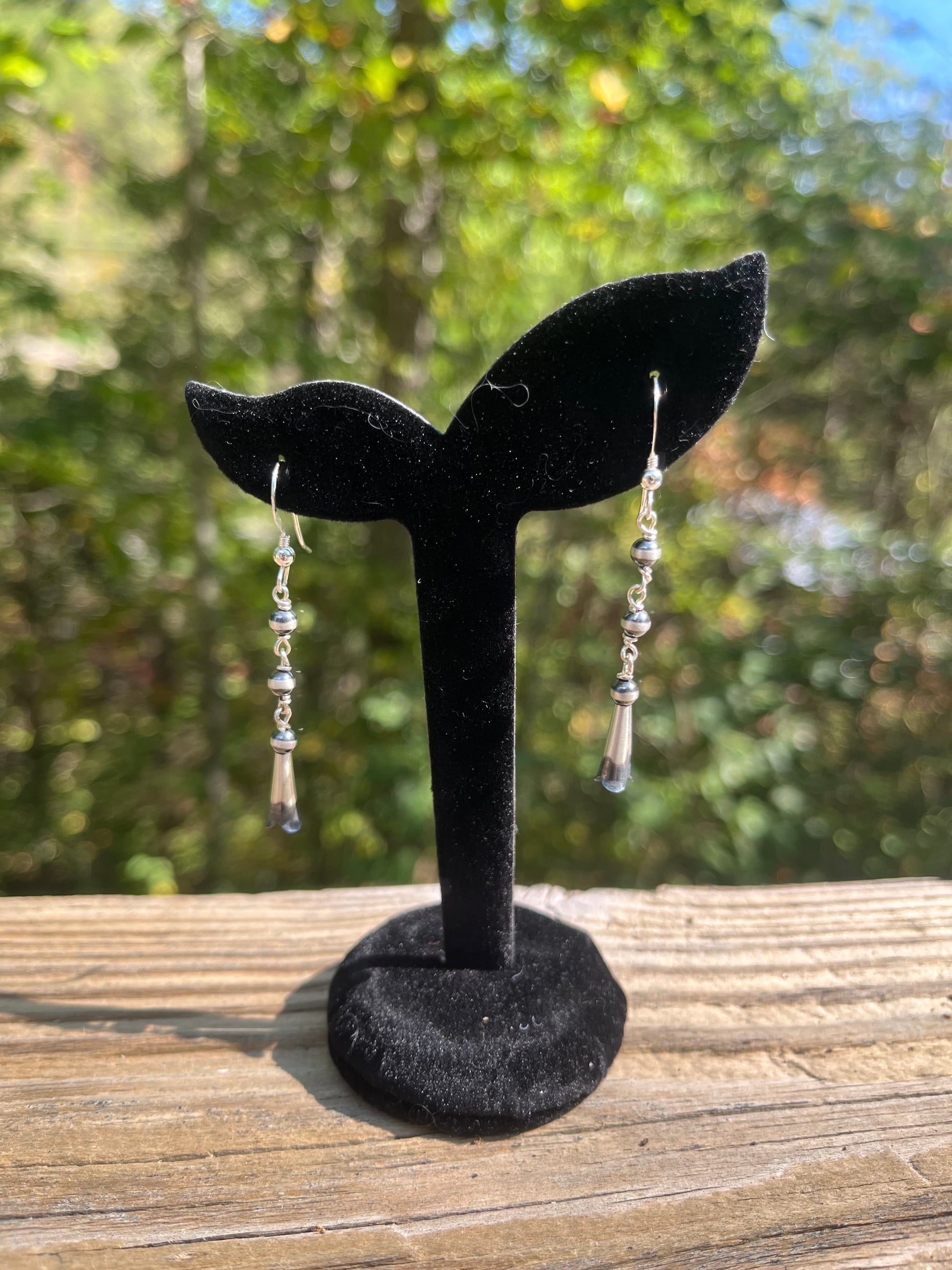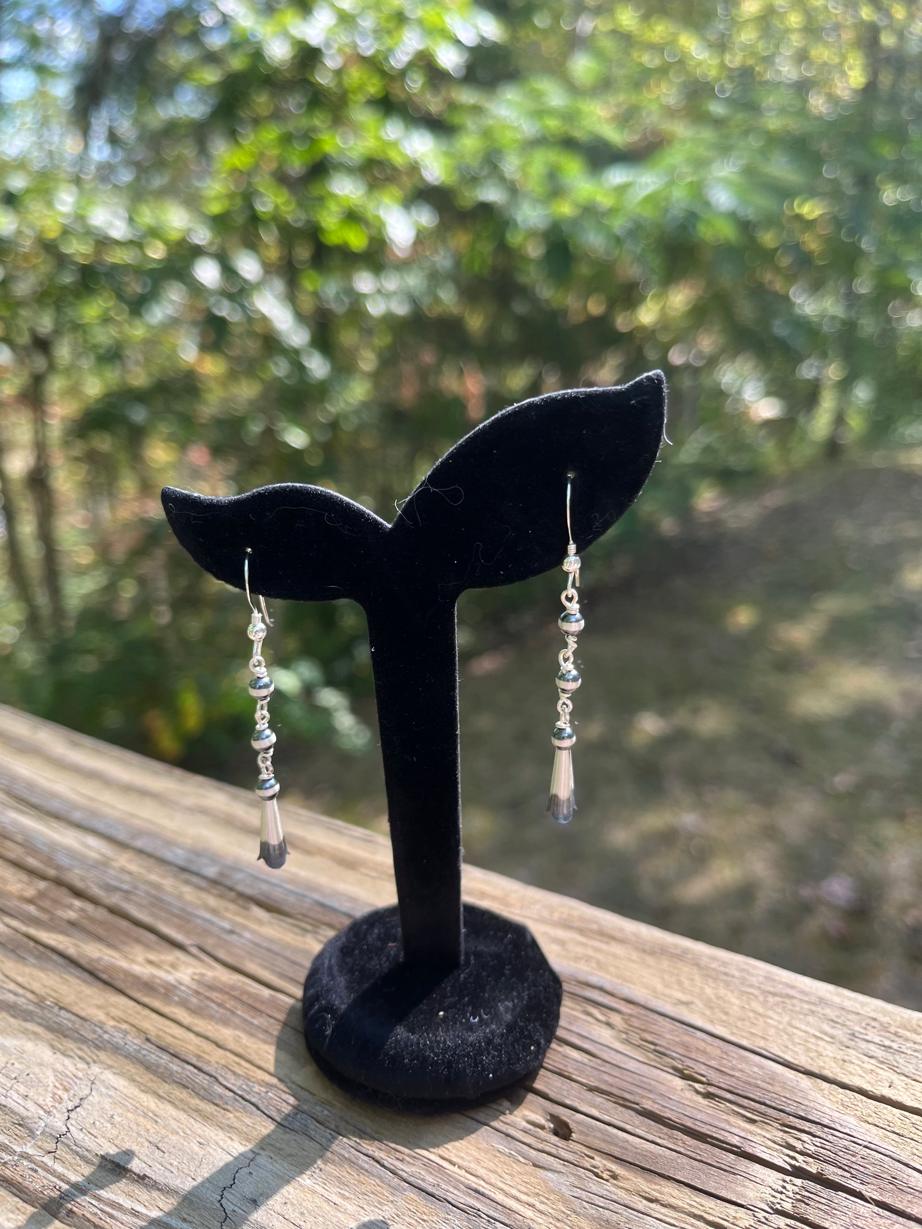 Slim, swingy, and oh-so Western. These hand-made dangles string petite sterling Navajo pearls down to tiny squash blossom cones for a graceful finish. Light as a whisper and perfect for everyday—from tees and boots to your Sunday best.