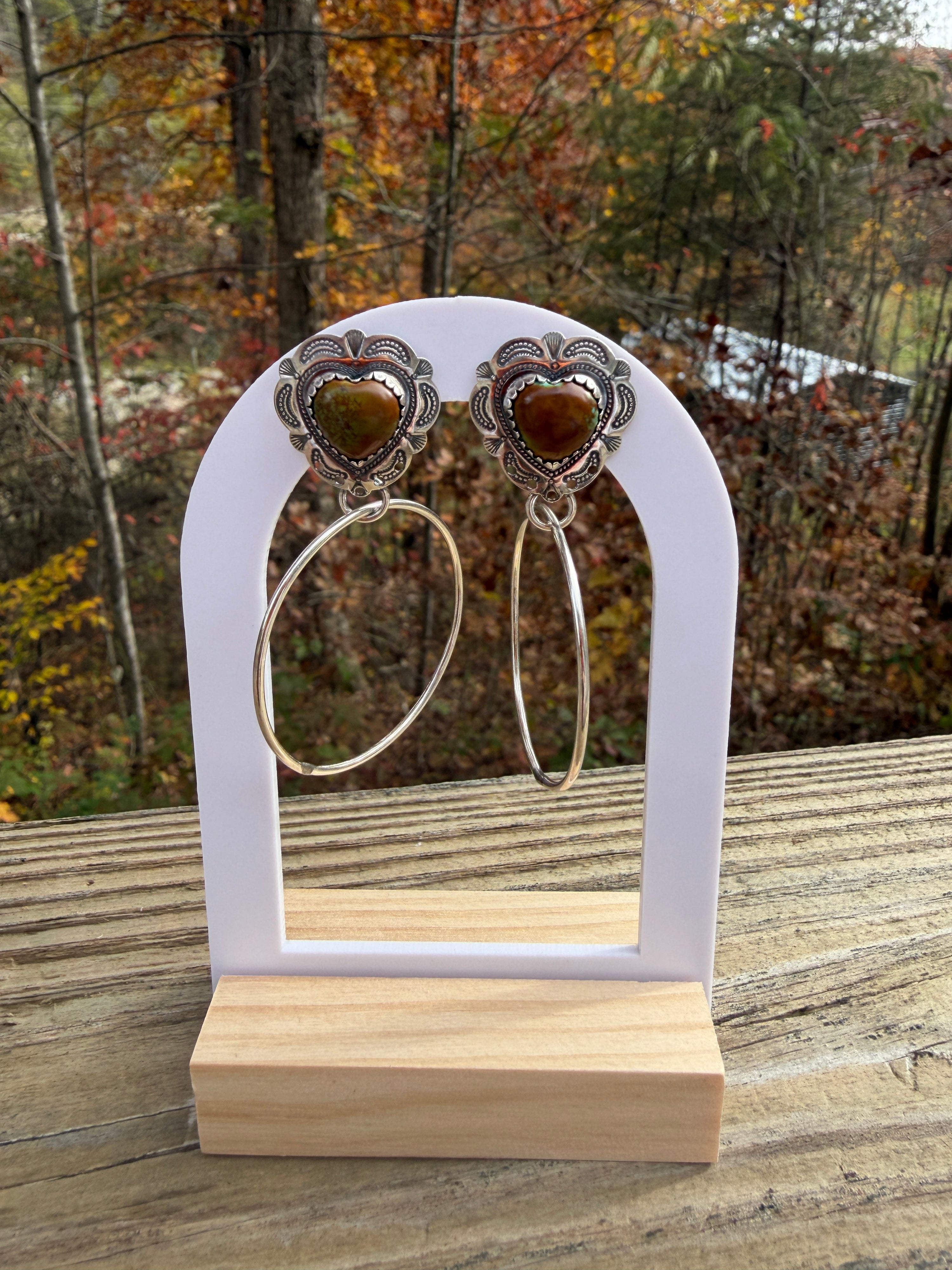These charming Royston turquoise heart hoops by Navajo silversmith Merle House blend romance with Western grit. Each earring features a warm green-brown Royston turquoise heart, framed in detailed sterling silver stamping and paired with sleek sterling hoops that bring the perfect amount of movement and shine.