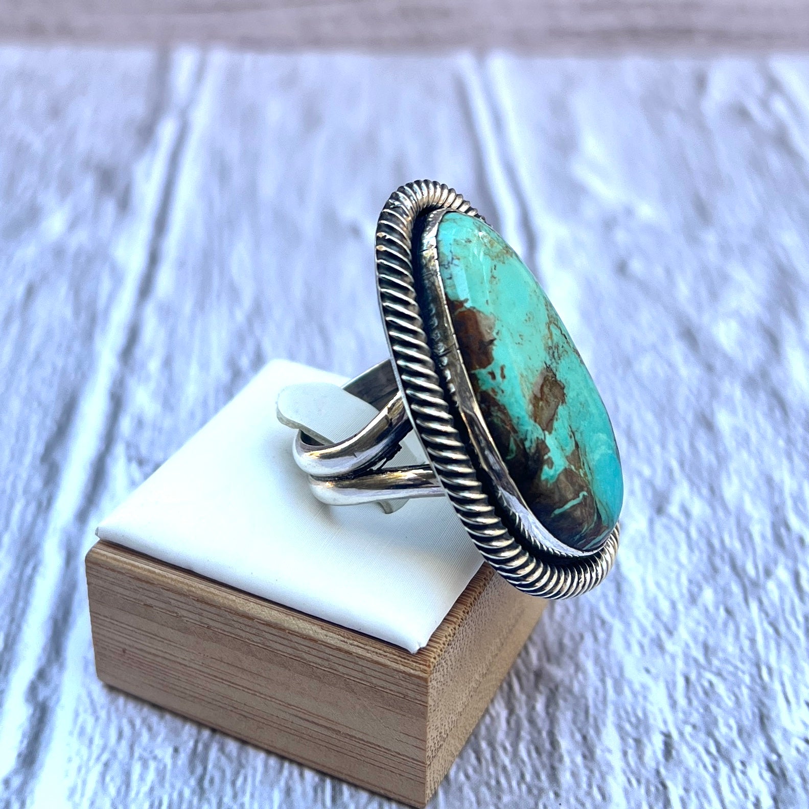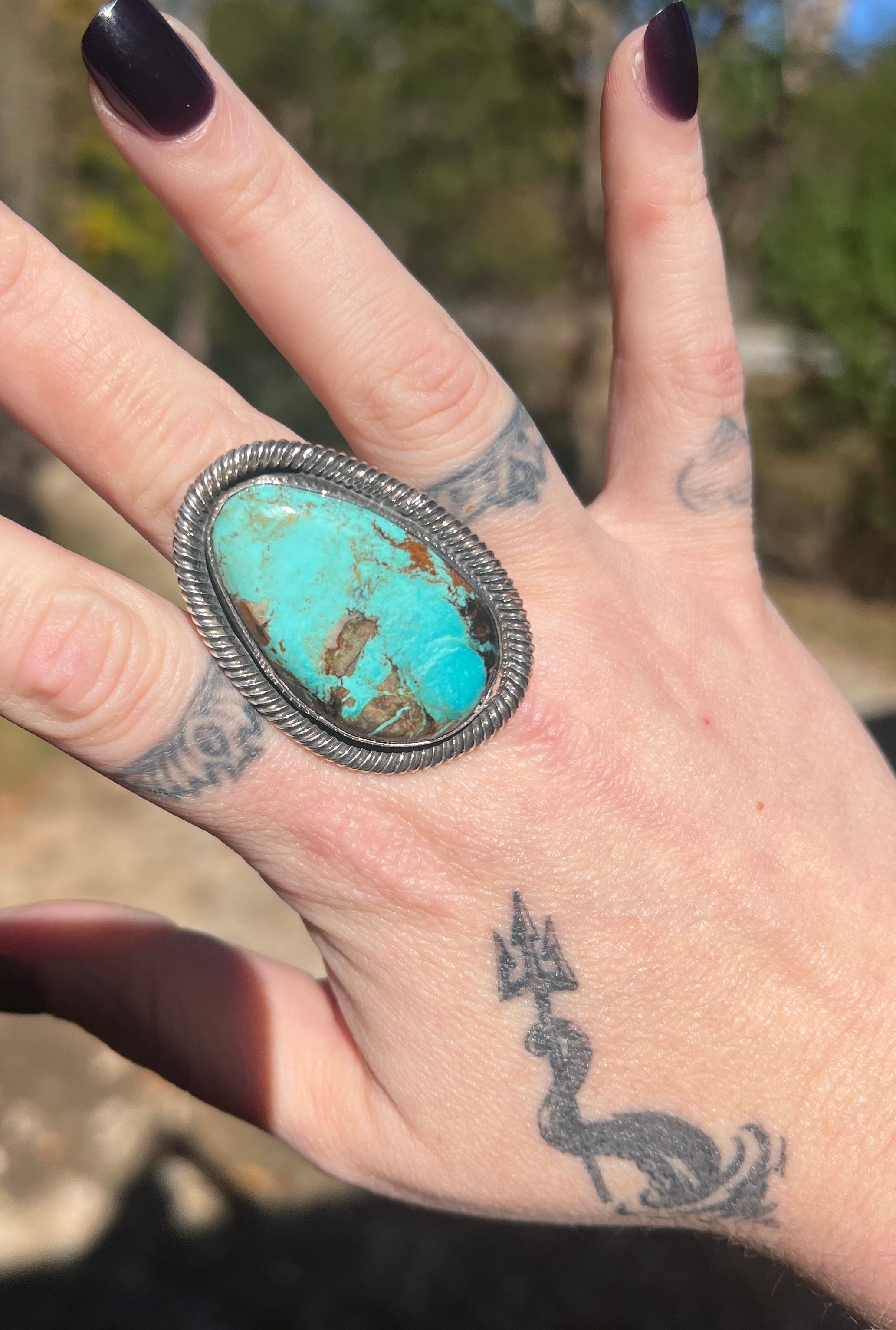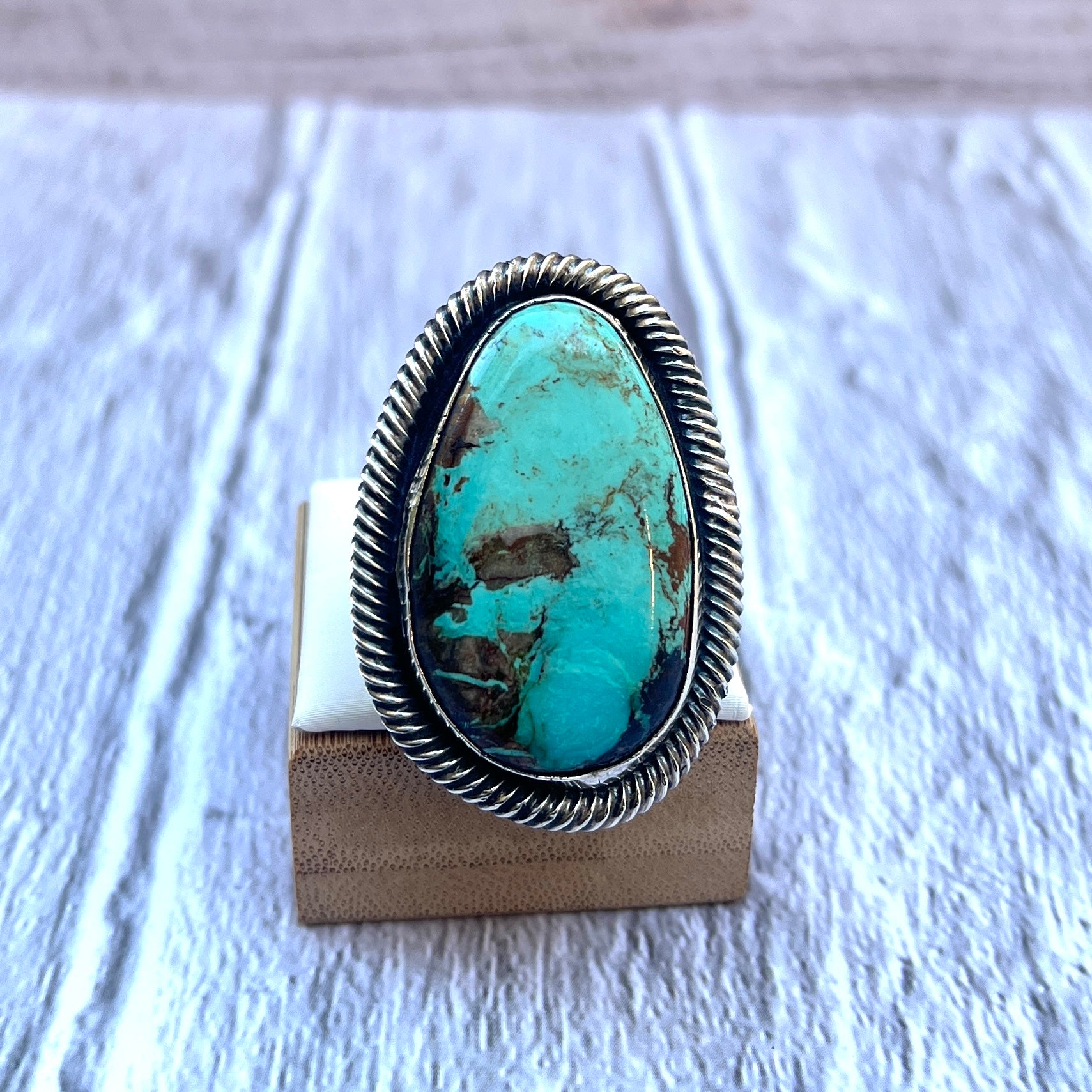 This bold statement ring by Chimney Butte showcases a striking natural turquoise stone full of warm matrix and vivid sky-blue color. The stone’s organic character is perfectly framed by Chimney Butte’s signature heavy twisted-rope sterling border, giving it a refined yet rugged Western edge.