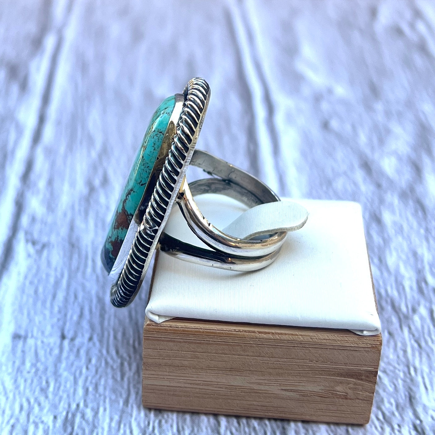 Measuring a full 2” from top to bottom, this piece commands attention — the kind of ring that tells its own story. Handcrafted in sterling silver with that unmistakable Santa Fe flair, it’s perfect for collectors and turquoise lovers alike.
