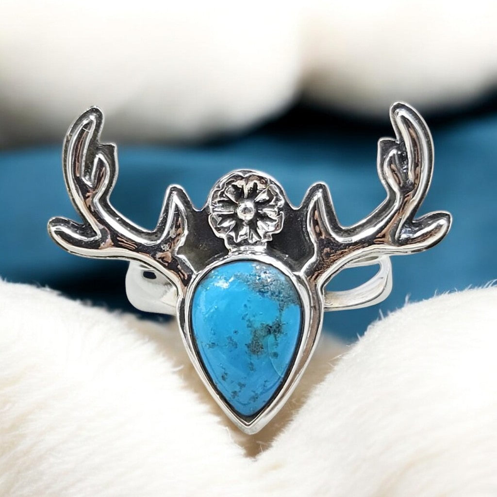 Wild-west whimsy you can wear. A teardrop of natural Kingman turquoise sits front and center beneath sculpted deer antlers and a sweet sterling rosette—bold, playful, and ready for rodeo nights or denim days. Set in solid .925 sterling silver with a smooth, comfortable band.