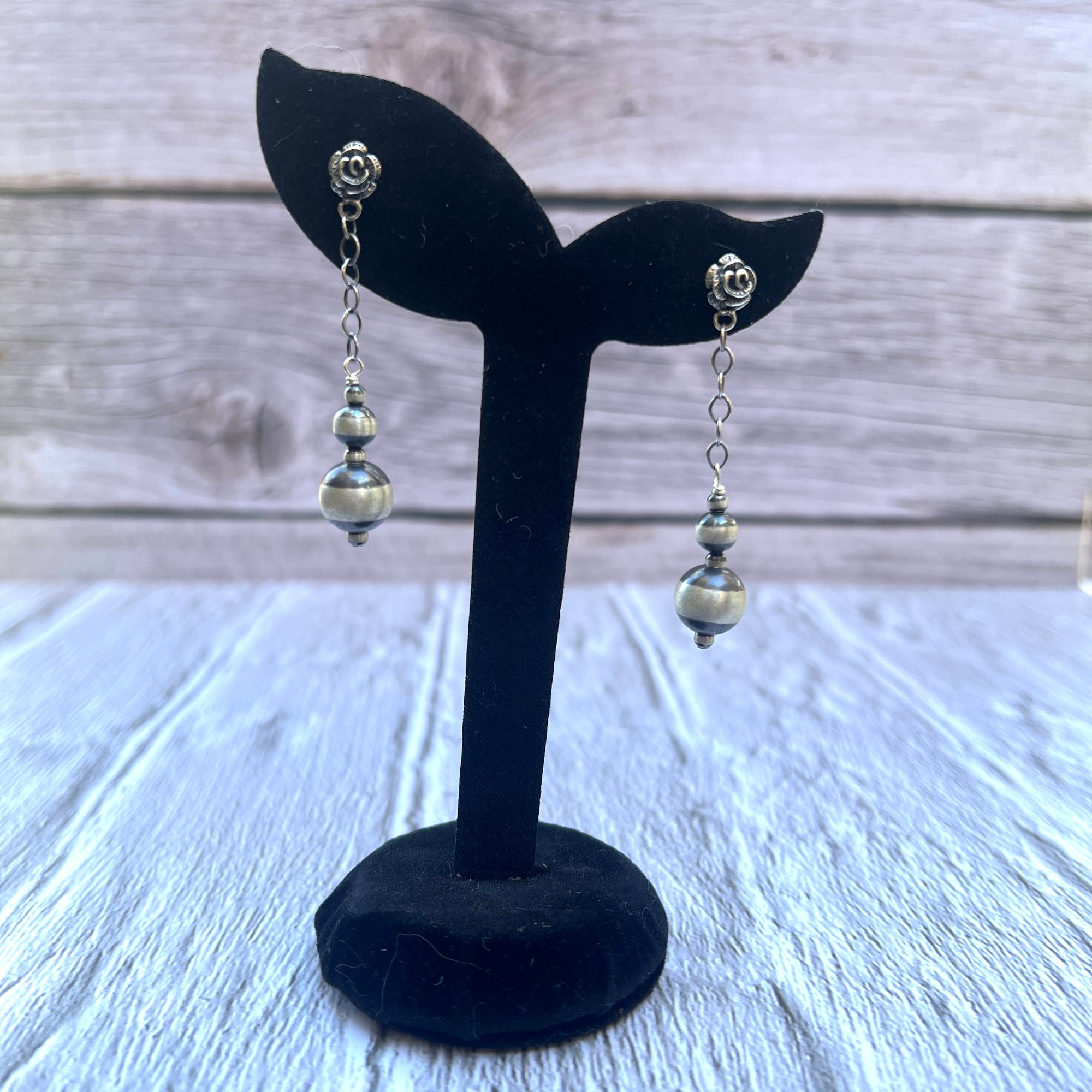 These handcrafted Navajo Pearl Dangle Earrings combine delicate Western romance with traditional silversmithing. Each earring features a sterling rose post that leads to a softly antiqued chain, finished with perfectly balanced oxidized Navajo pearls in graduating sizes.