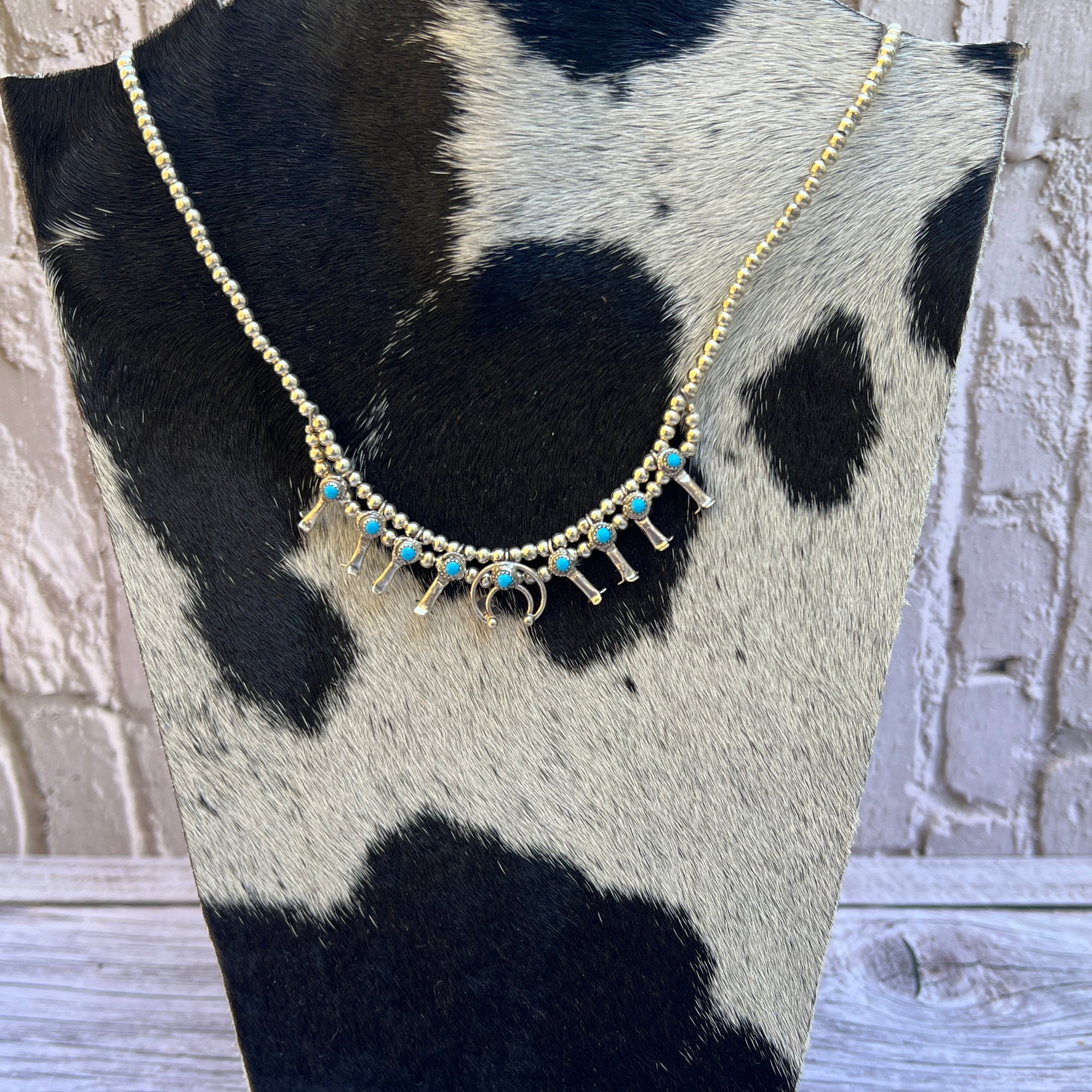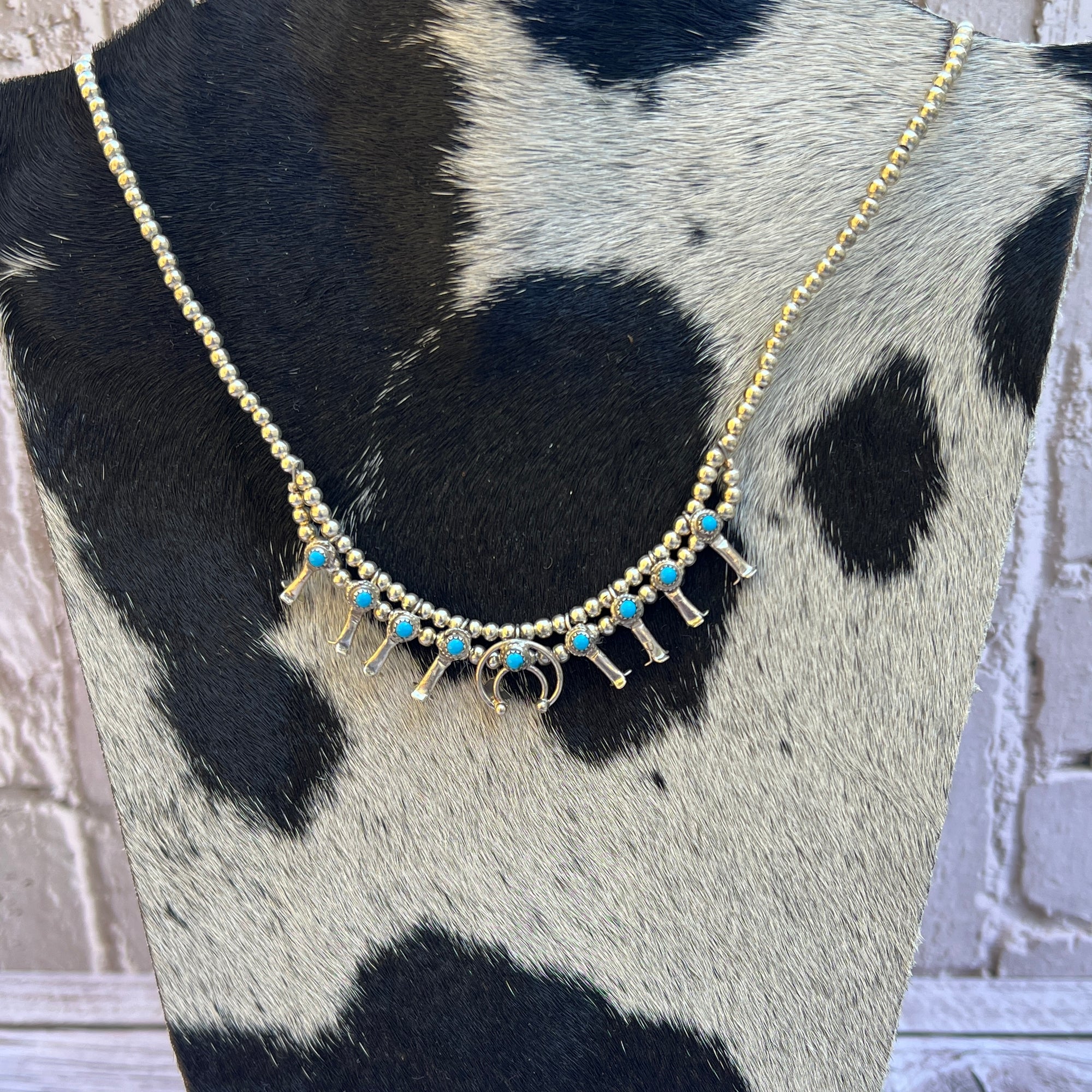 Mini Navajo Sleeping Beauty Turquoise Squash Blossom Necklace by Navajo artist Larry Curley